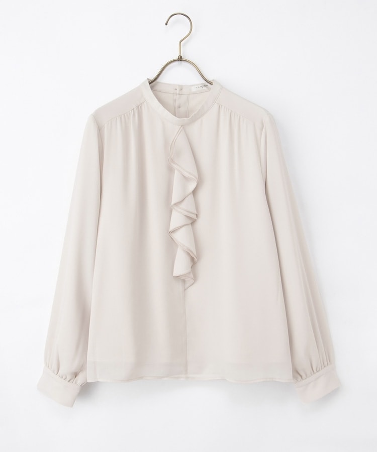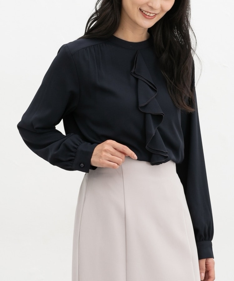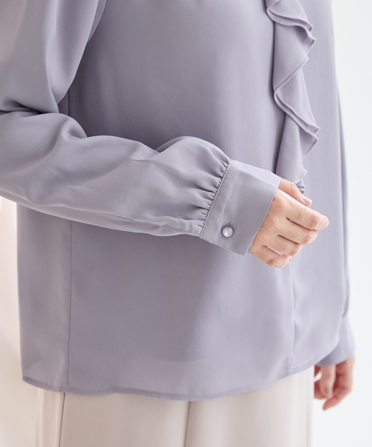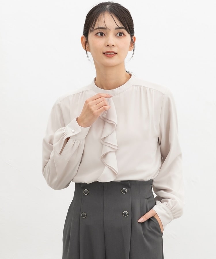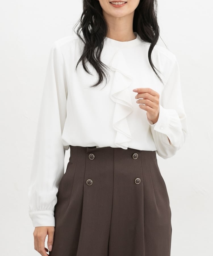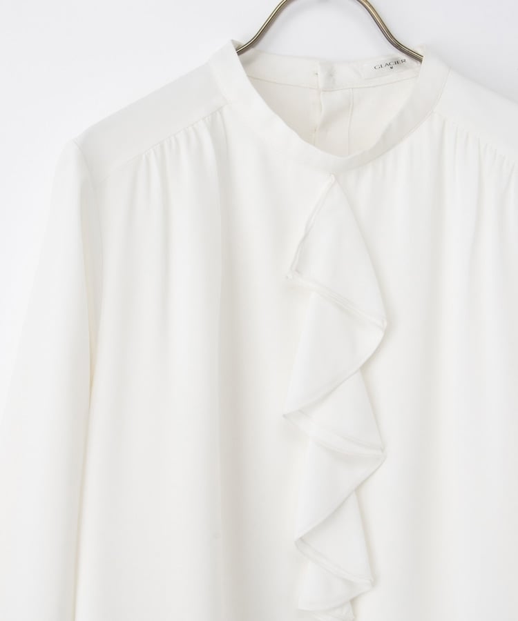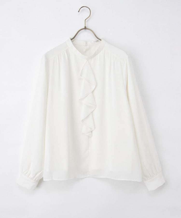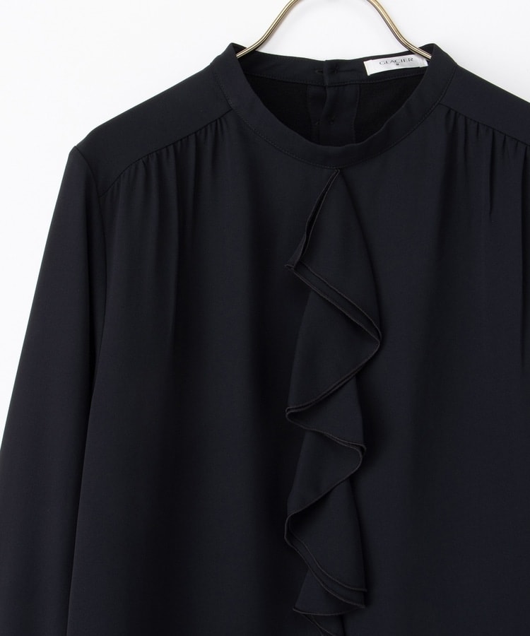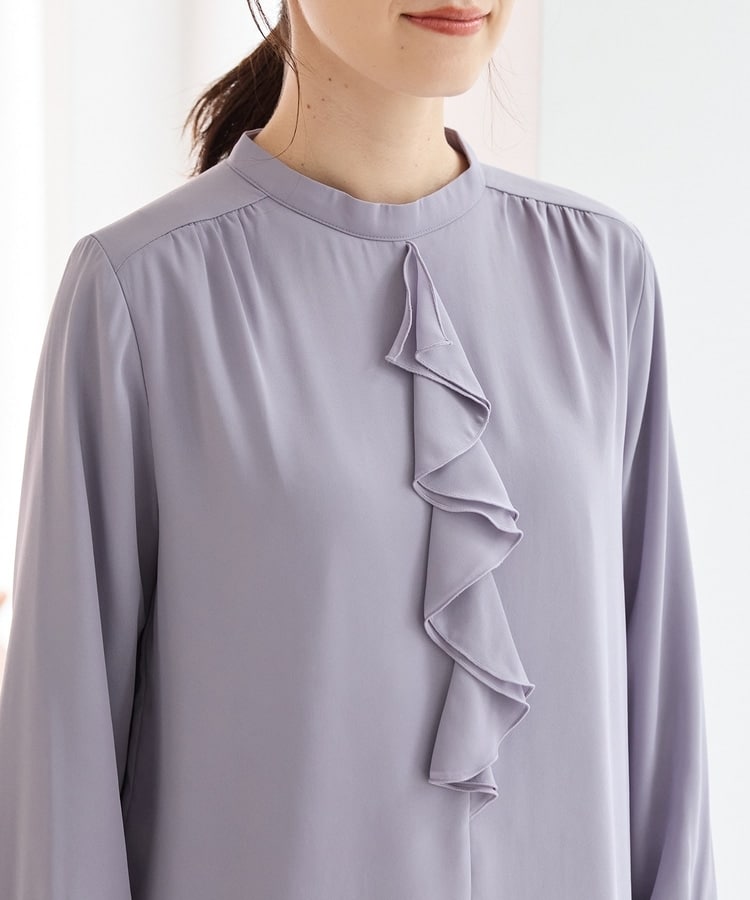 流れるようなドレープのラッフルフリルを、スタンドカラーで甘すぎない印象に仕上げた大人なデザイン。