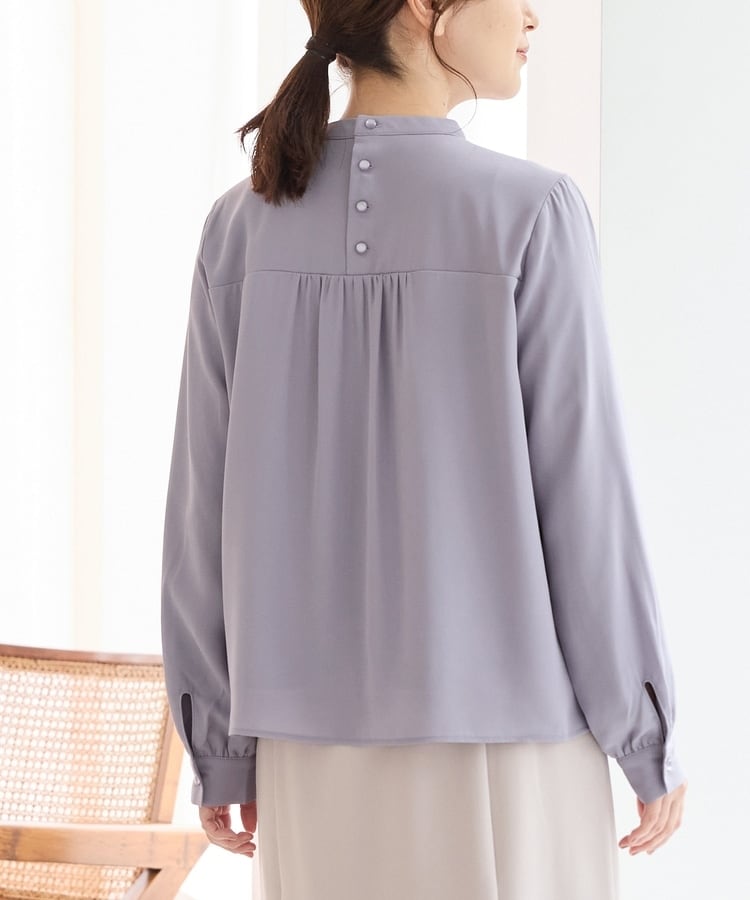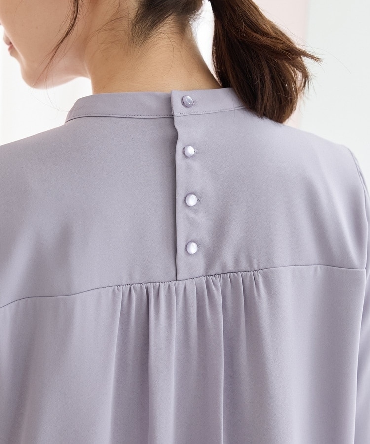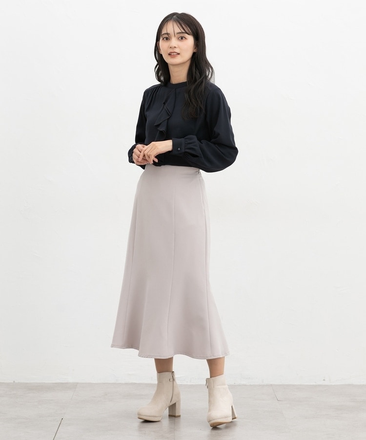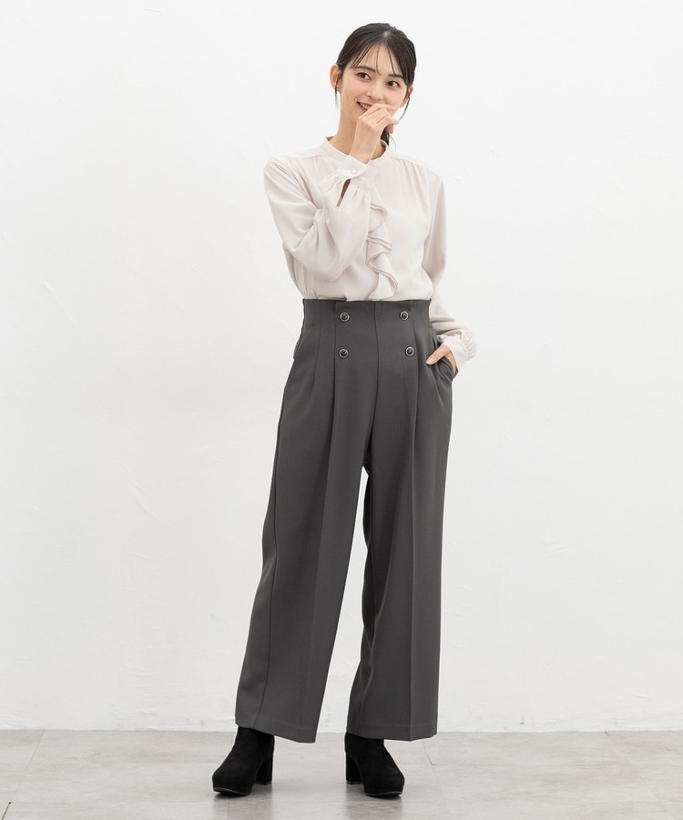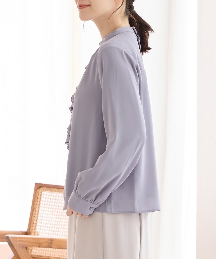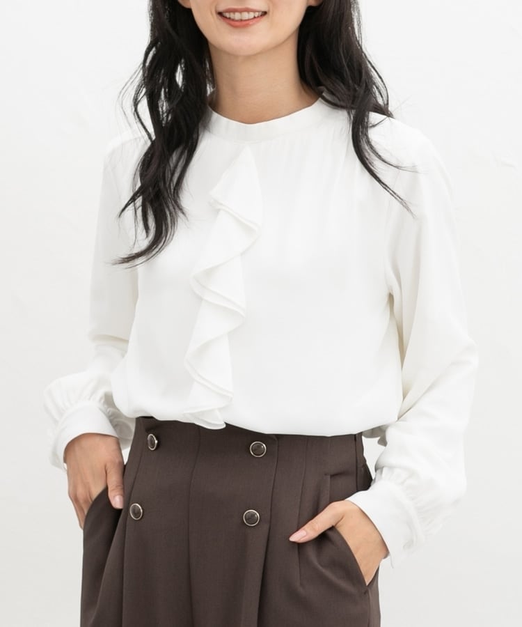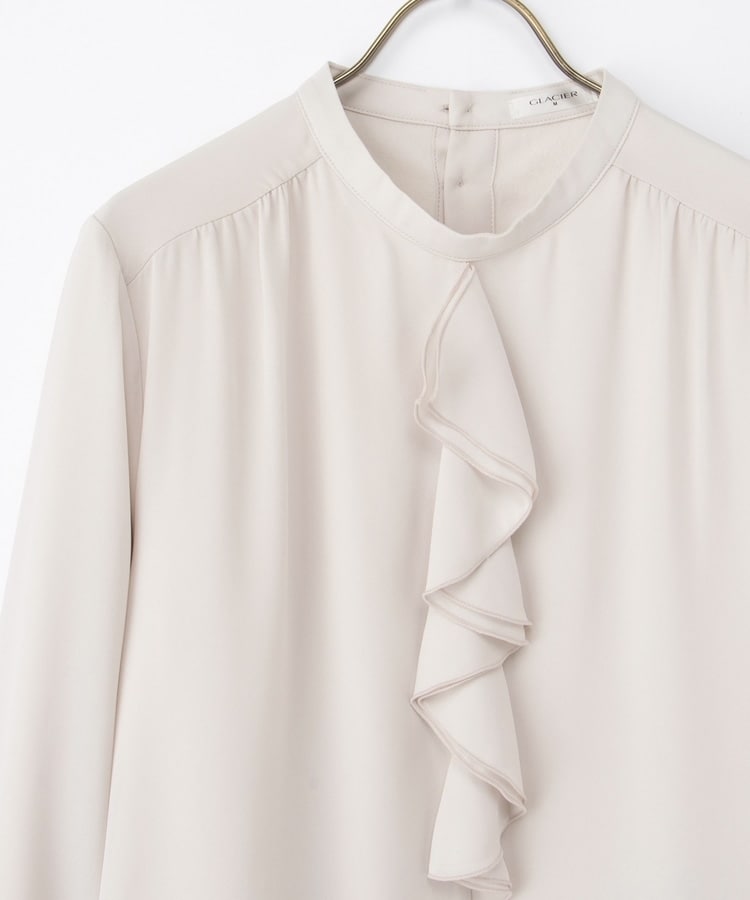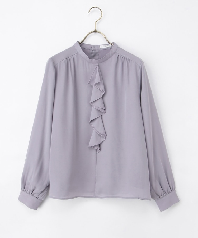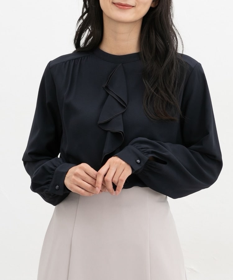 流れるようなドレープのラッフルフリルを、スタンドカラーで甘すぎない印象に仕上げた大人なデザイン。
