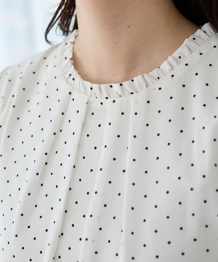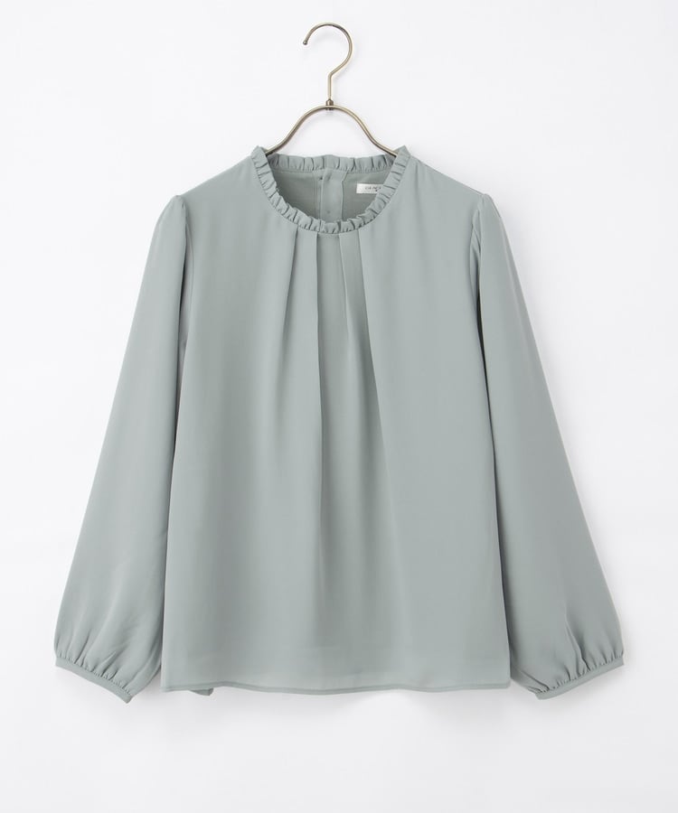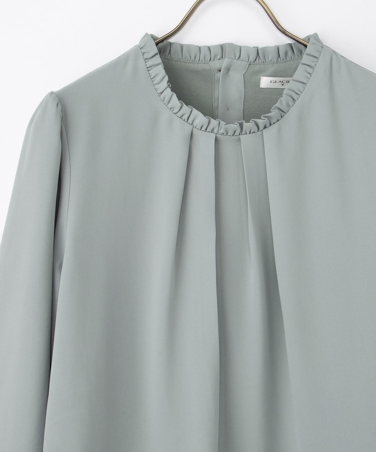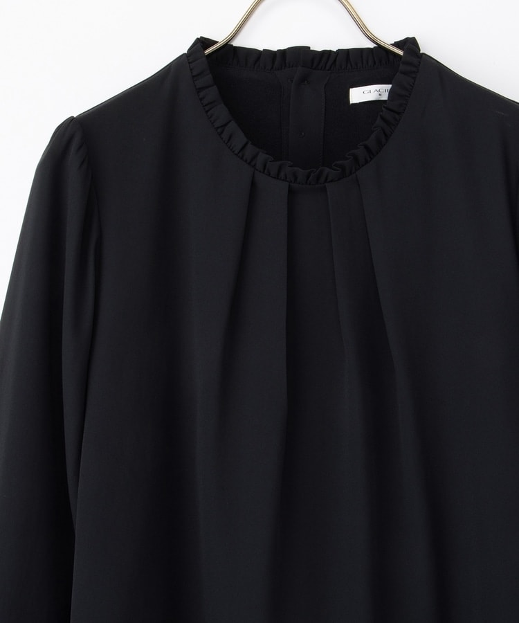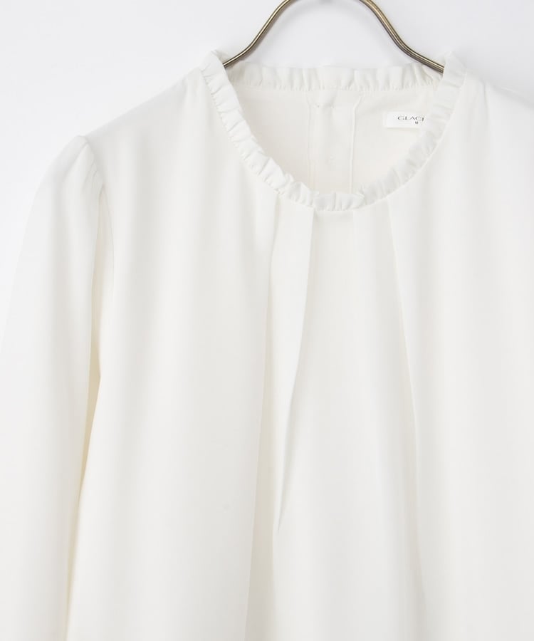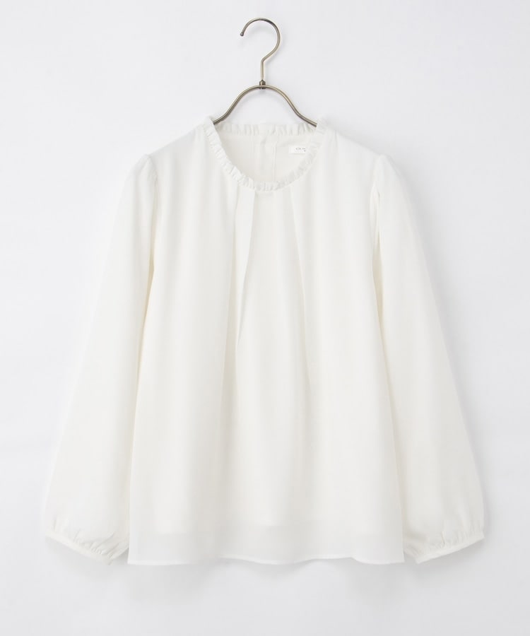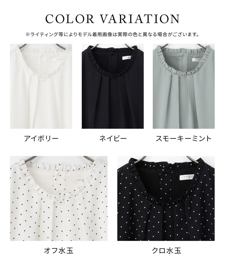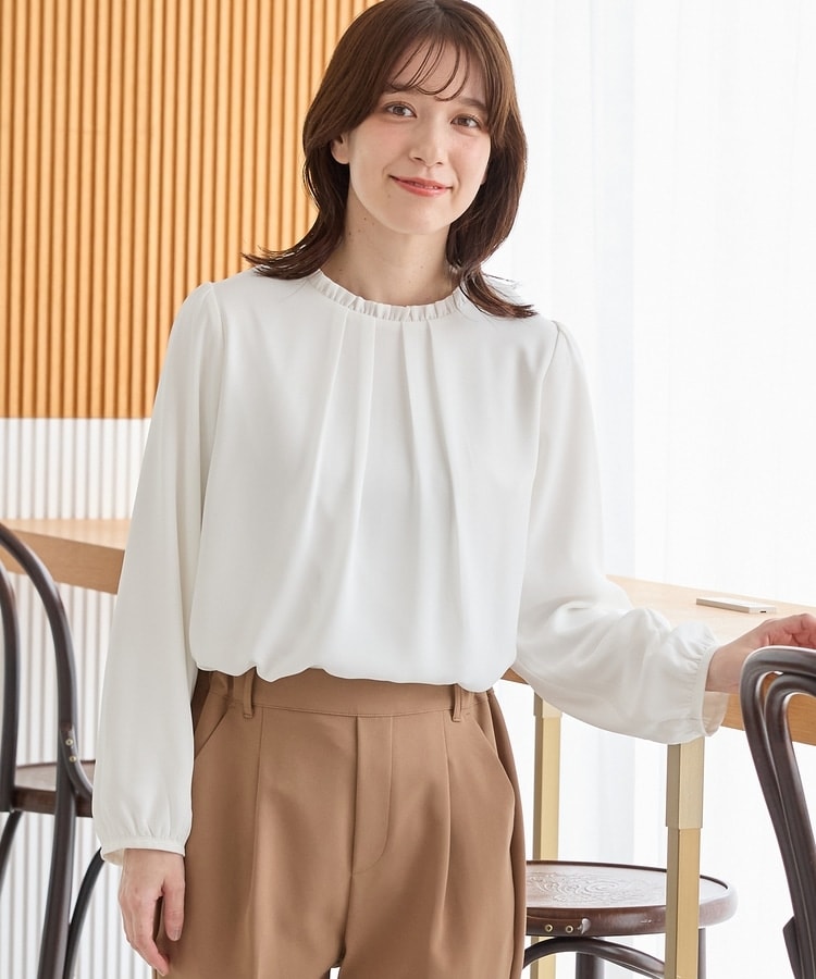 衿ぐりの控えめフリルが大人可愛いデザイン。