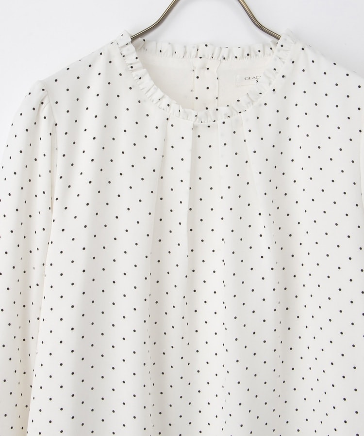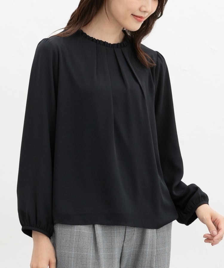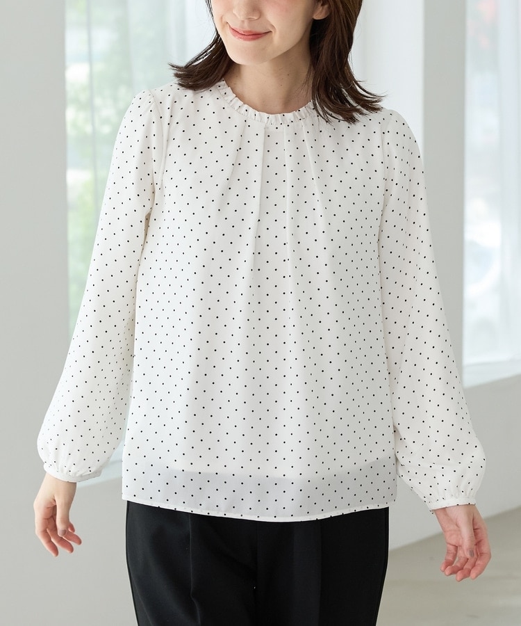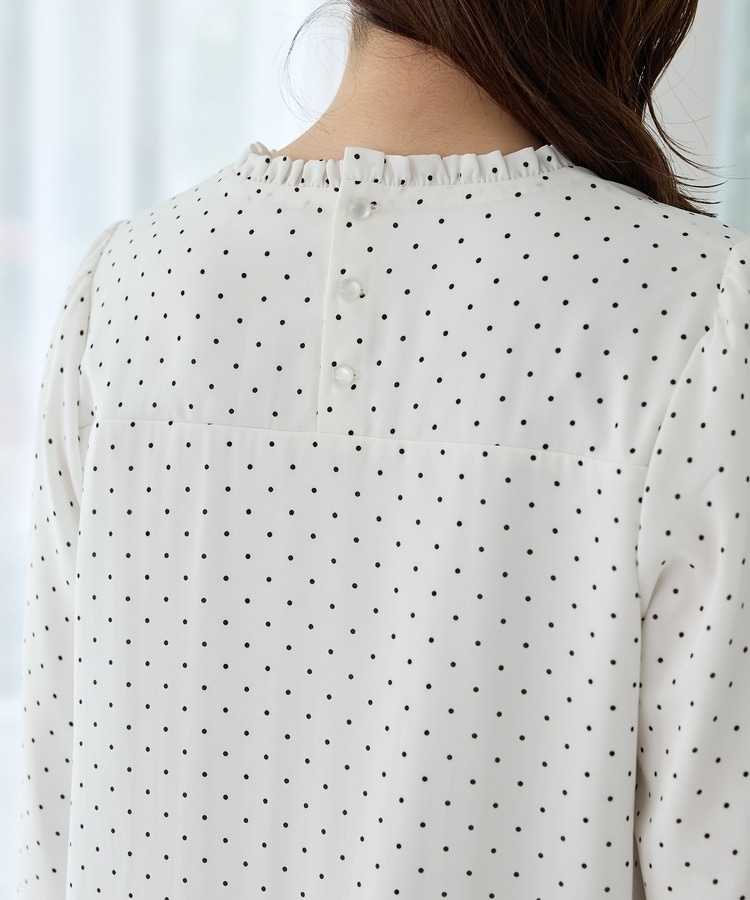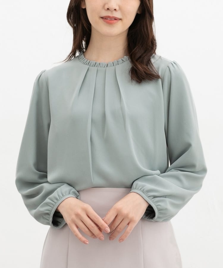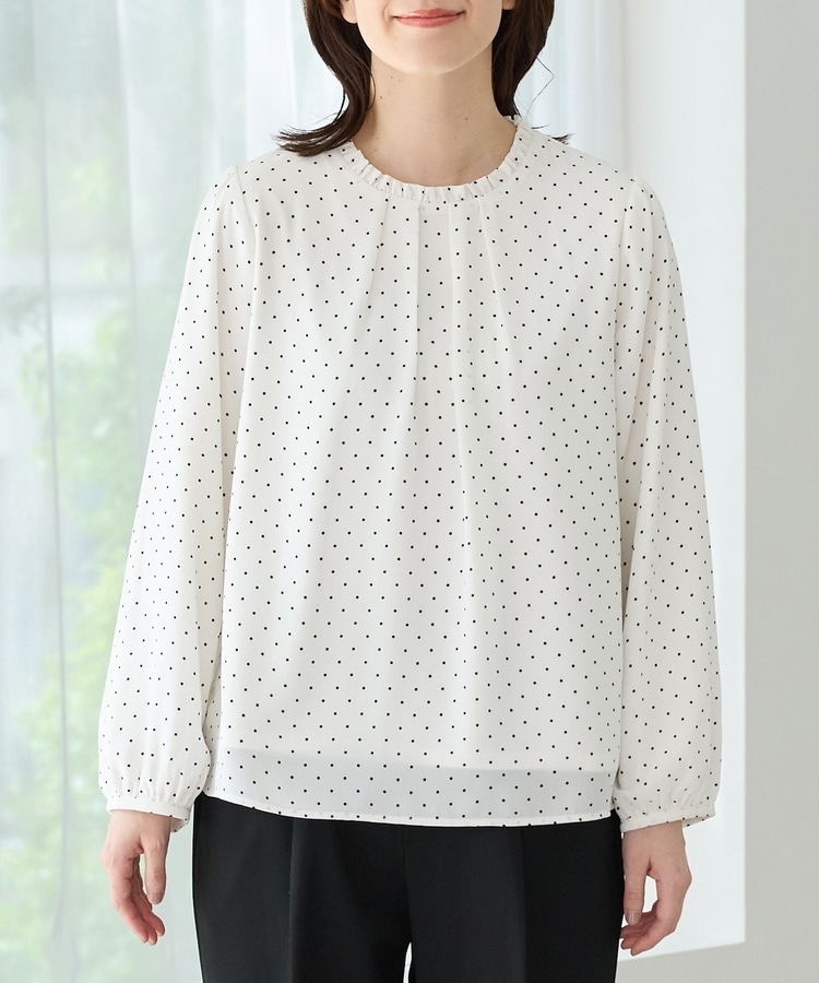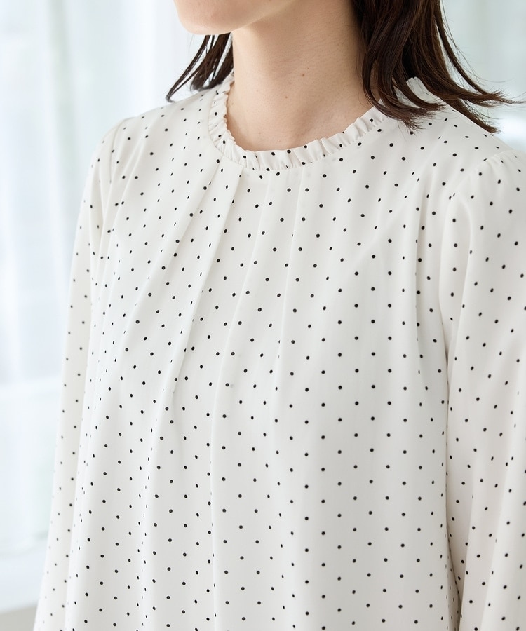衿ぐりの控えめフリルが大人可愛いデザイン。