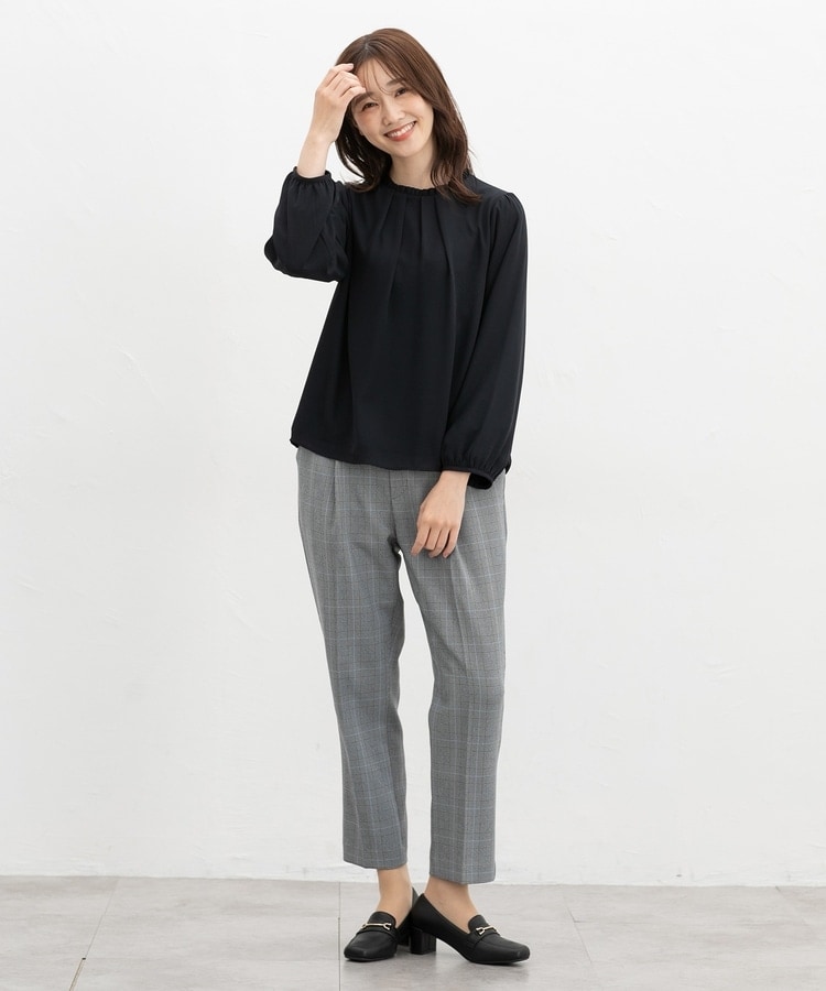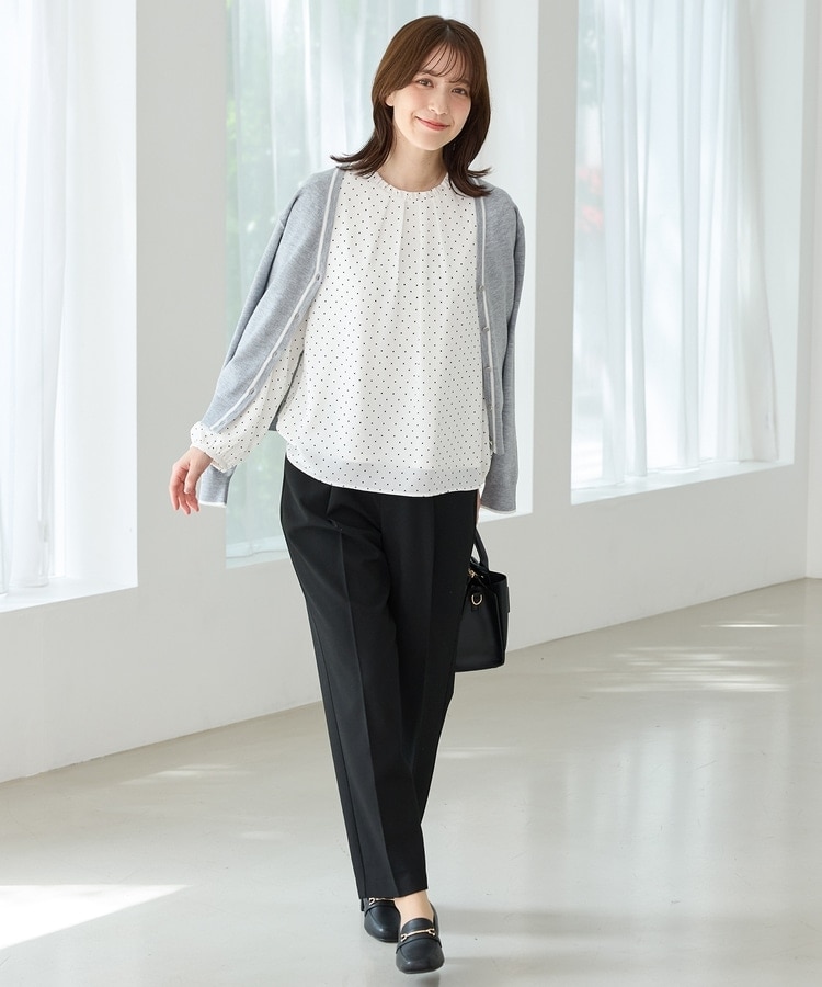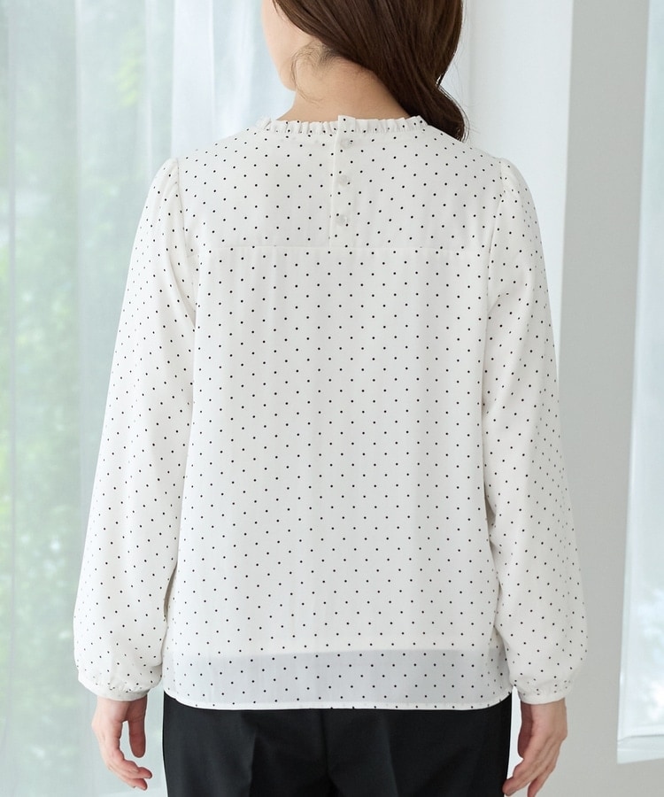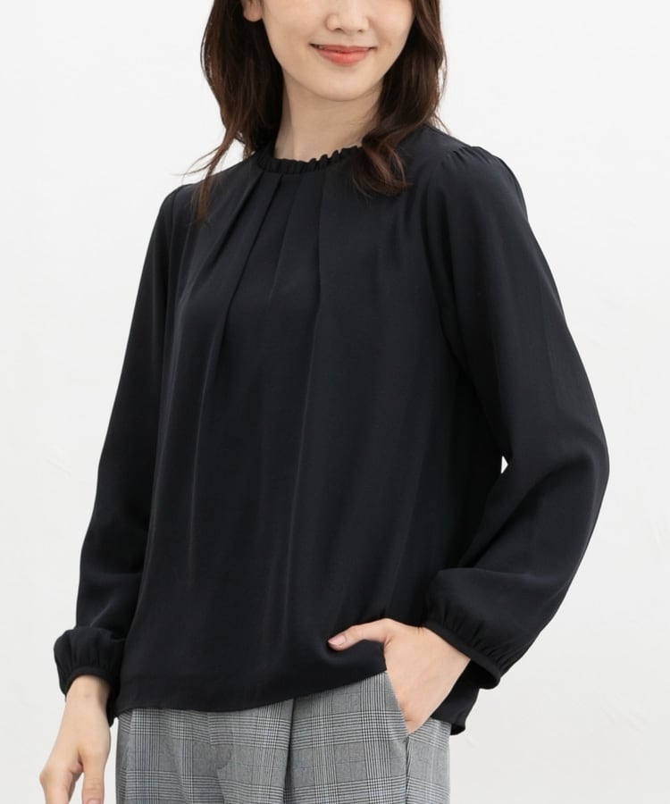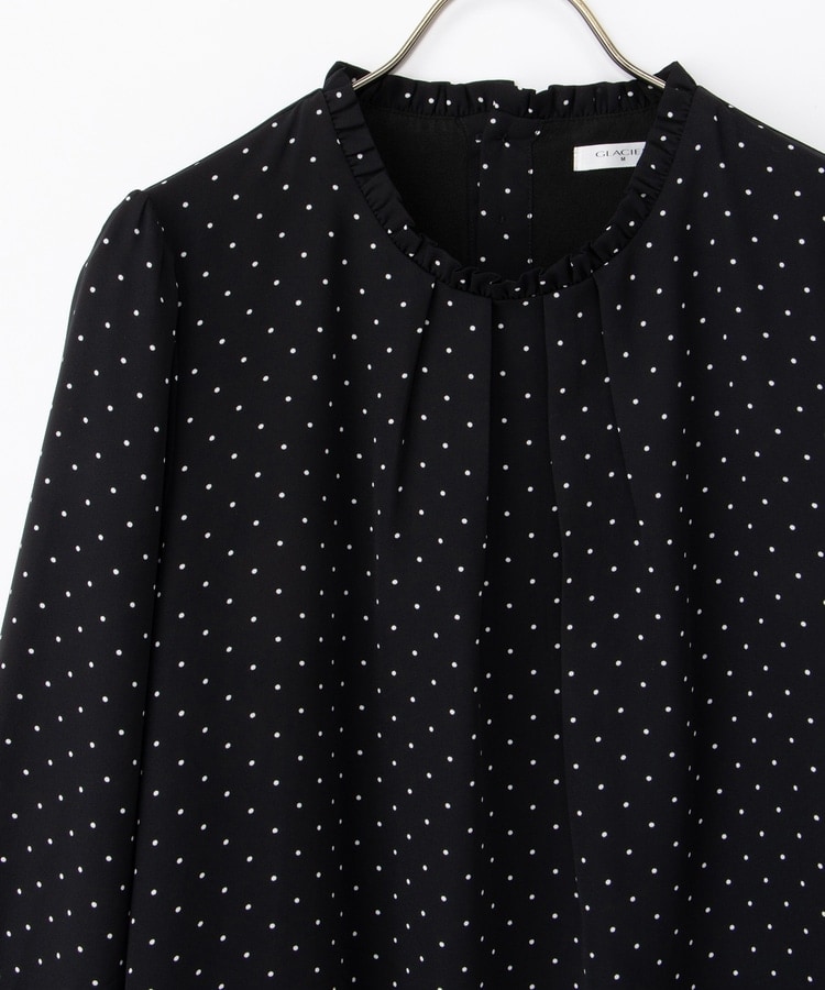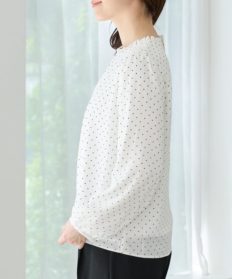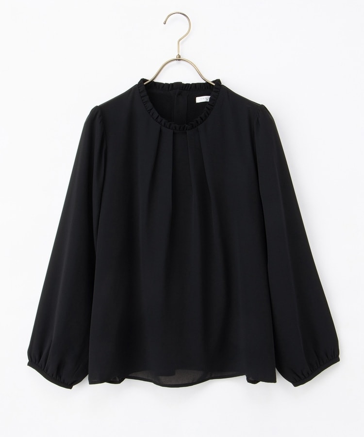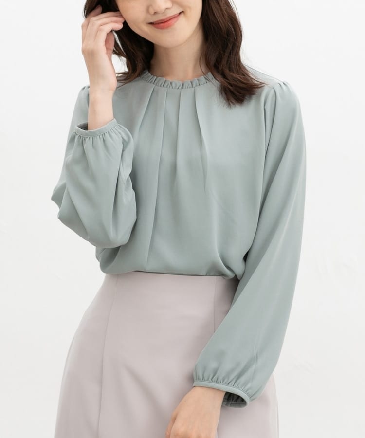 衿ぐりの控えめフリルが大人可愛いデザイン。