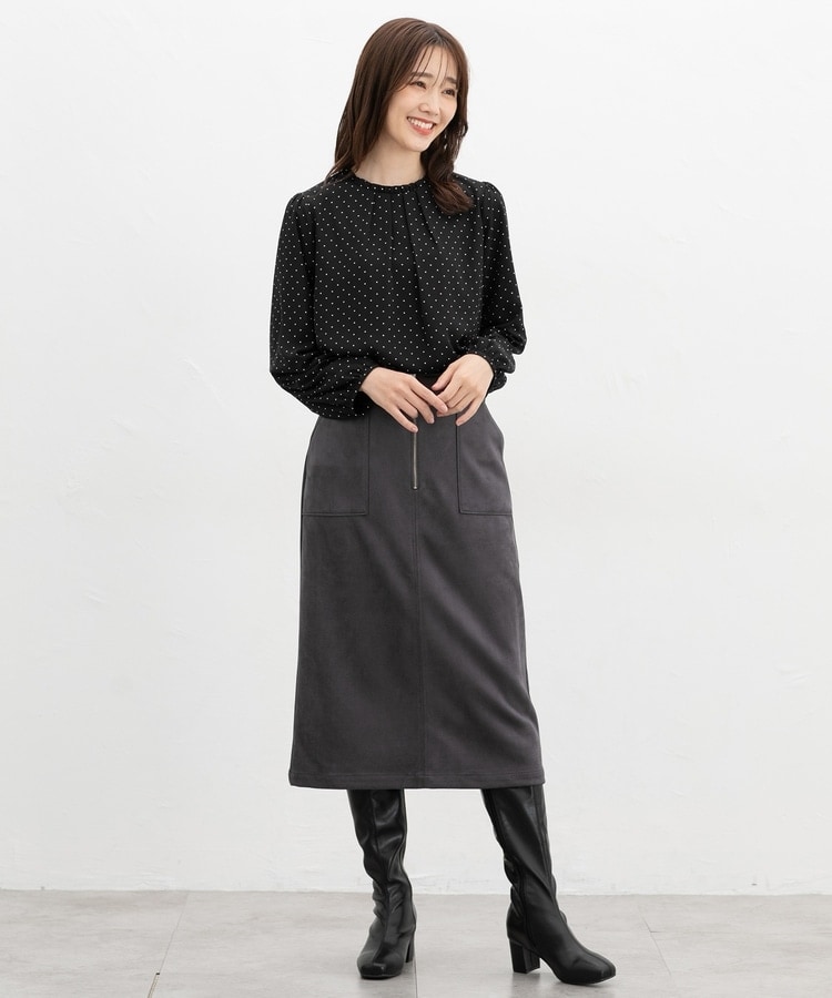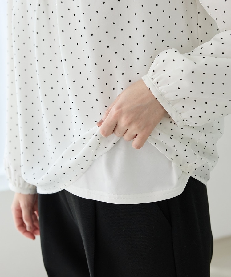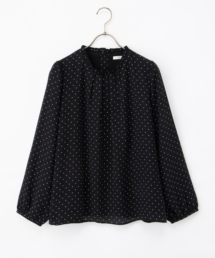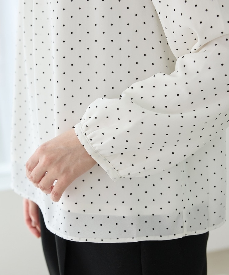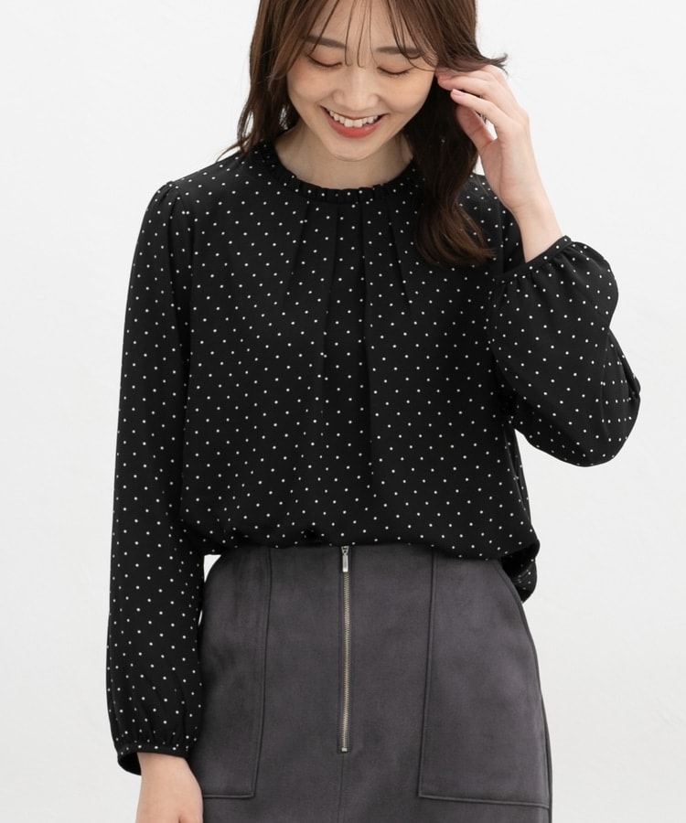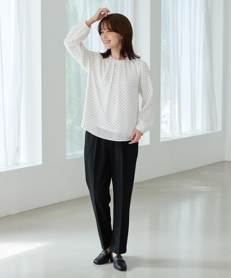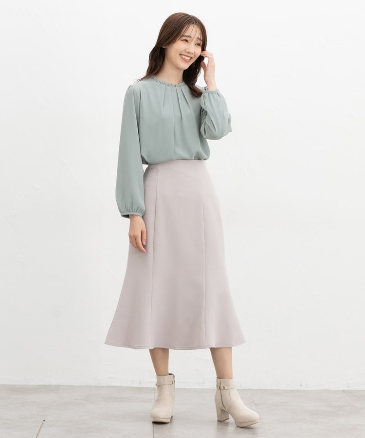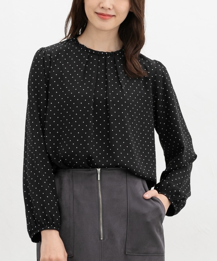 衿ぐりの控えめフリルが大人可愛いデザイン。