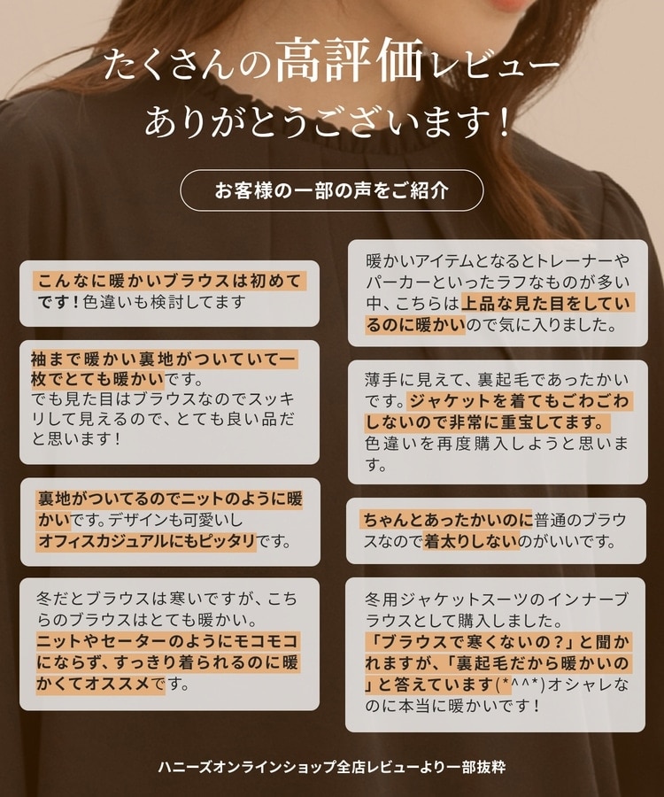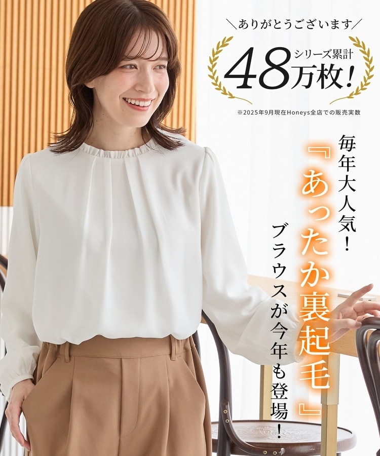 柔らかなジョーゼット素材に、裏起毛であたたかくソフトな肌触りの裏地が付いた『ハニぽか』アイテム。