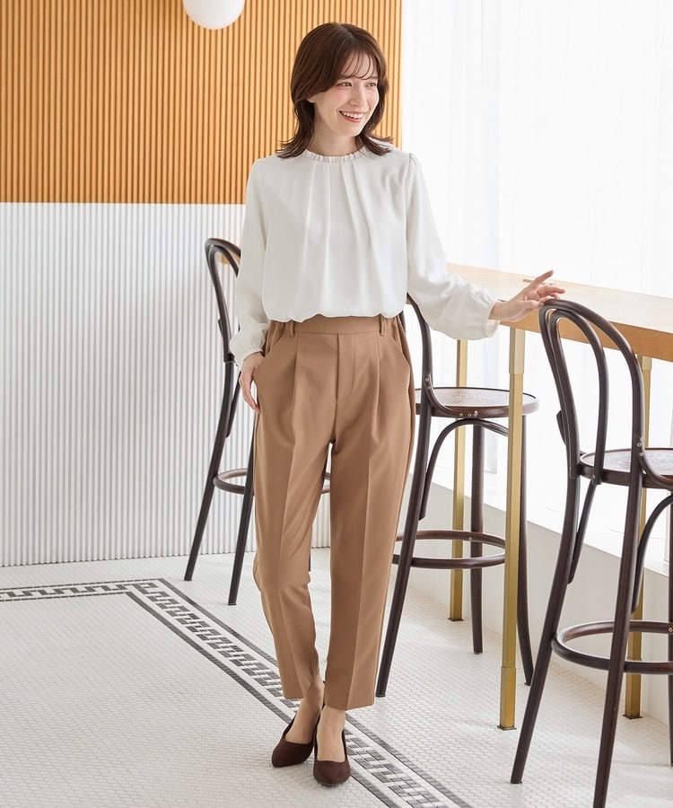 ゆったりめの幅と腰にかかる丈感に、フロントのタックで立体感を出した、体のラインを拾いにくシルエット。