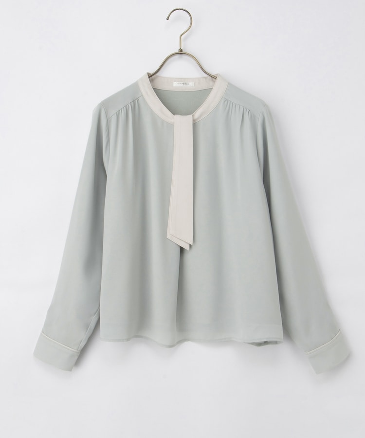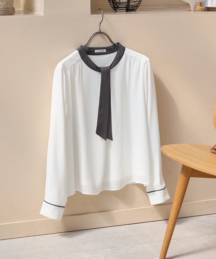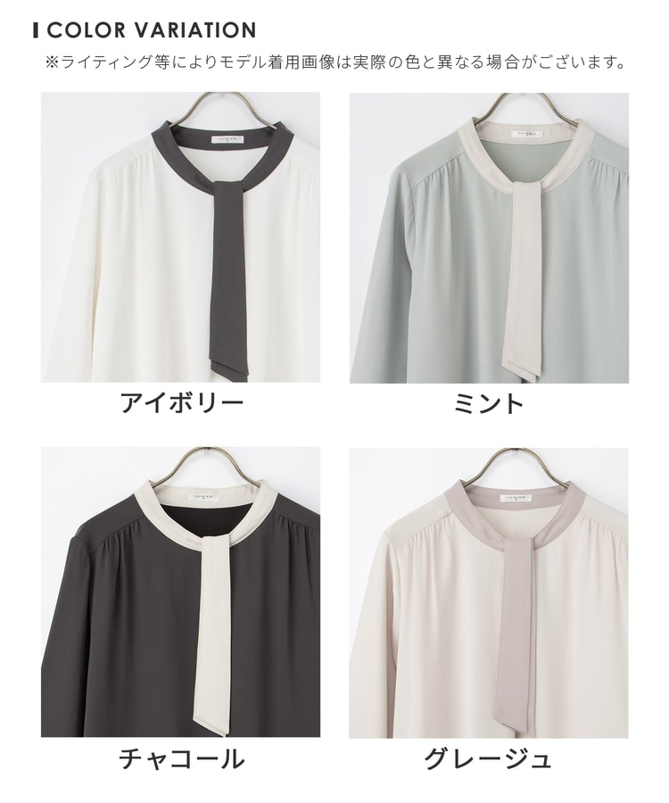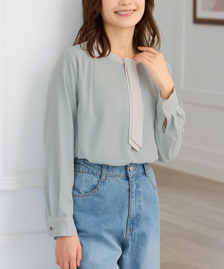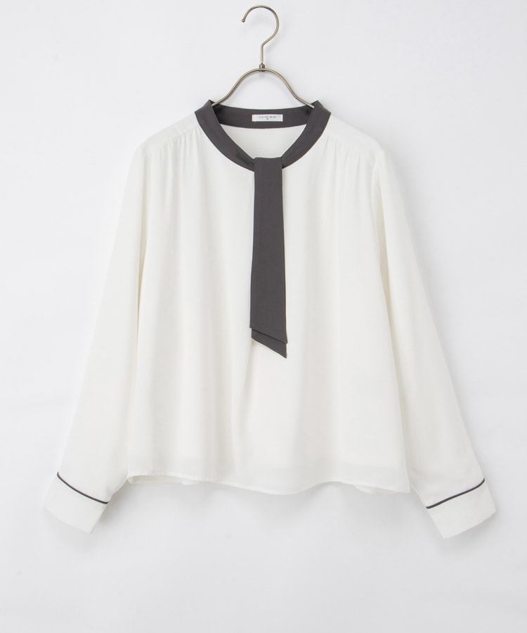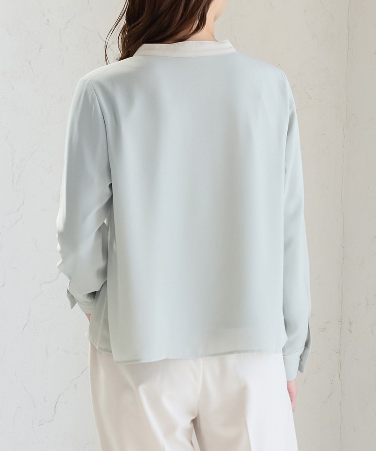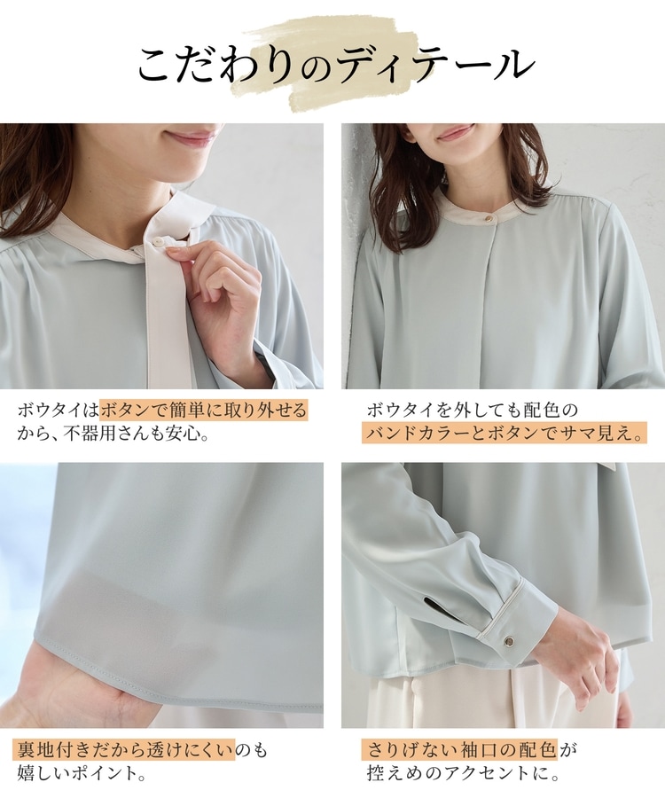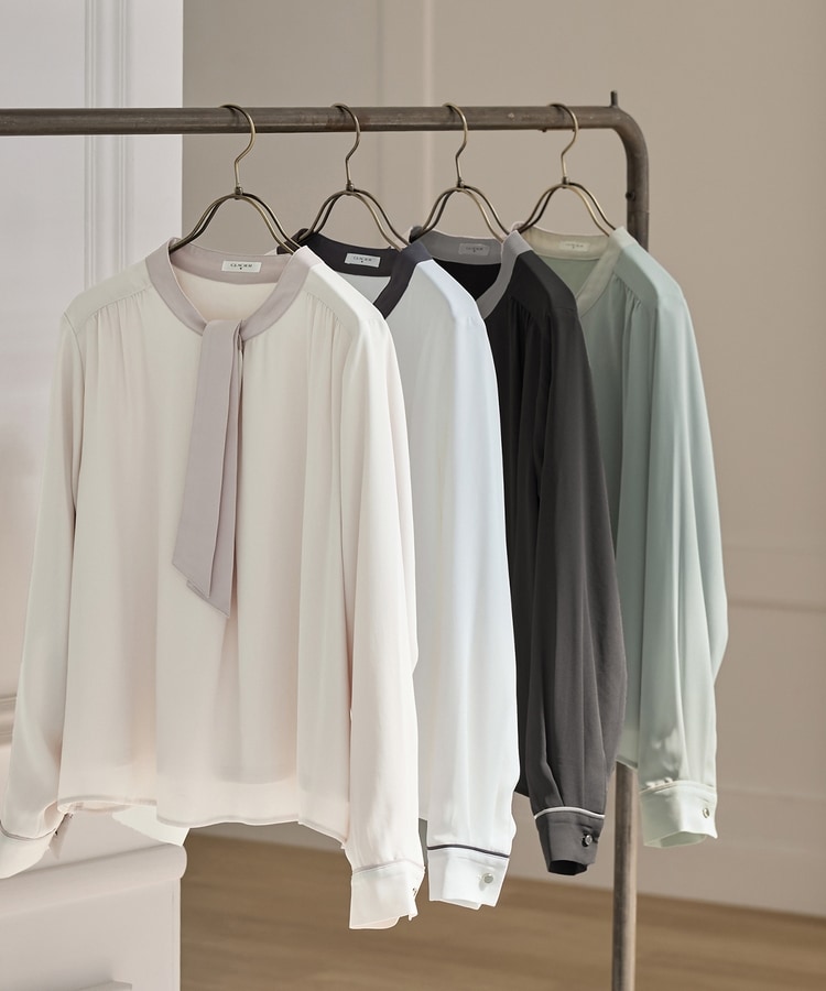 バンドカラーの衿と袖口も配色使いで、シンプルになりすぎないのも嬉しいポイント。