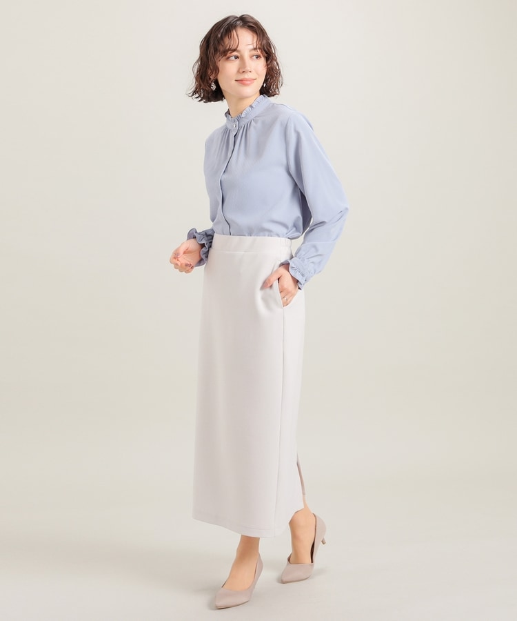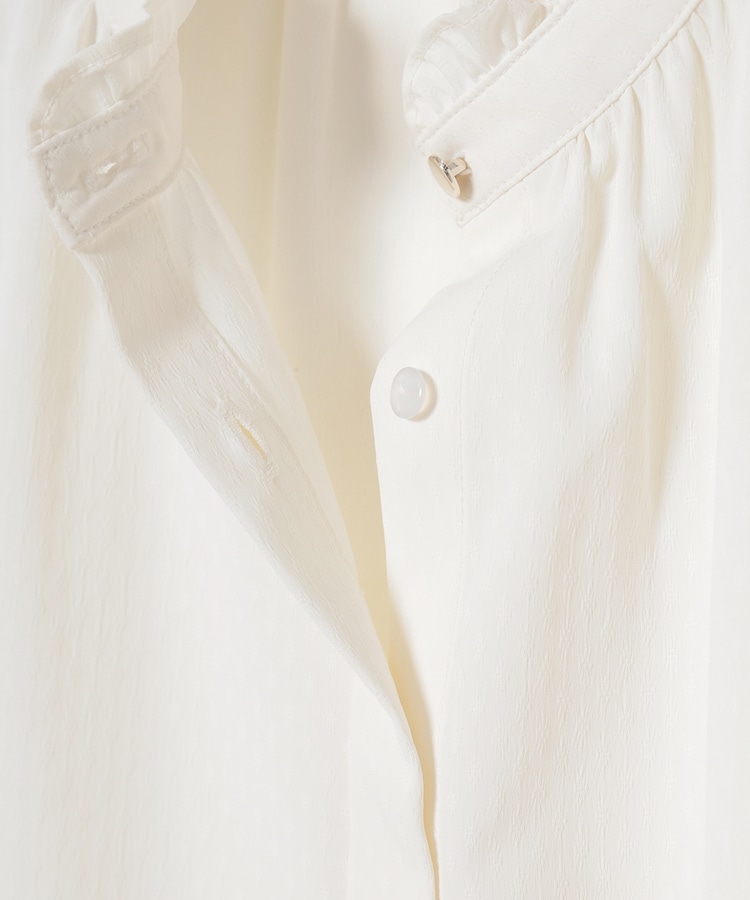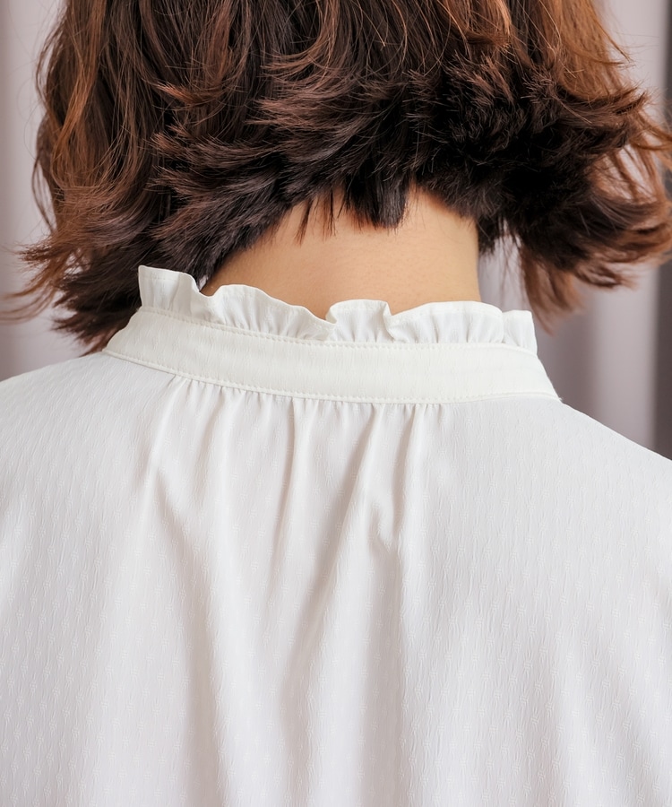 スタンドネックの衿ぐりと袖口にフリルを付けたフェミニンなデザイン。