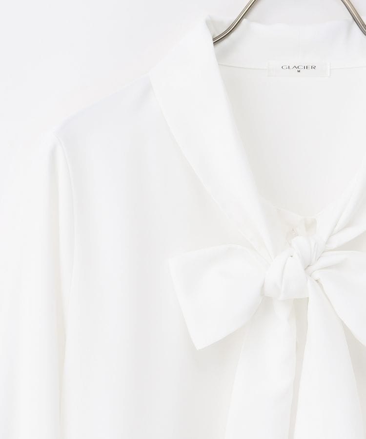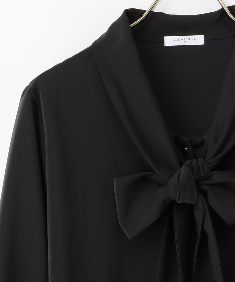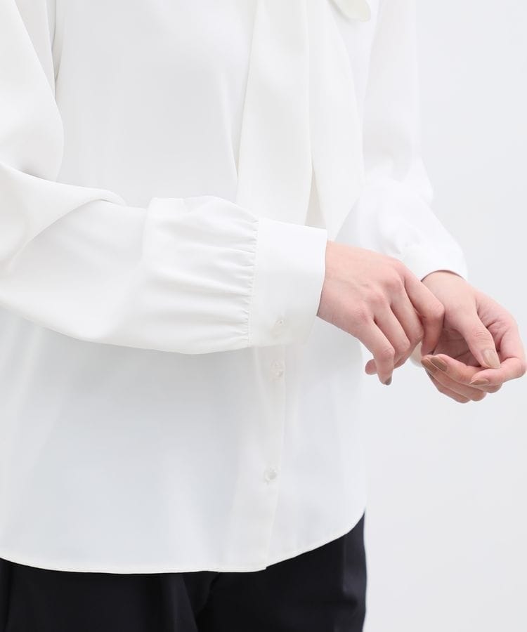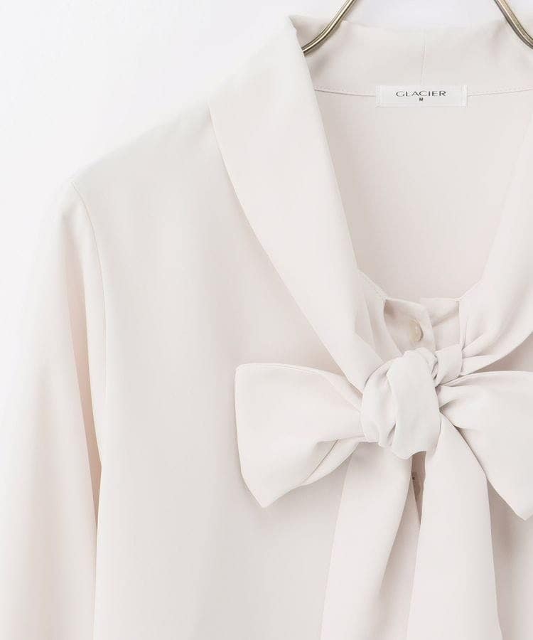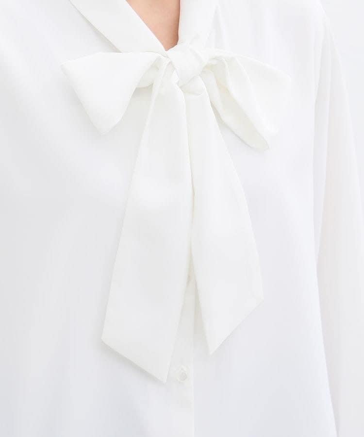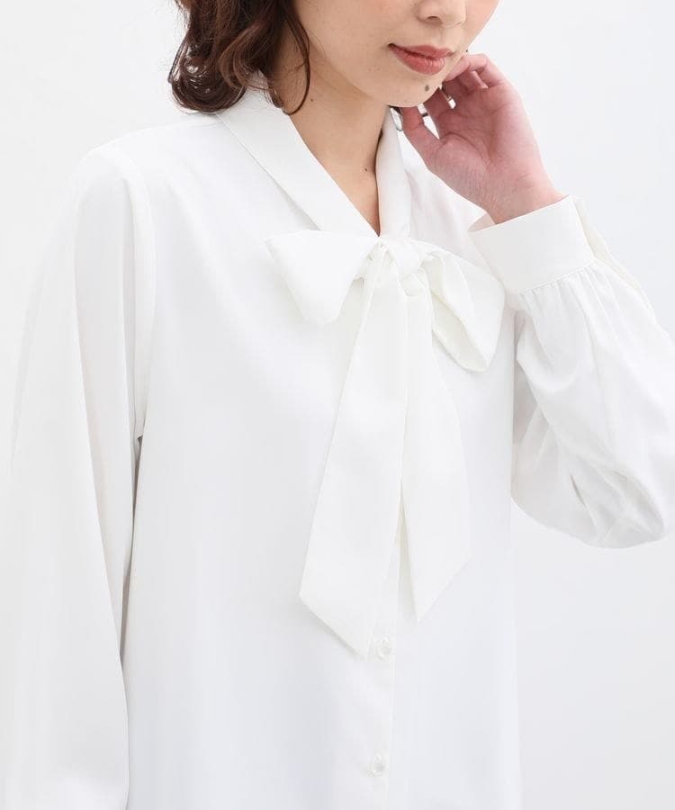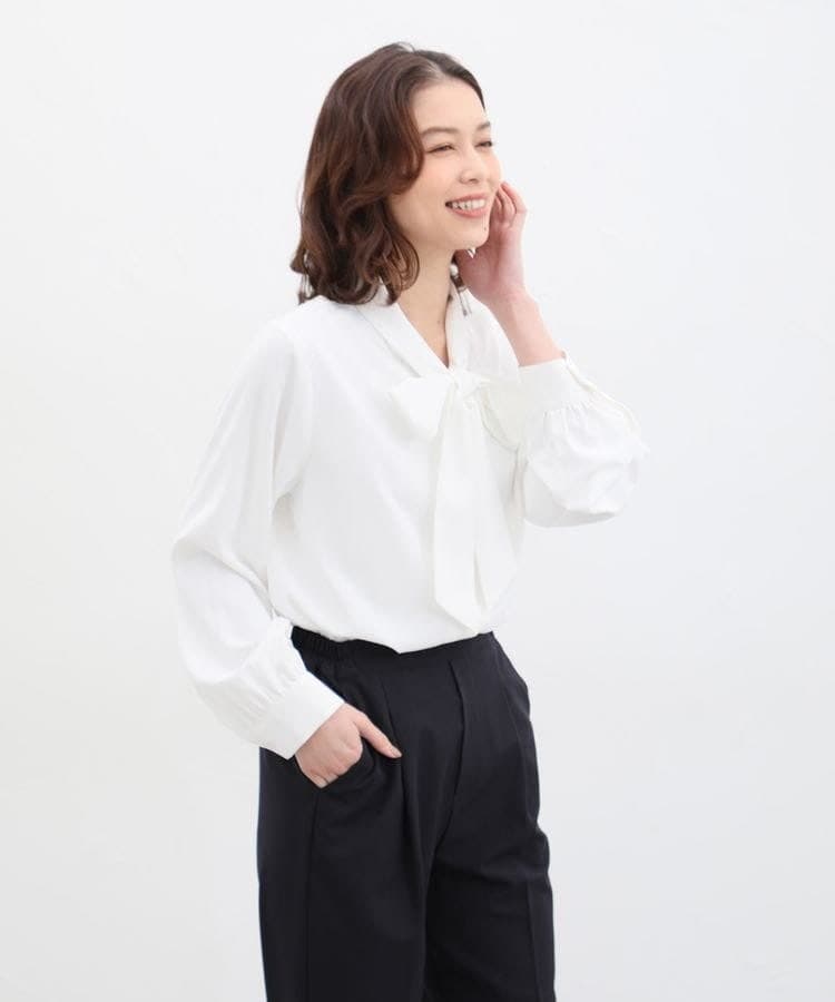 存在感があるボウタイリボンと、程よいボリューム袖がフェミニンなデザイン。
