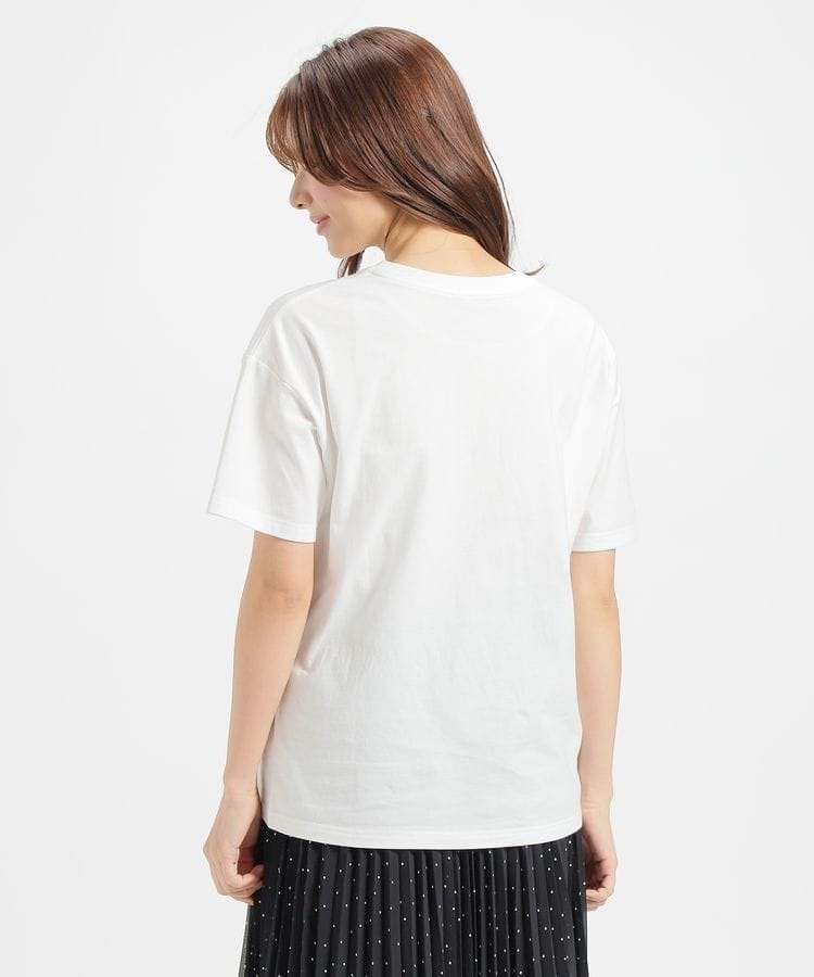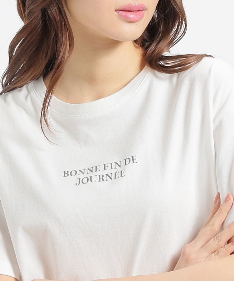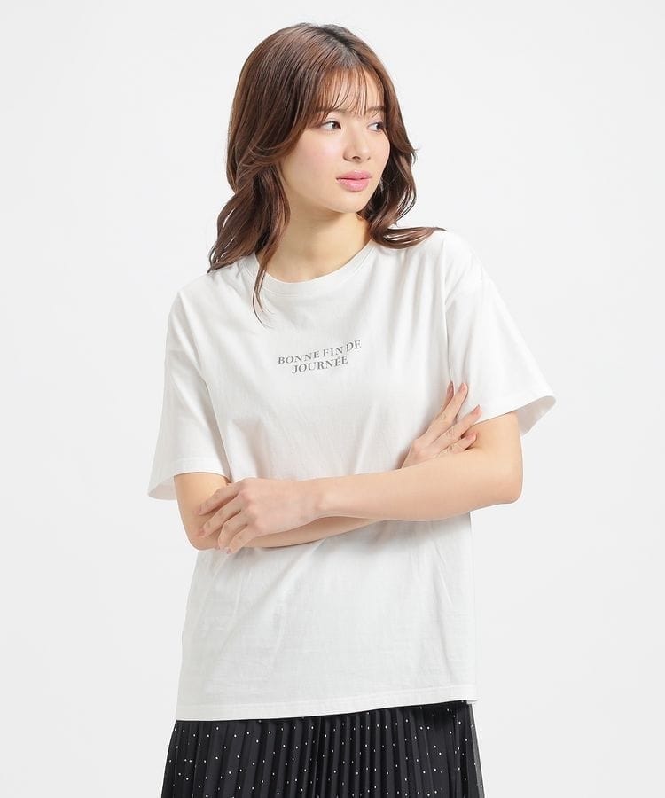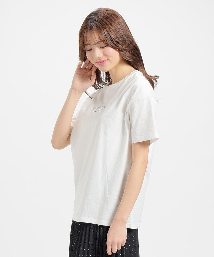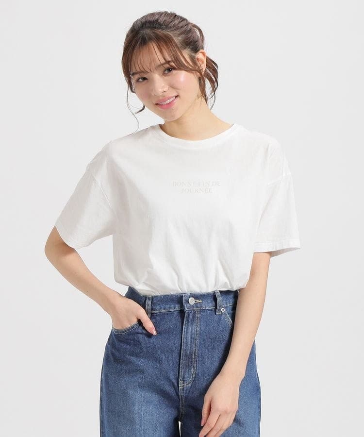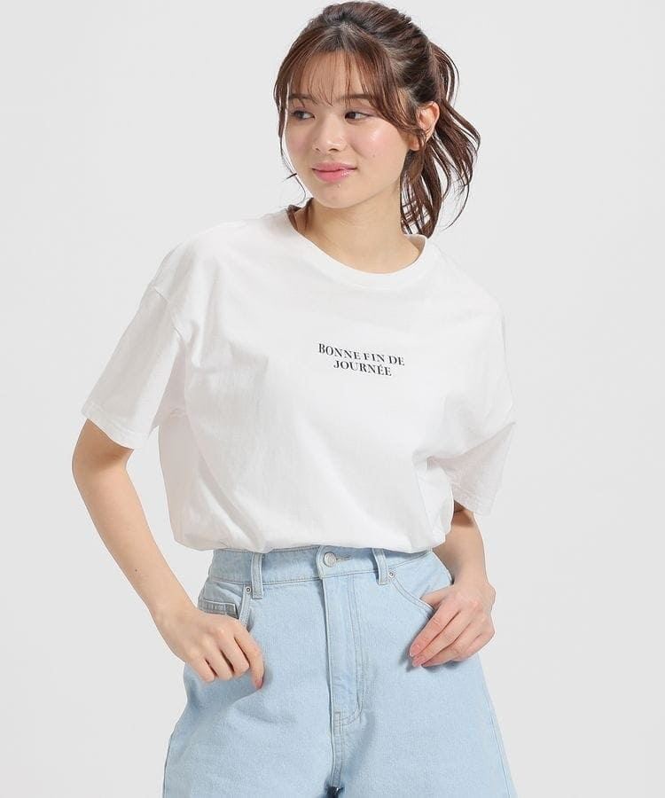 Tシャツもゆったりめで、おしゃれフォントの控えめロゴがこなれ感を演出。