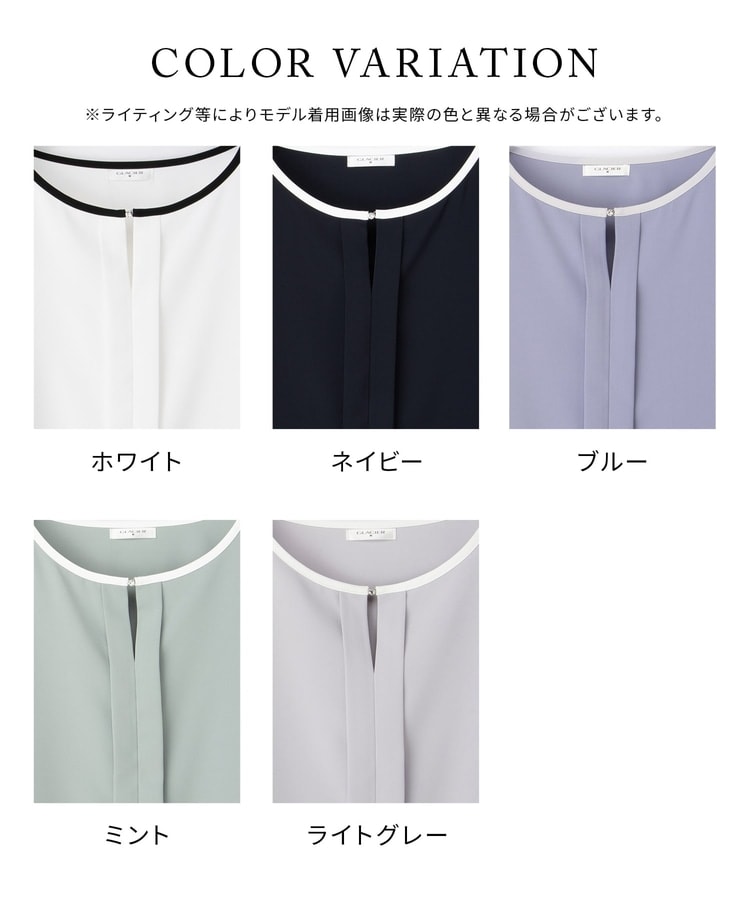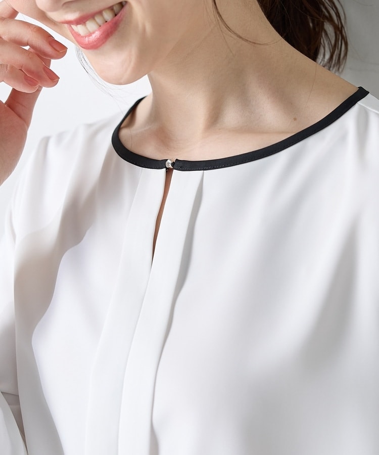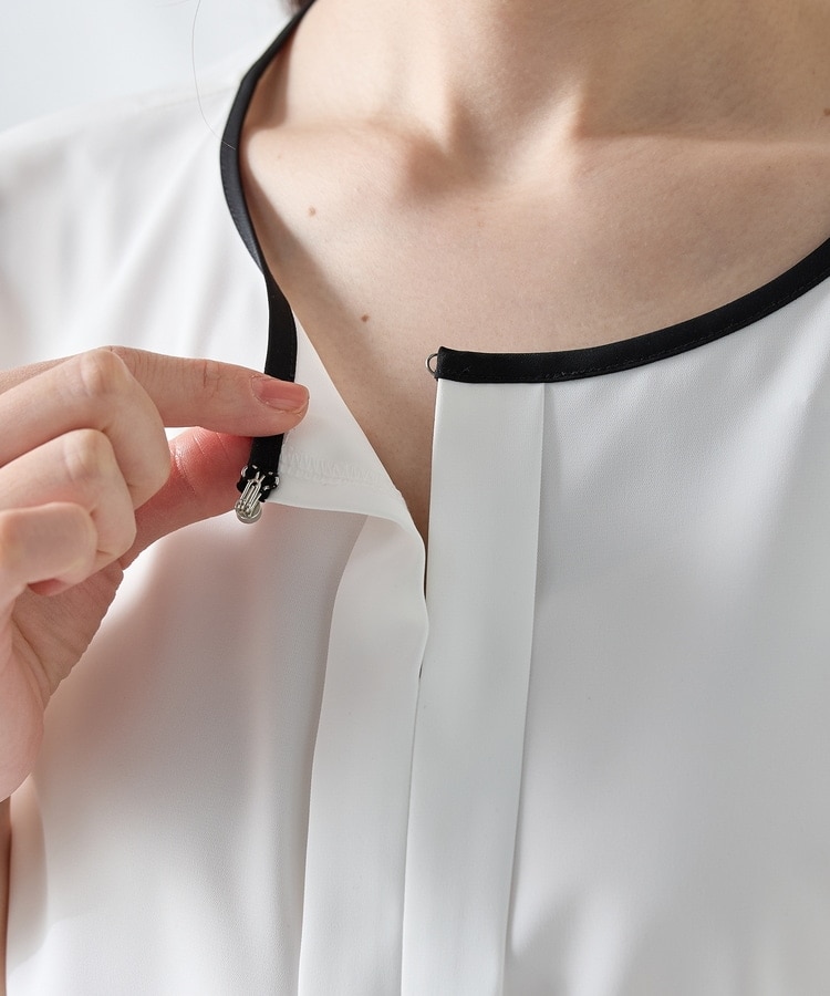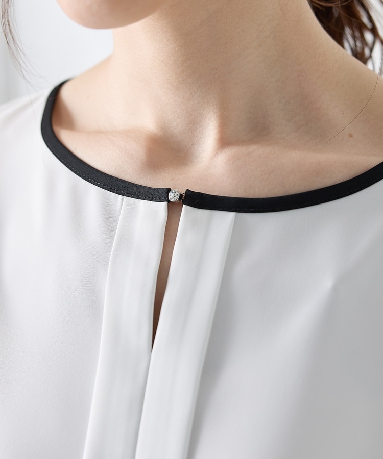 配色パイピングや衿元のラインストーンがさりげなく華やかなデザイン。