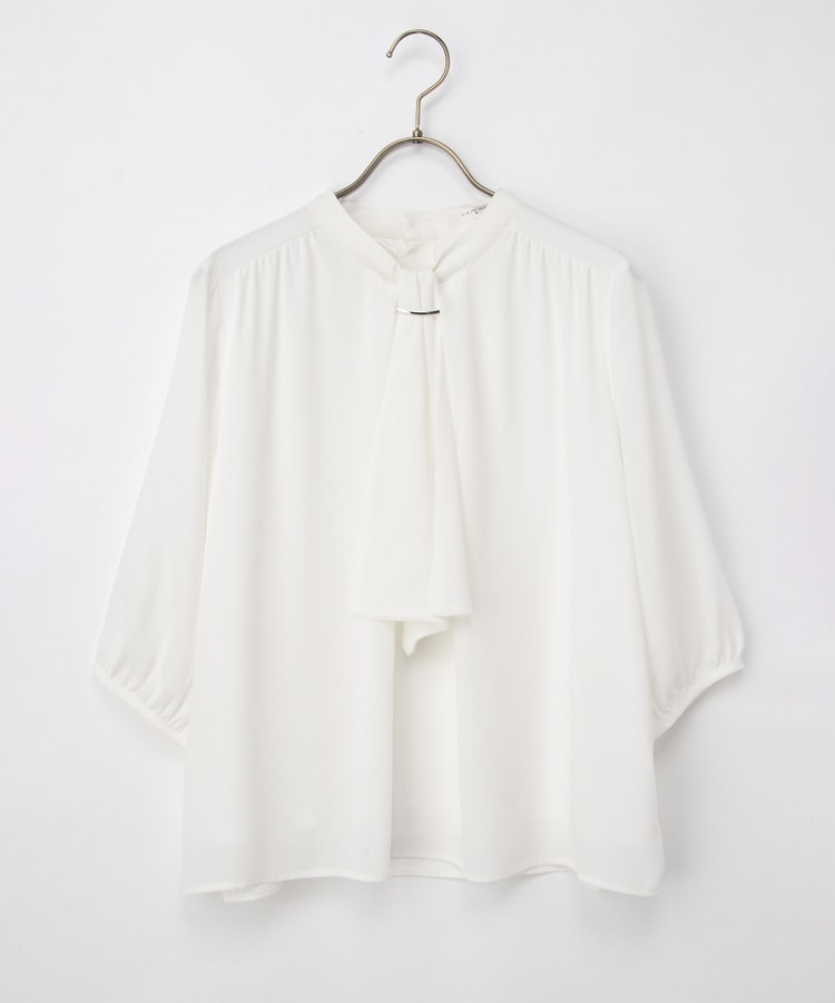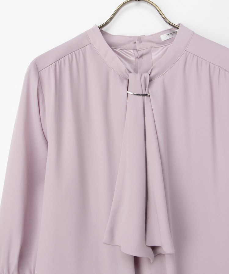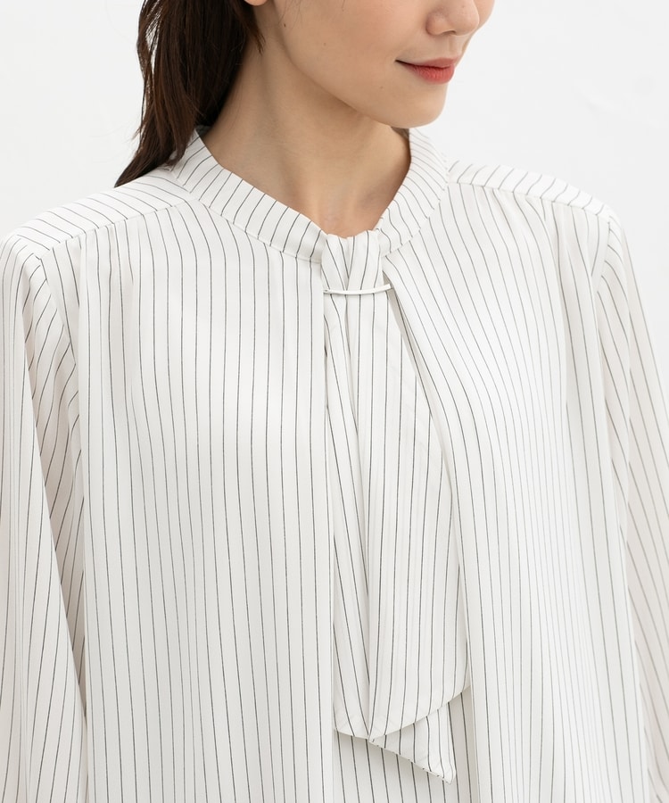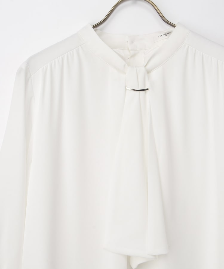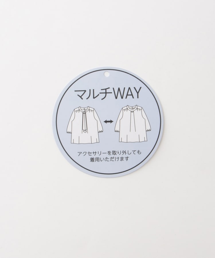 ボウタイを内側に入れたスタンドカラー、襟元のさりげなく華やかなアクセサリーも取り外したシンプルスタイルと、シーンや気分に合わせて着こなしのアレンジが楽しめるマルチway仕様。