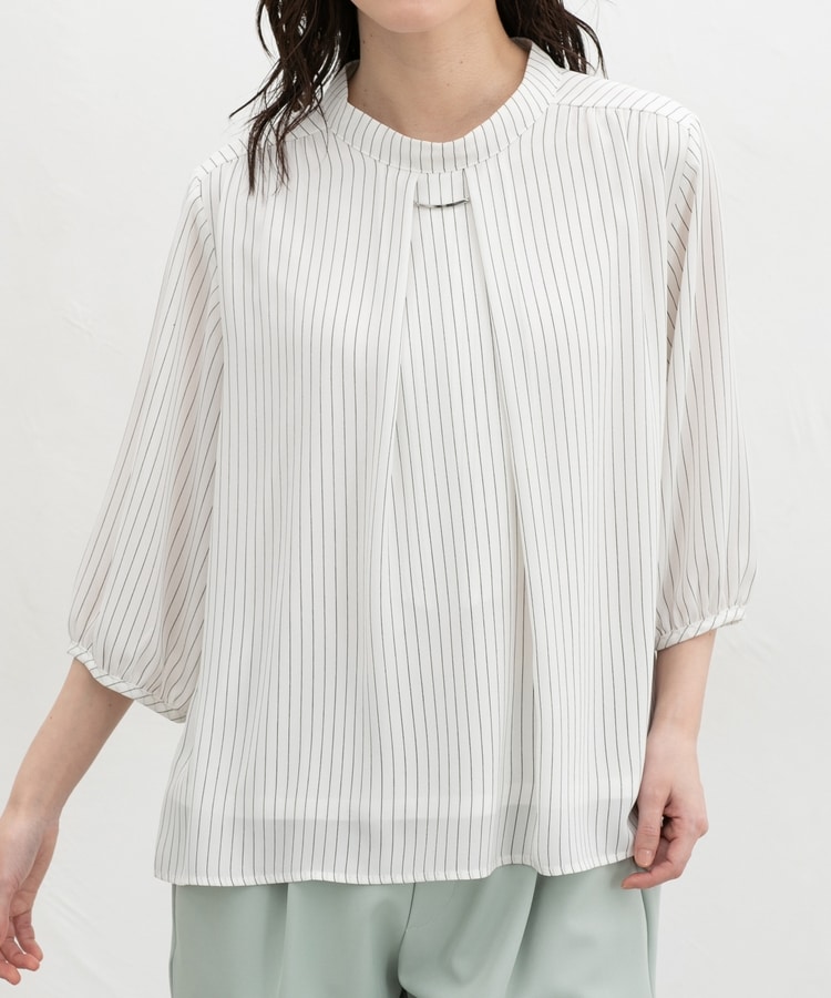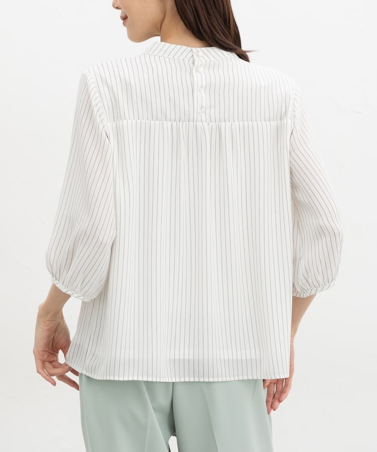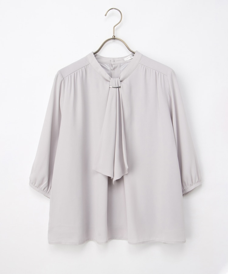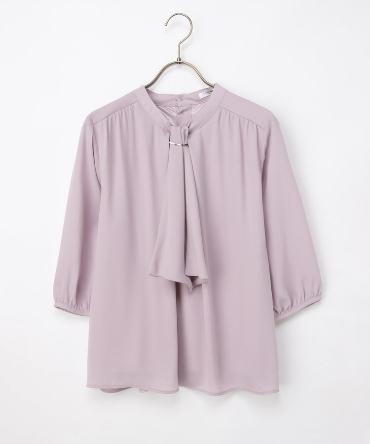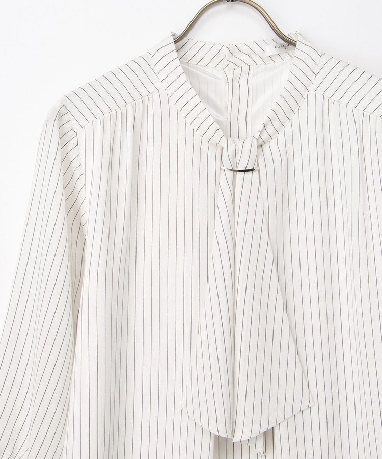 ボウタイを内側に入れたスタンドカラー、襟元のさりげなく華やかなアクセサリーも取り外したシンプルスタイルと、シーンや気分に合わせて着こなしのアレンジが楽しめるマルチway仕様。