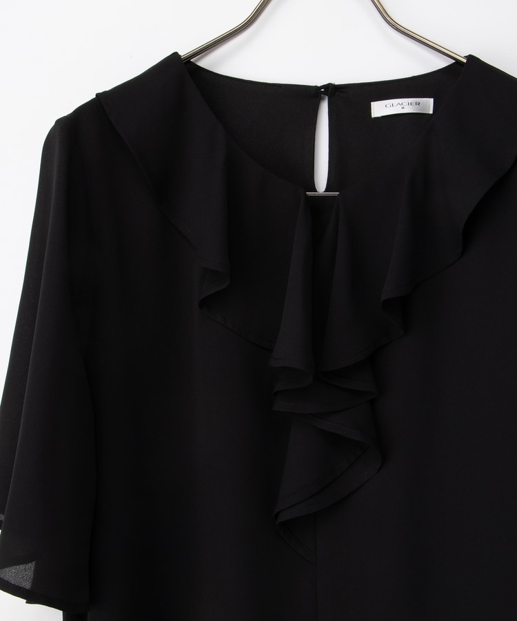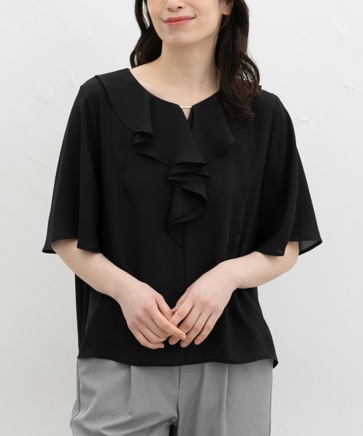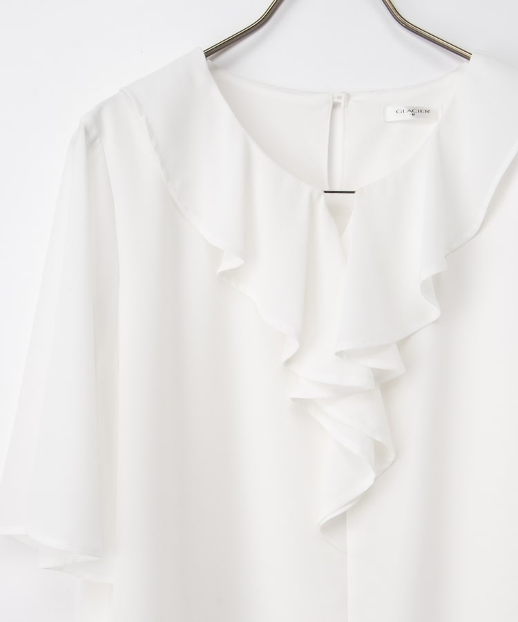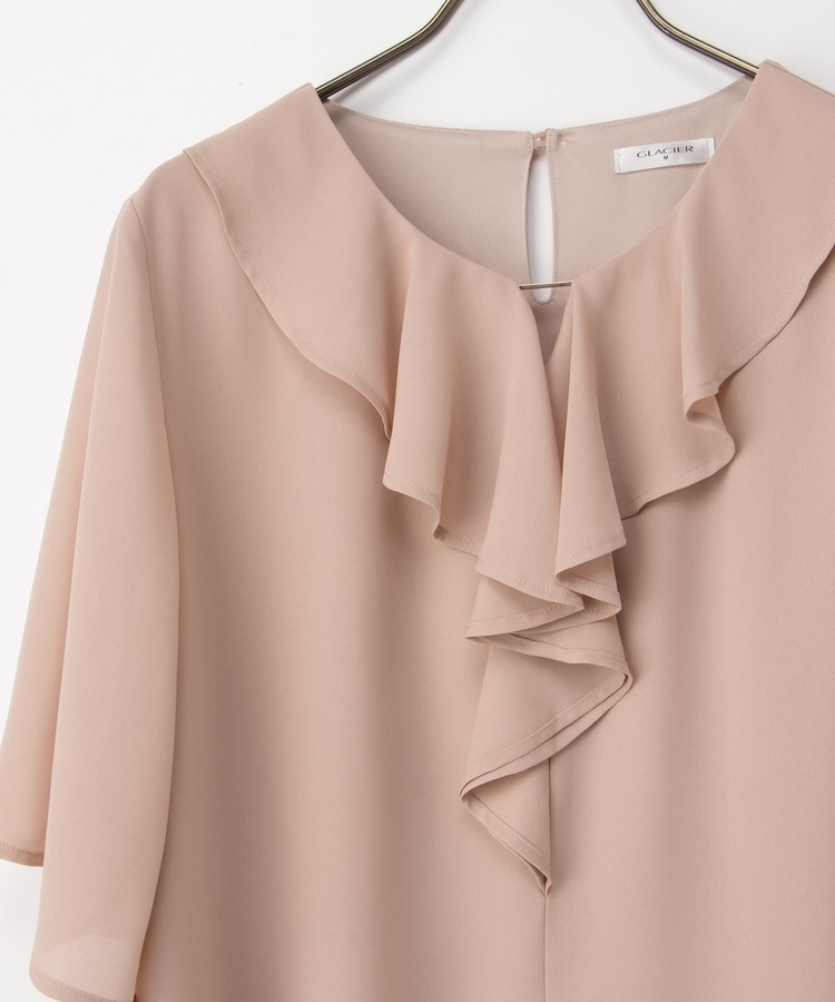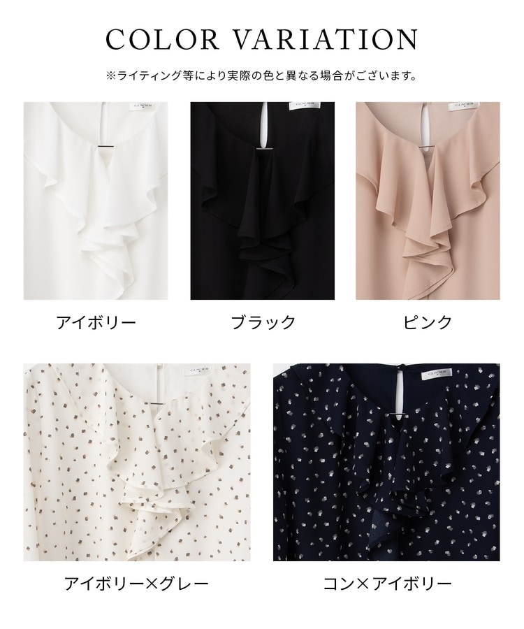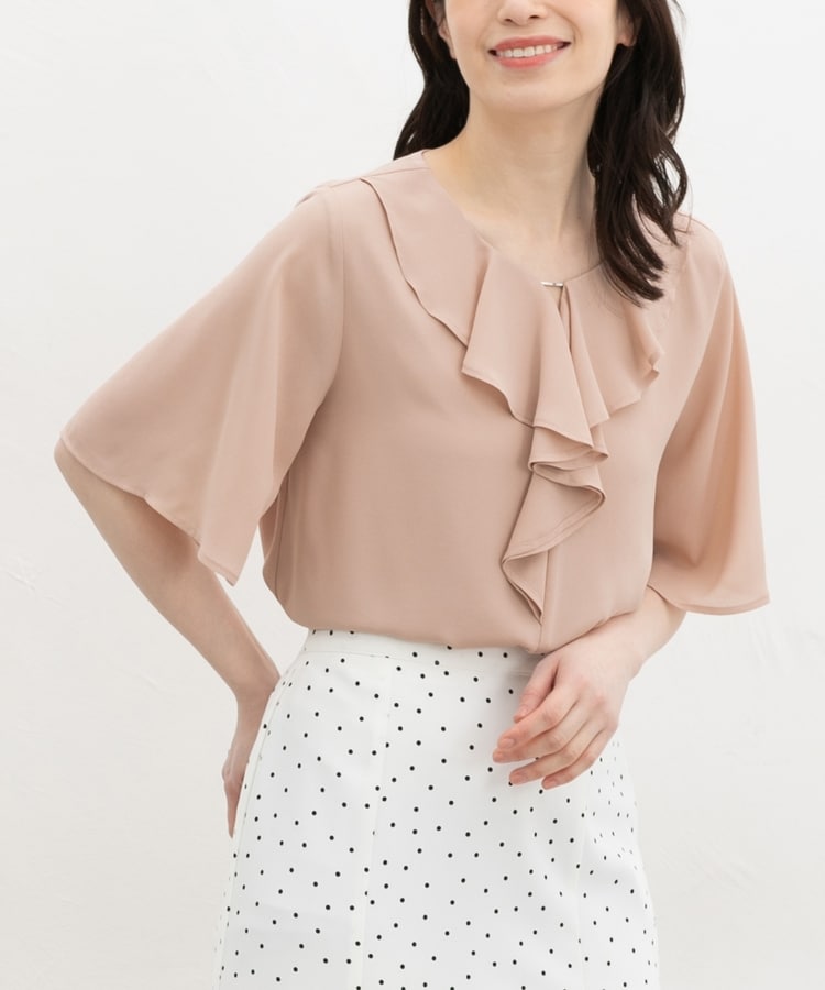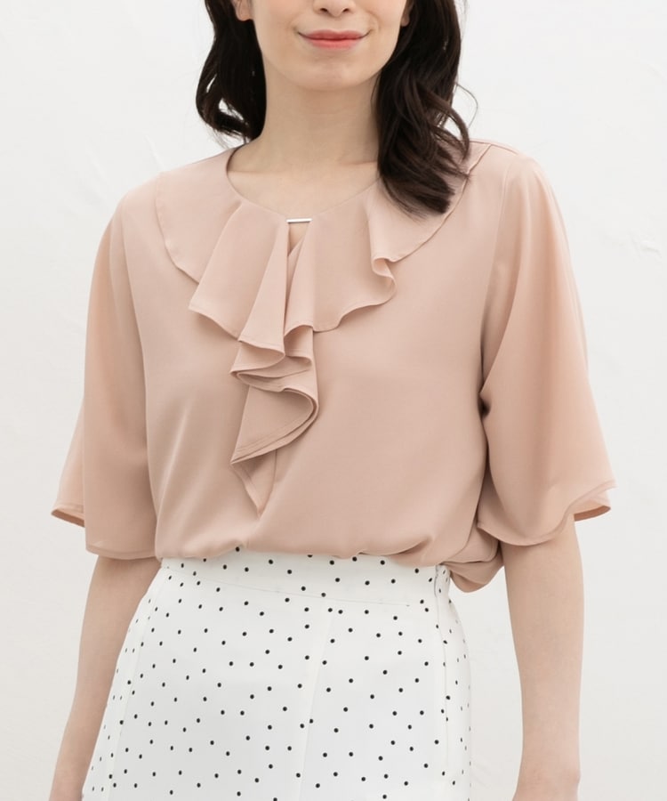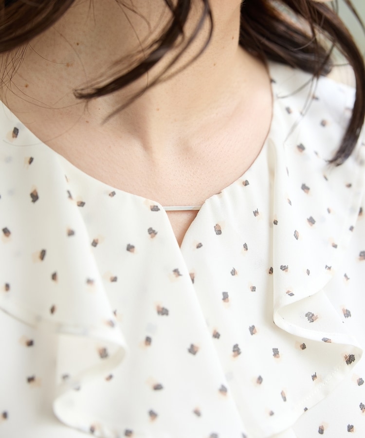 流れるようなドレープのラッフルフリルの衿元に、メタルパーツでアクセントをプラスした、華やかで上品なデザイン。