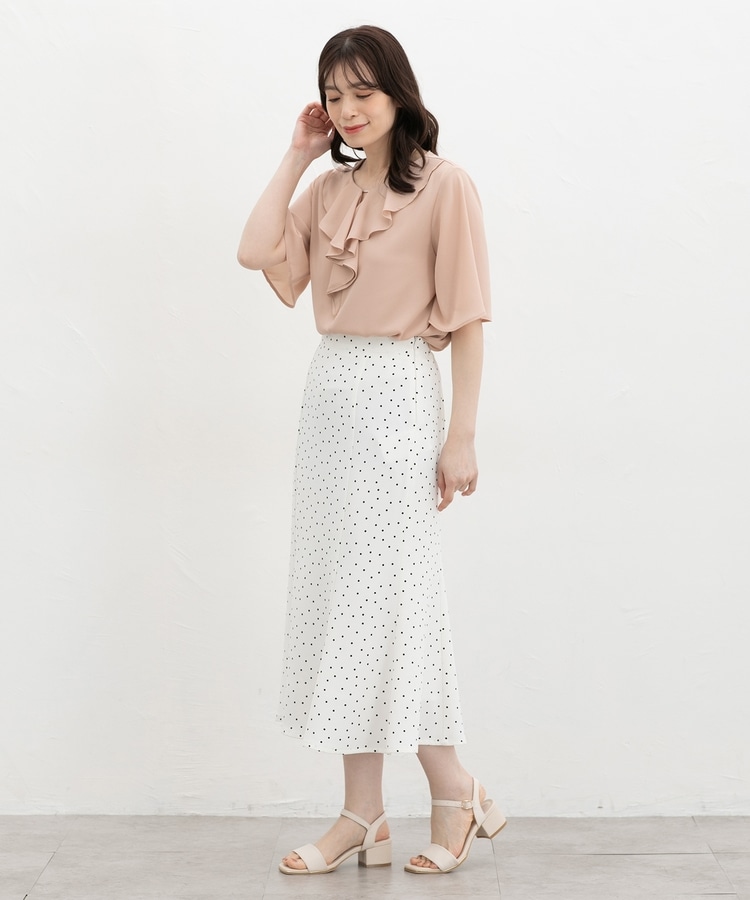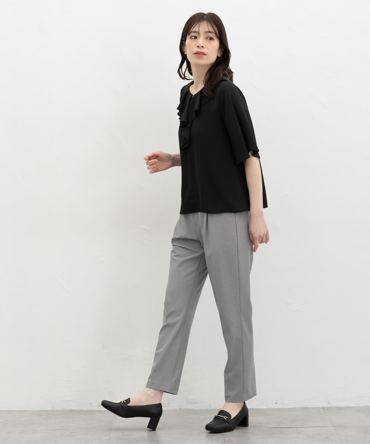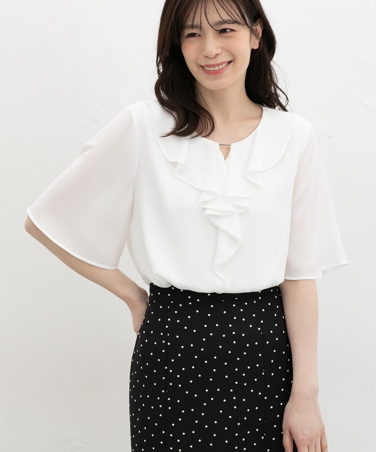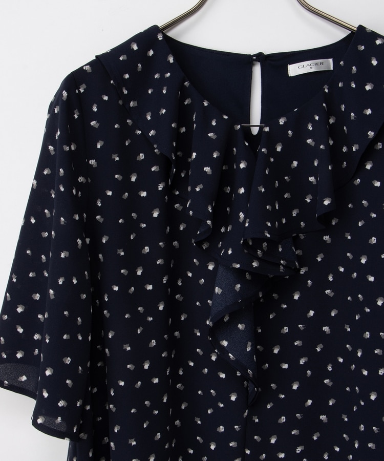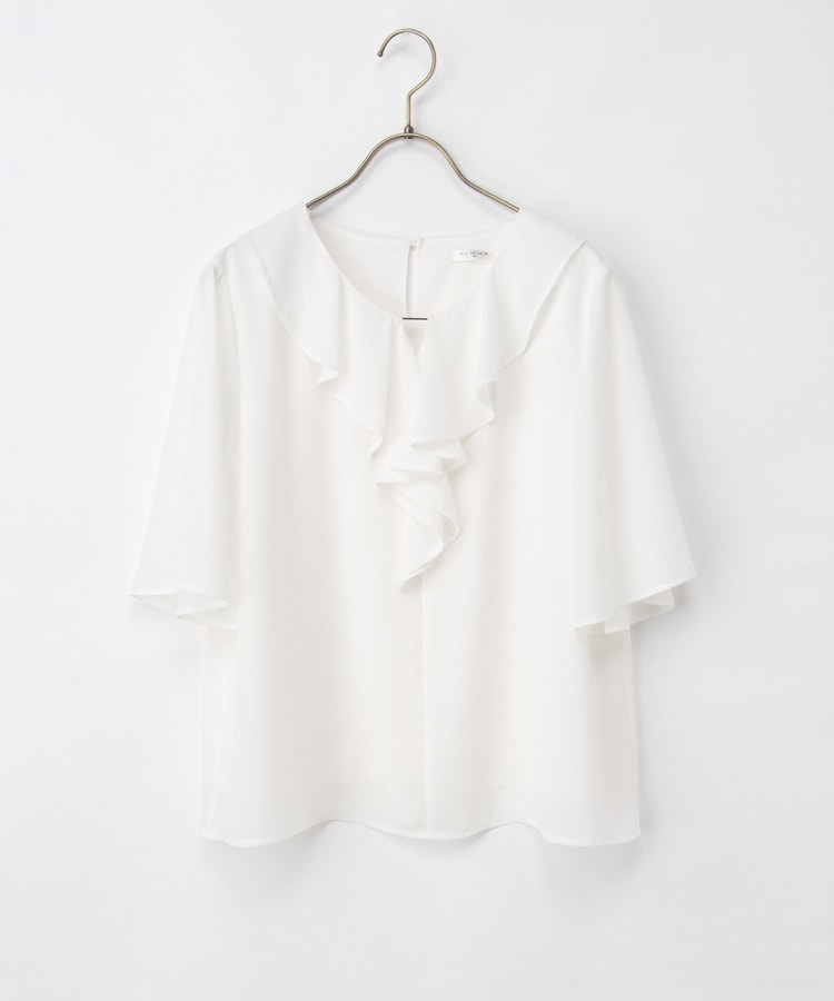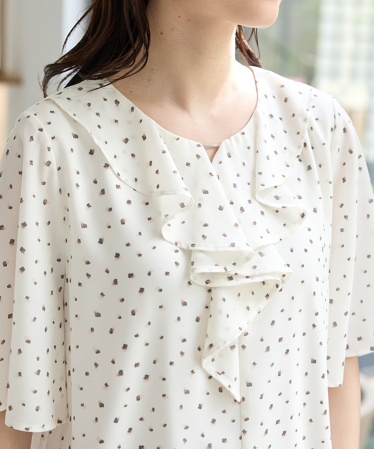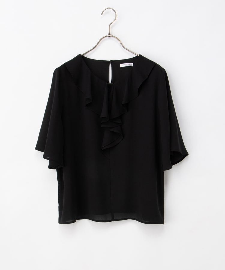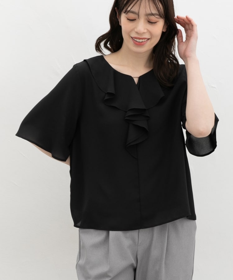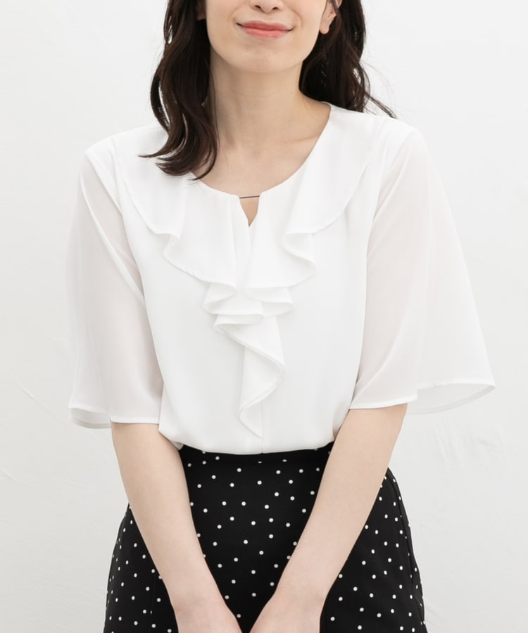 流れるようなドレープのラッフルフリルの衿元に、メタルパーツでアクセントをプラスした、華やかで上品なデザイン。