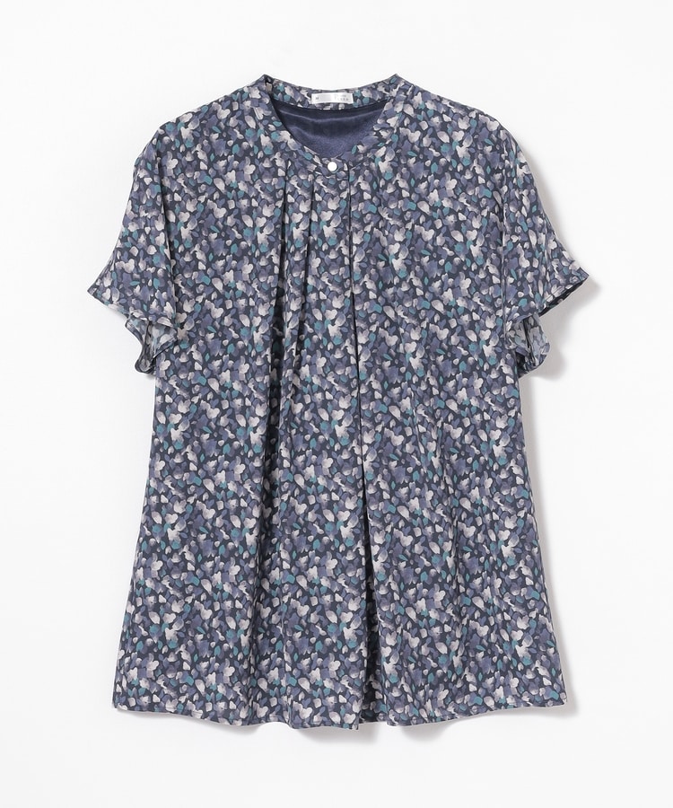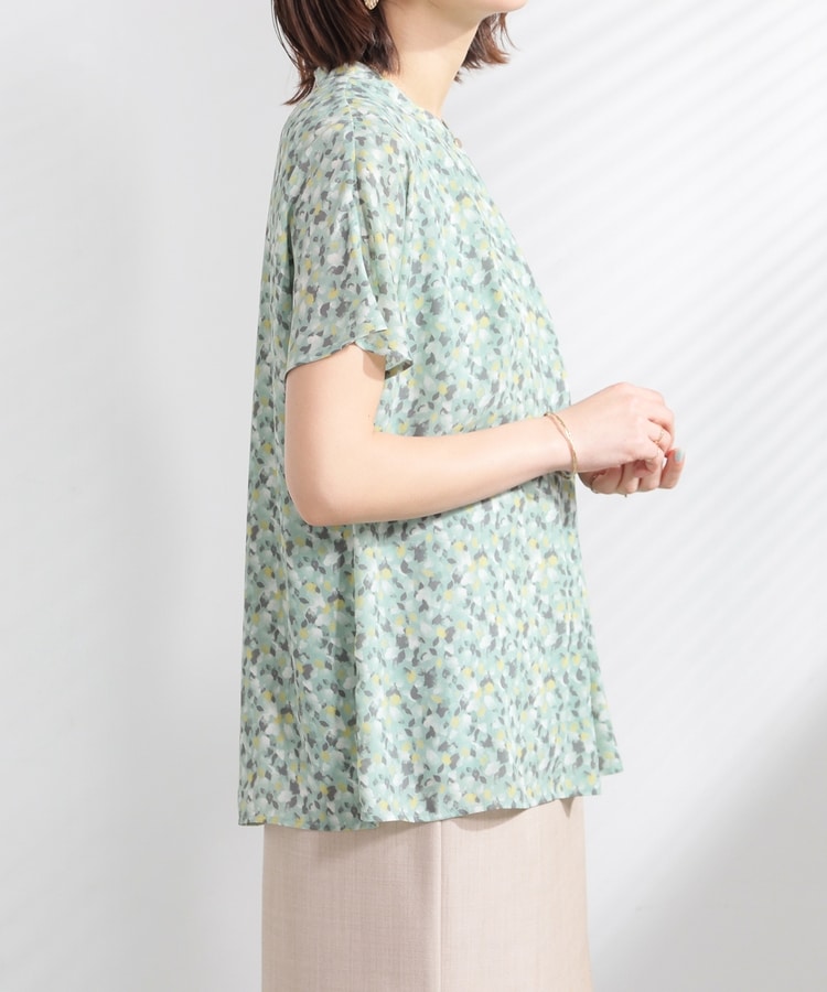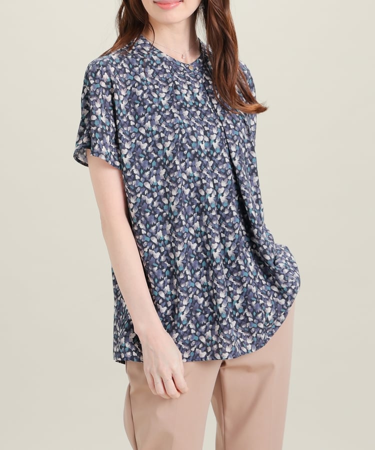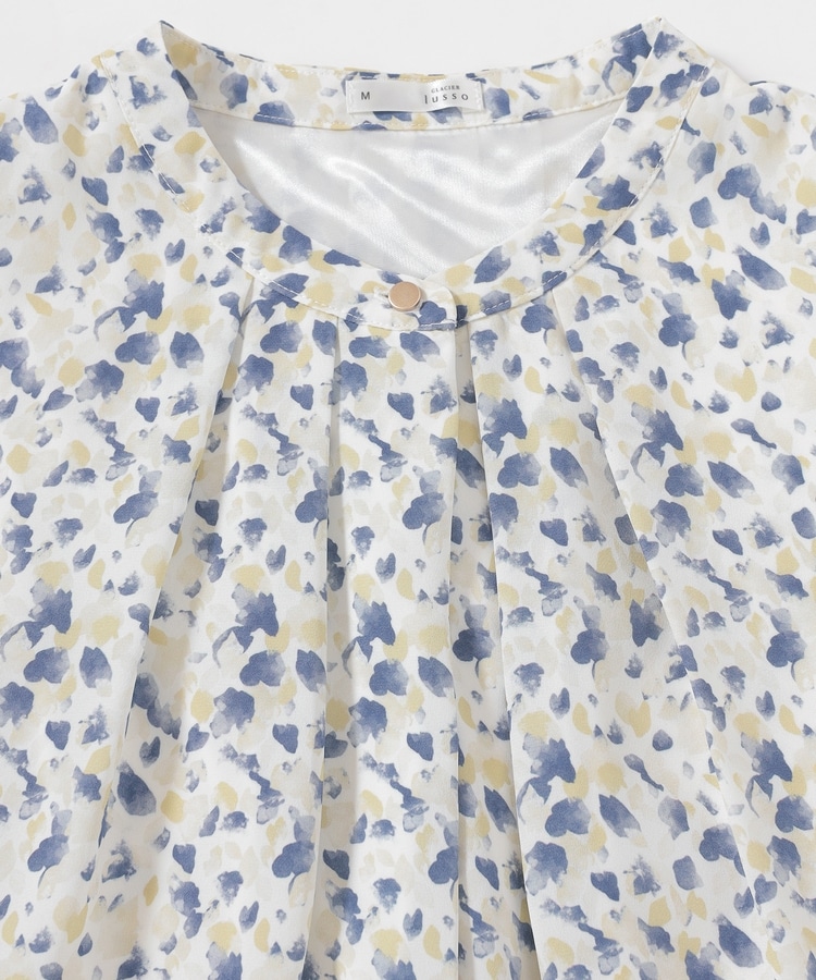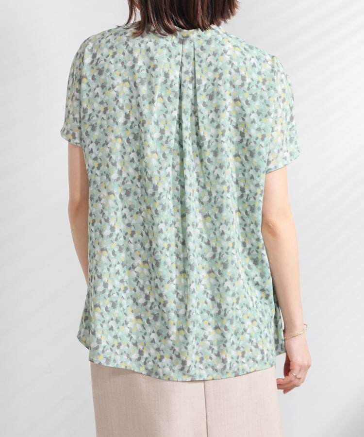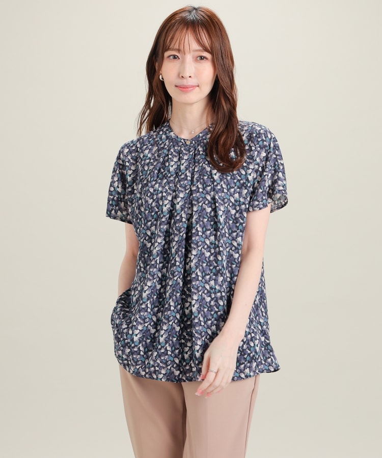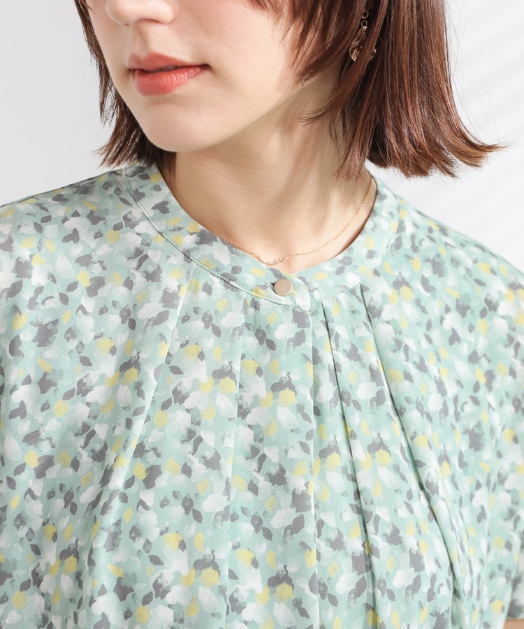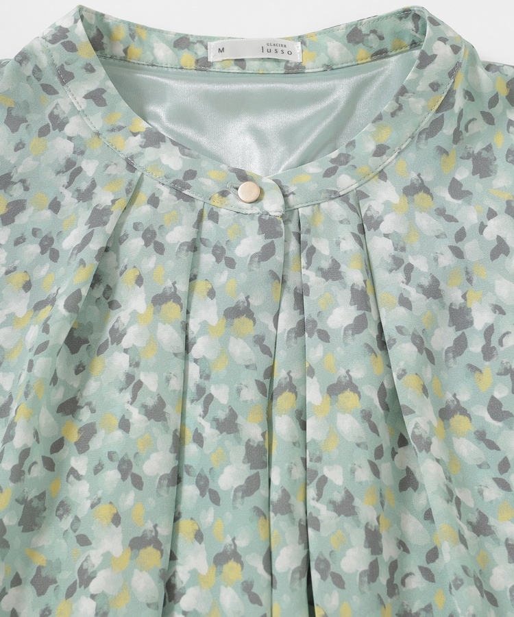 首元をすっきり見せるシンプルなバンドカラーに、華やかなアート柄が目を引くデザイン。