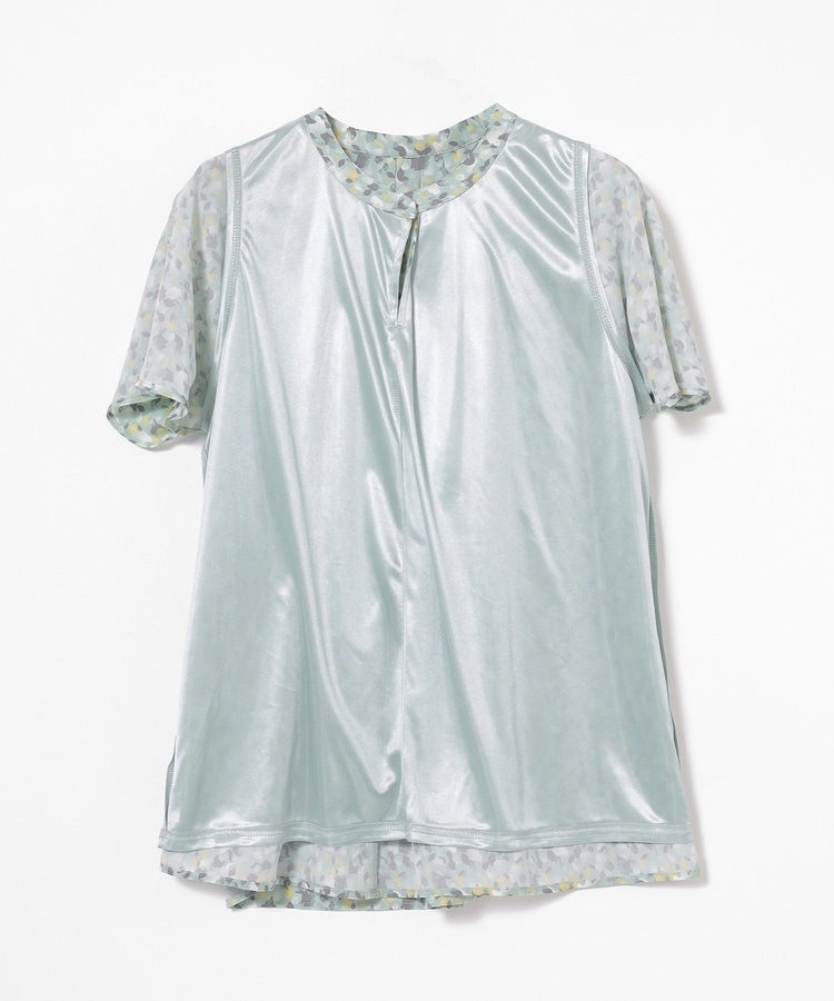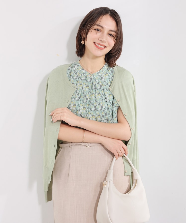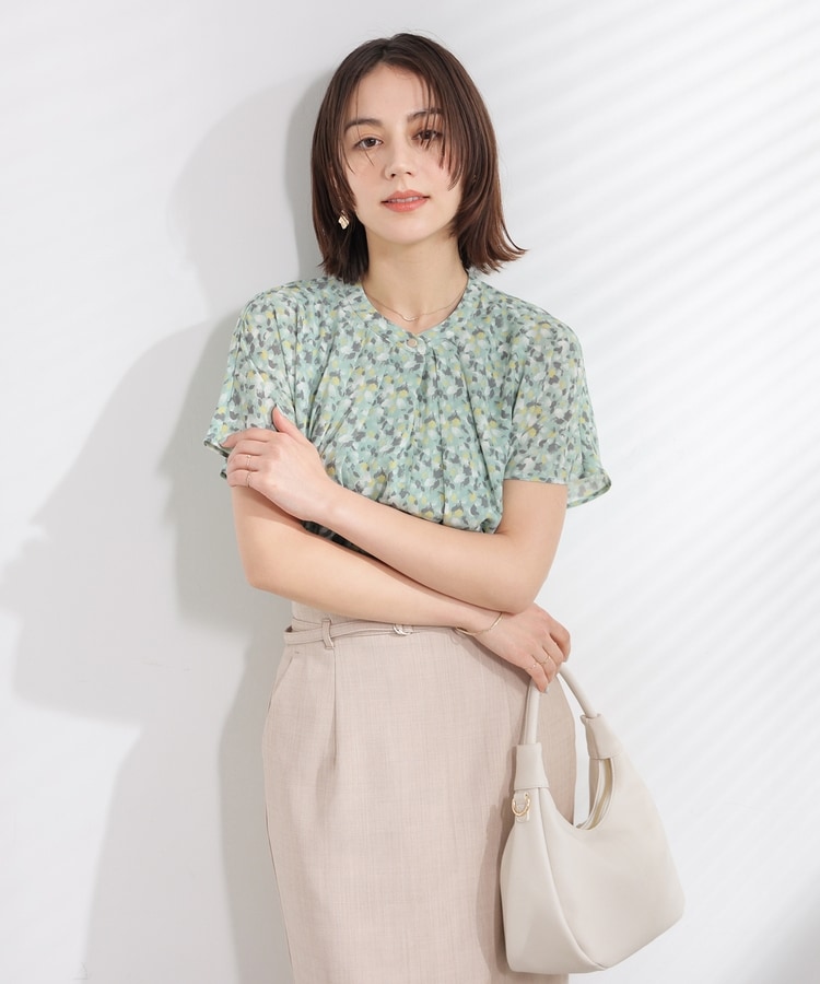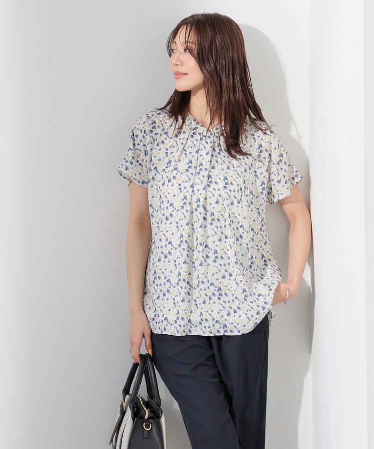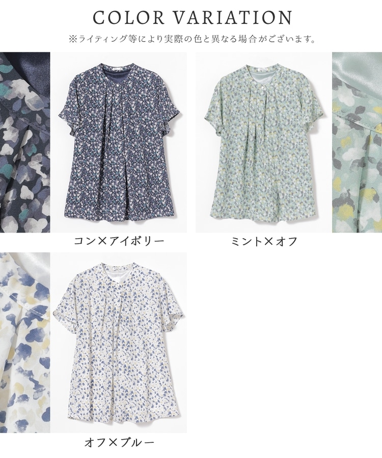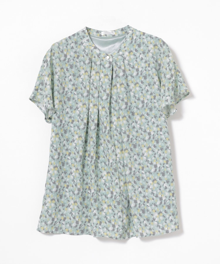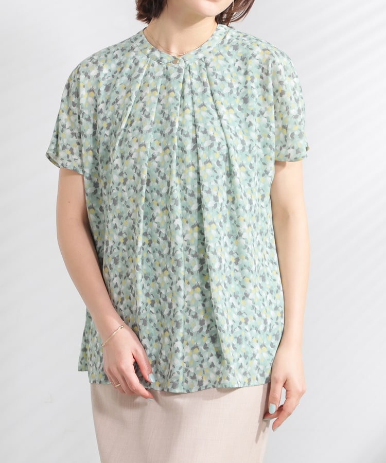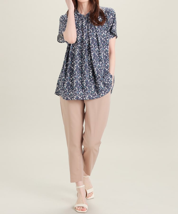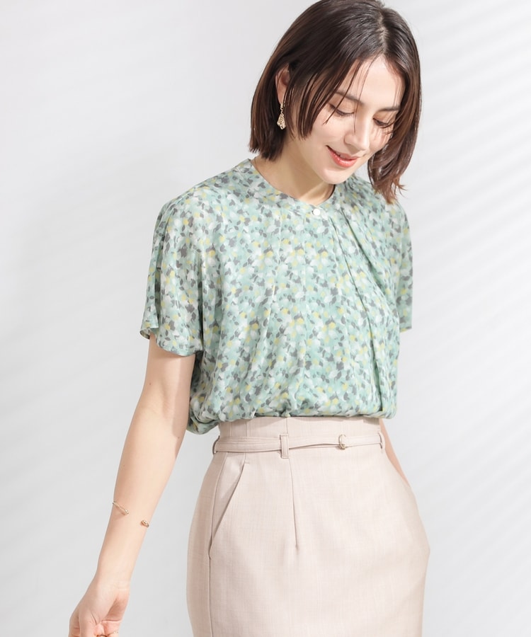 首元をすっきり見せるシンプルなバンドカラーに、華やかなアート柄が目を引くデザイン。