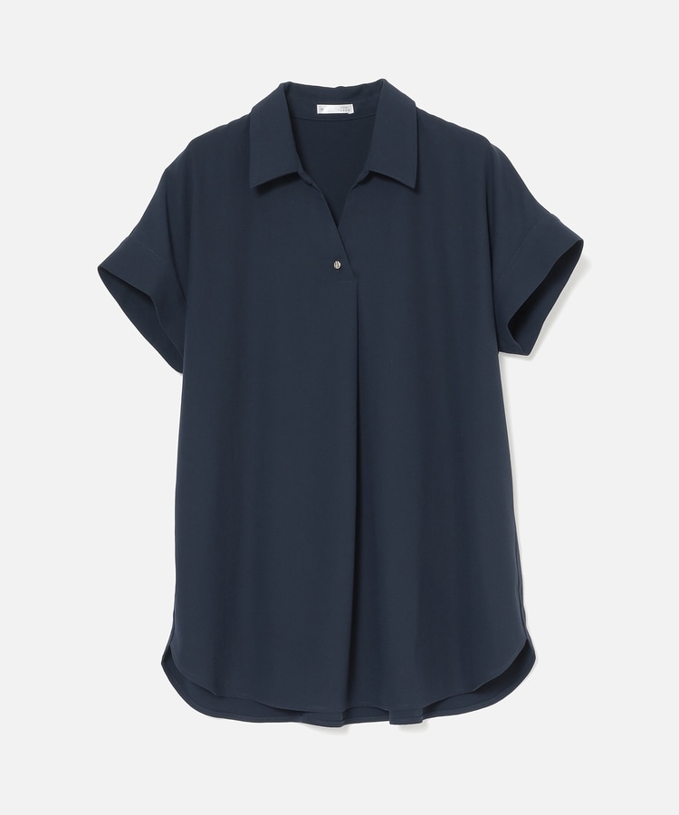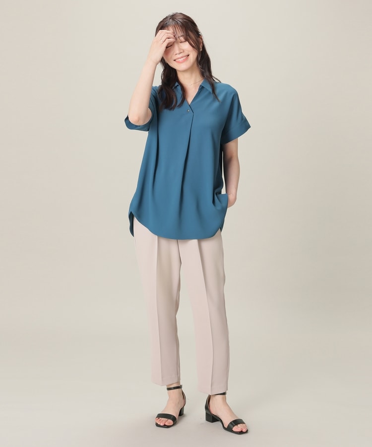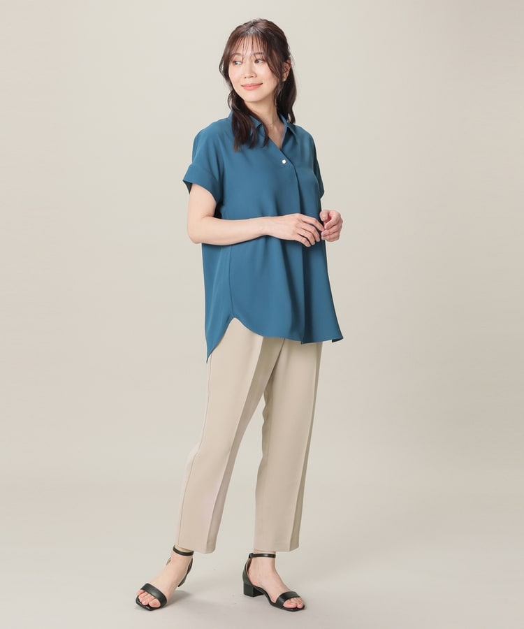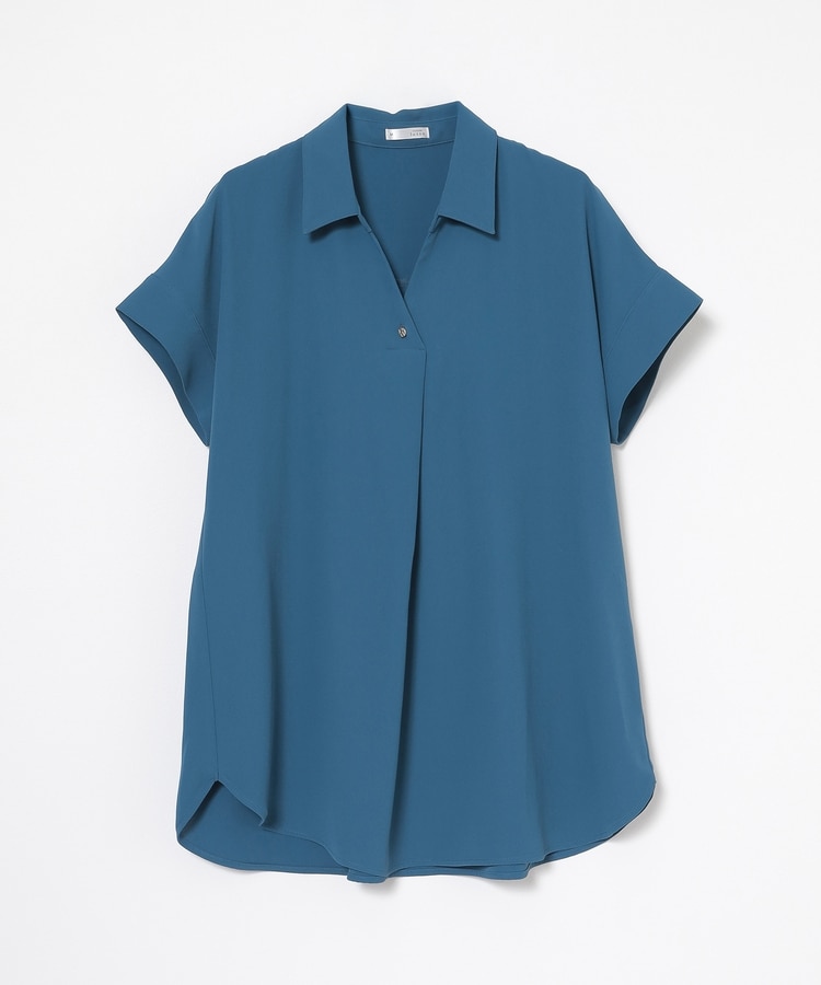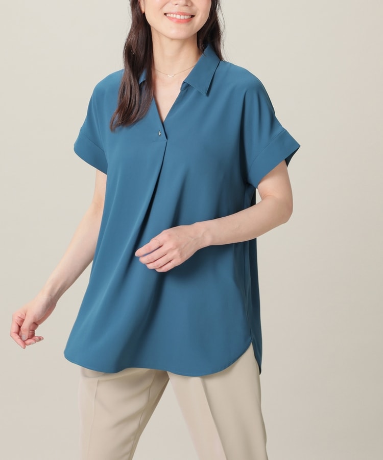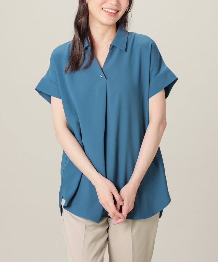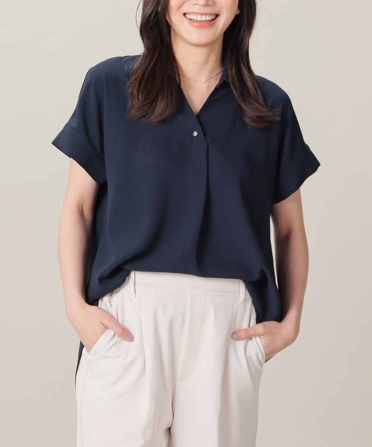 首元をすっきり見せるスキッパー衿が程よい抜け感を演出してくれる大人なデザイン。
