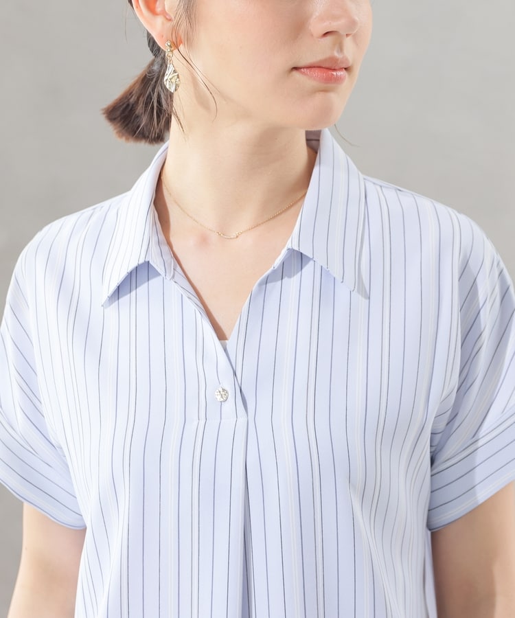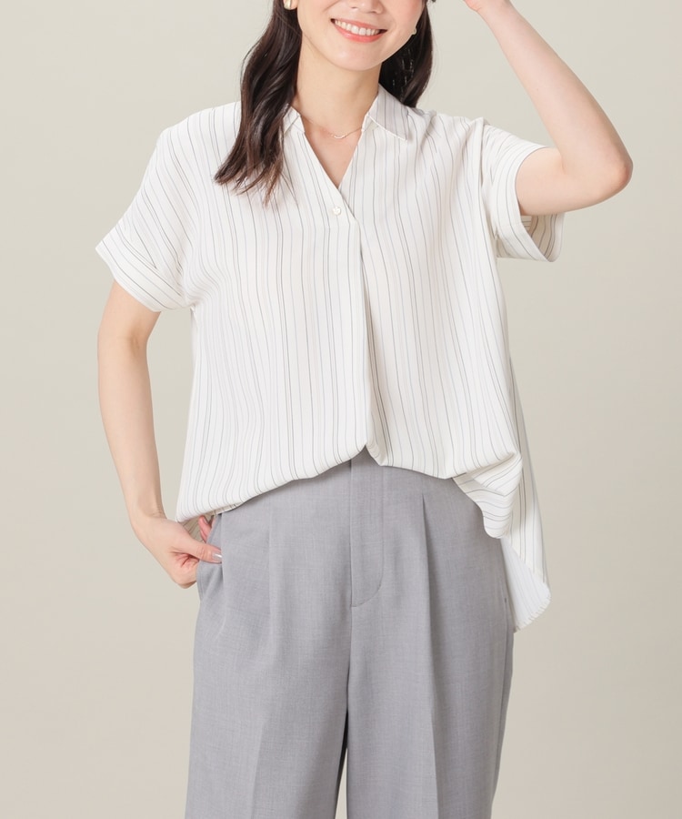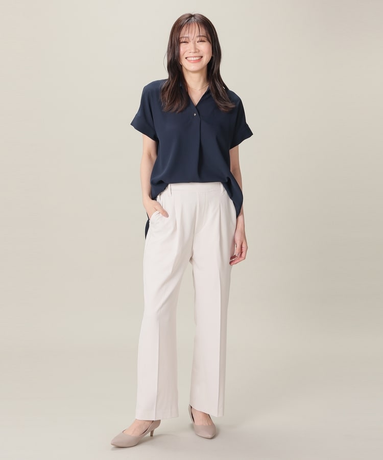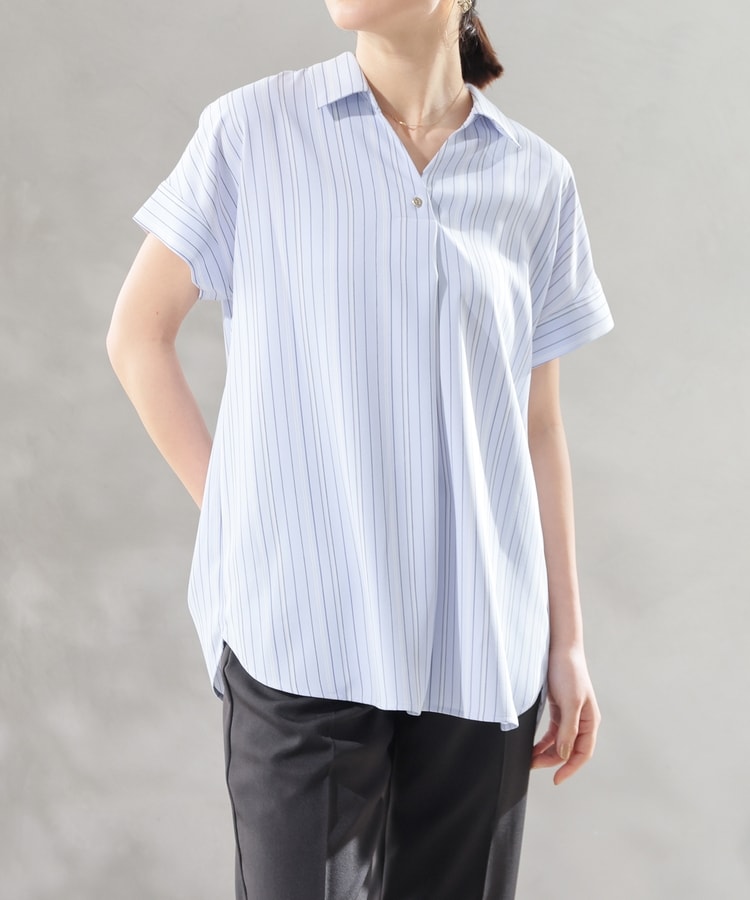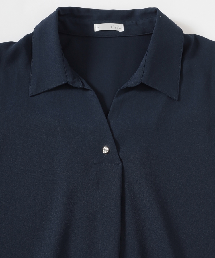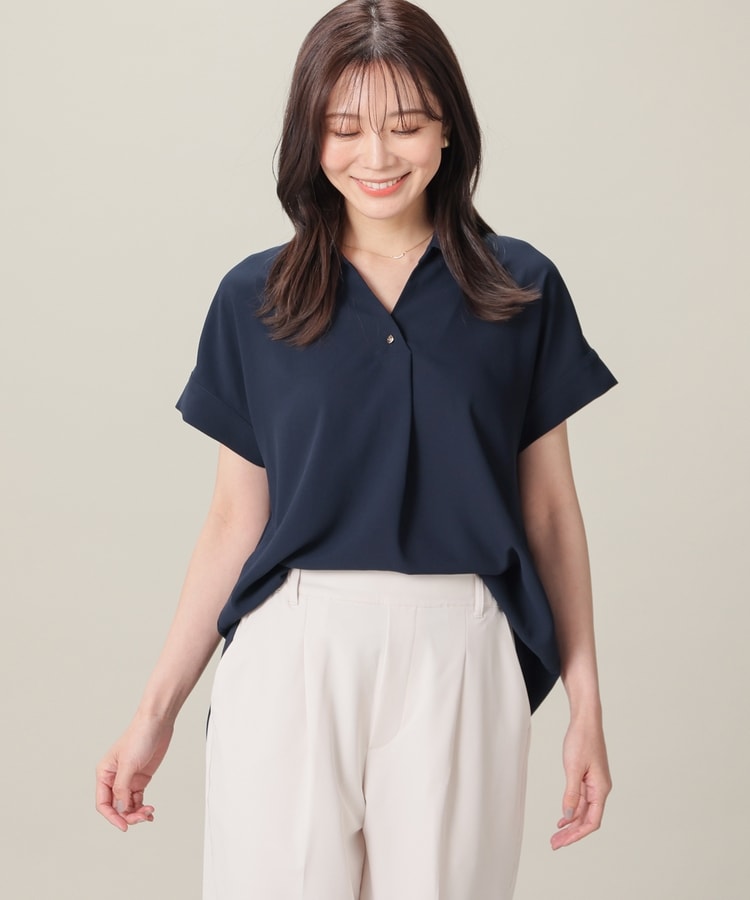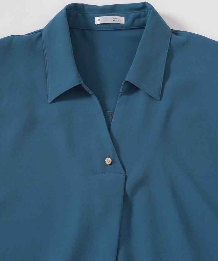 首元をすっきり見せるスキッパー衿が程よい抜け感を演出してくれる大人なデザイン。