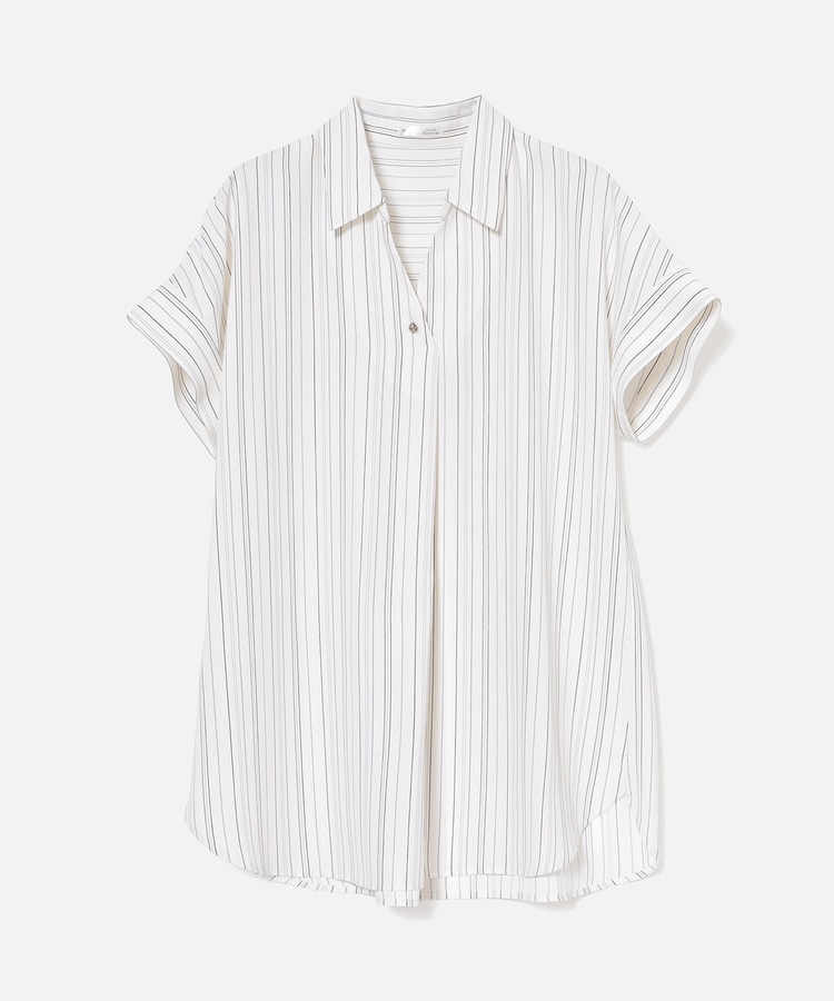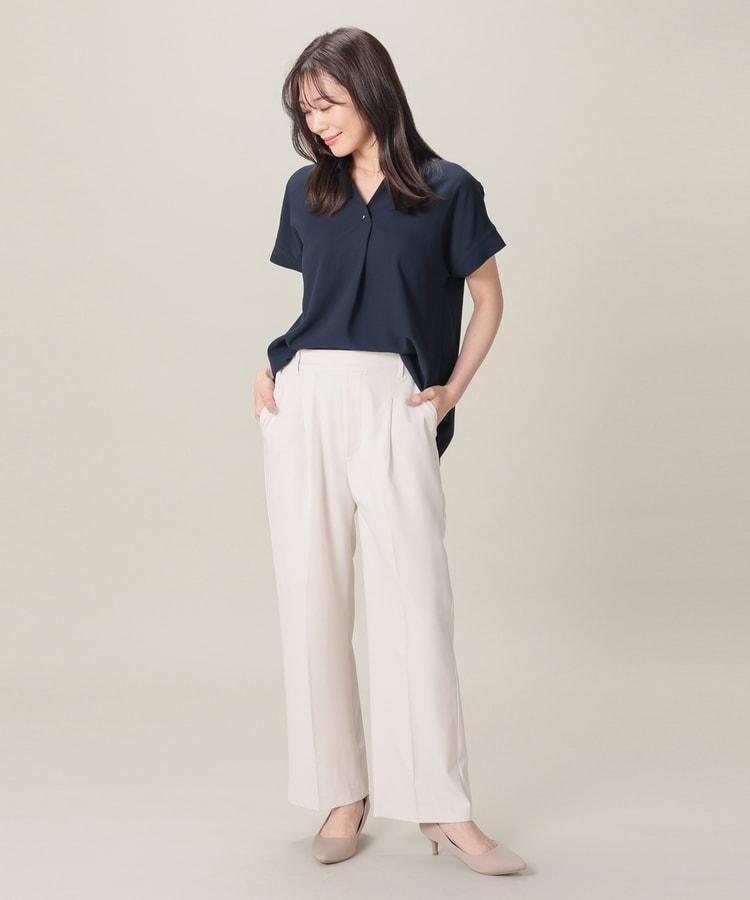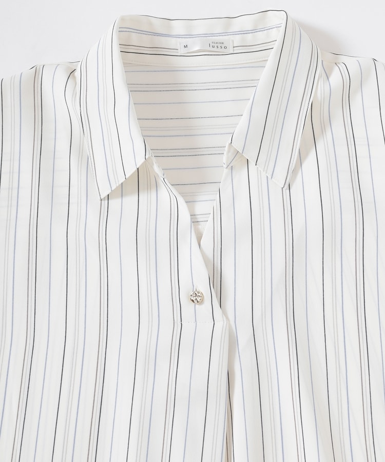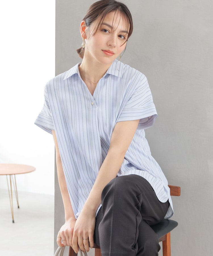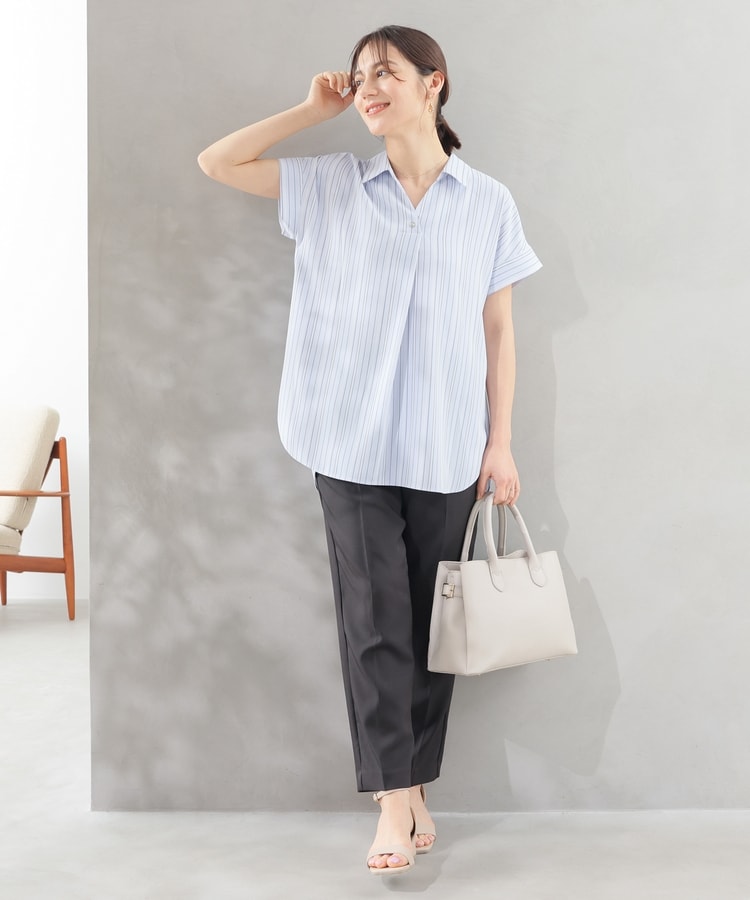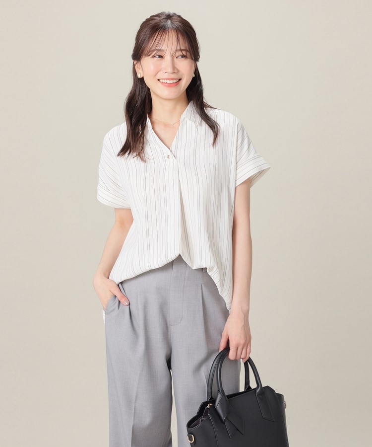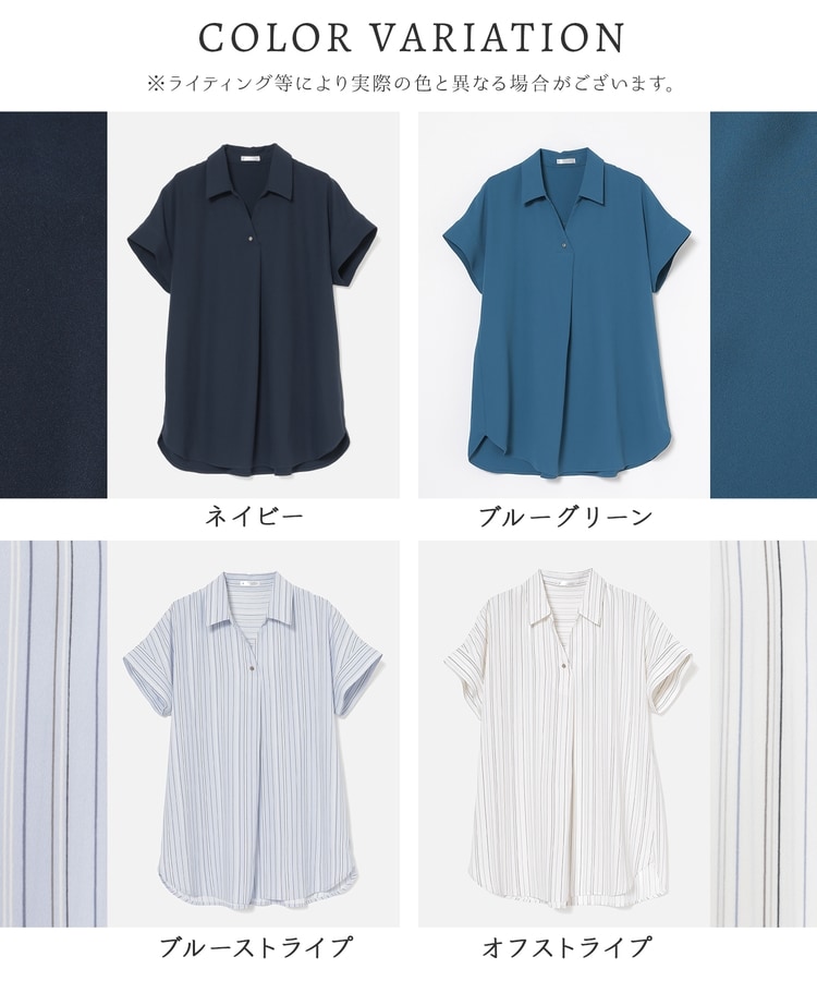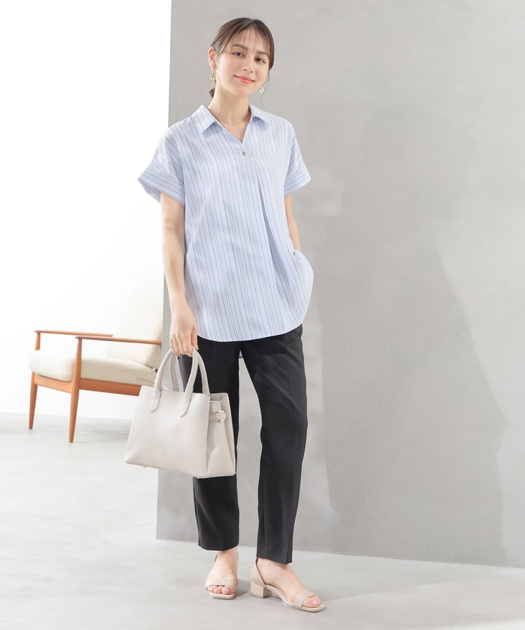 首元をすっきり見せるスキッパー衿が程よい抜け感を演出してくれる大人なデザイン。