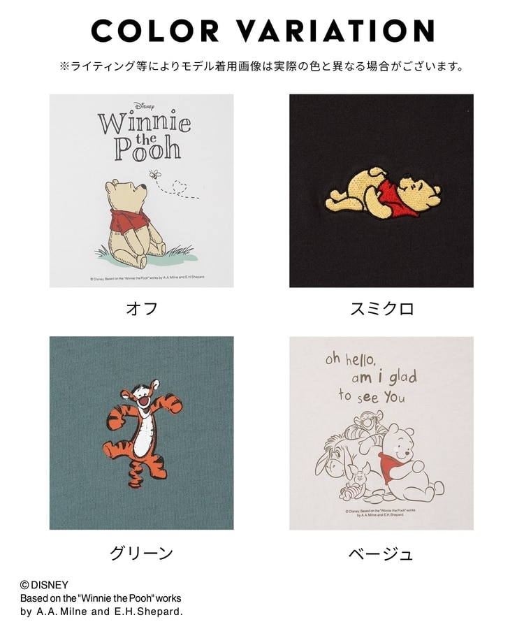 ディズニーキャラクター「プーさん」と仲間たちの刺繍やプリントが大人可愛いデザイン。