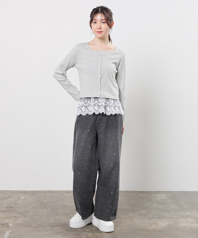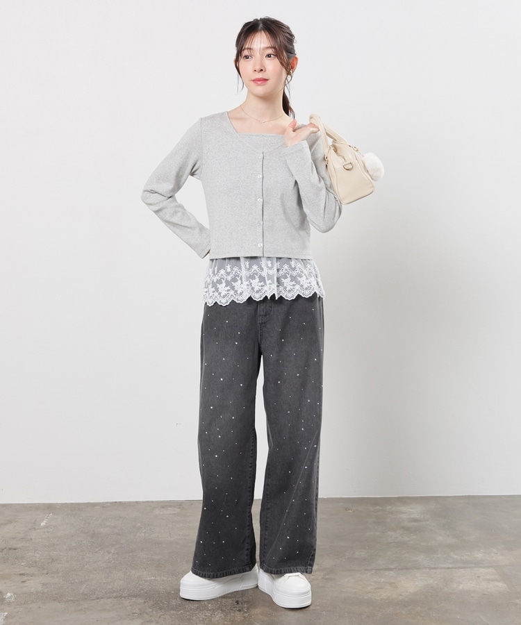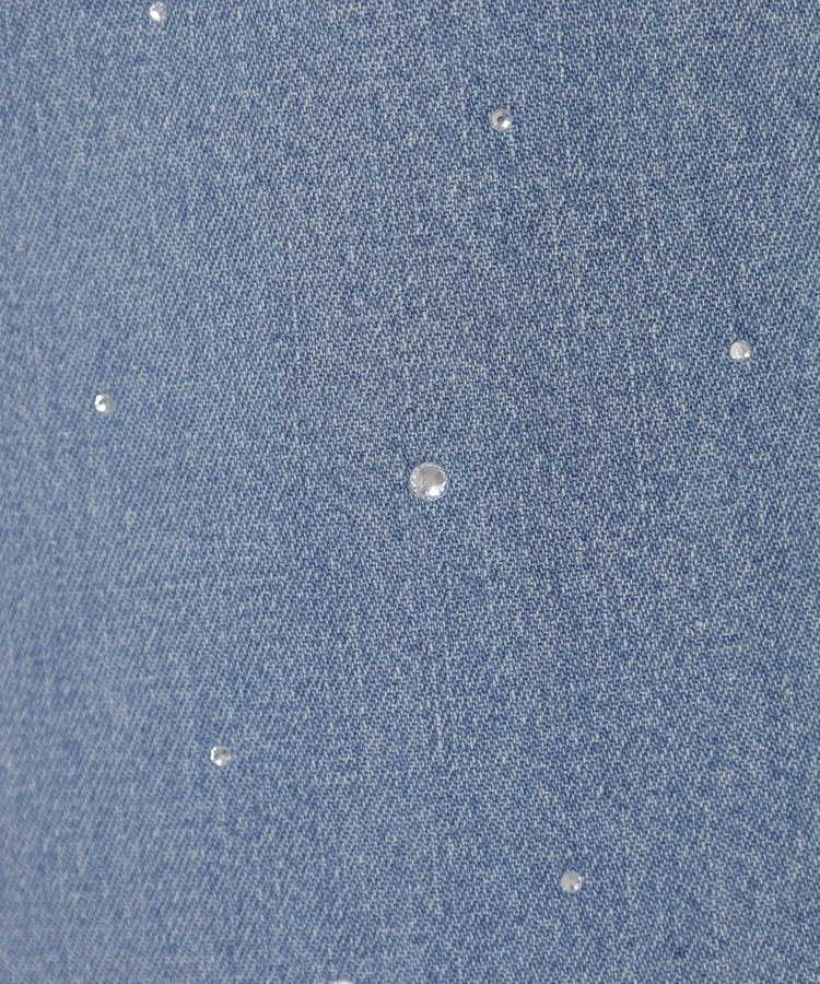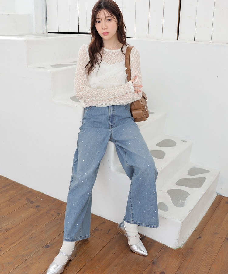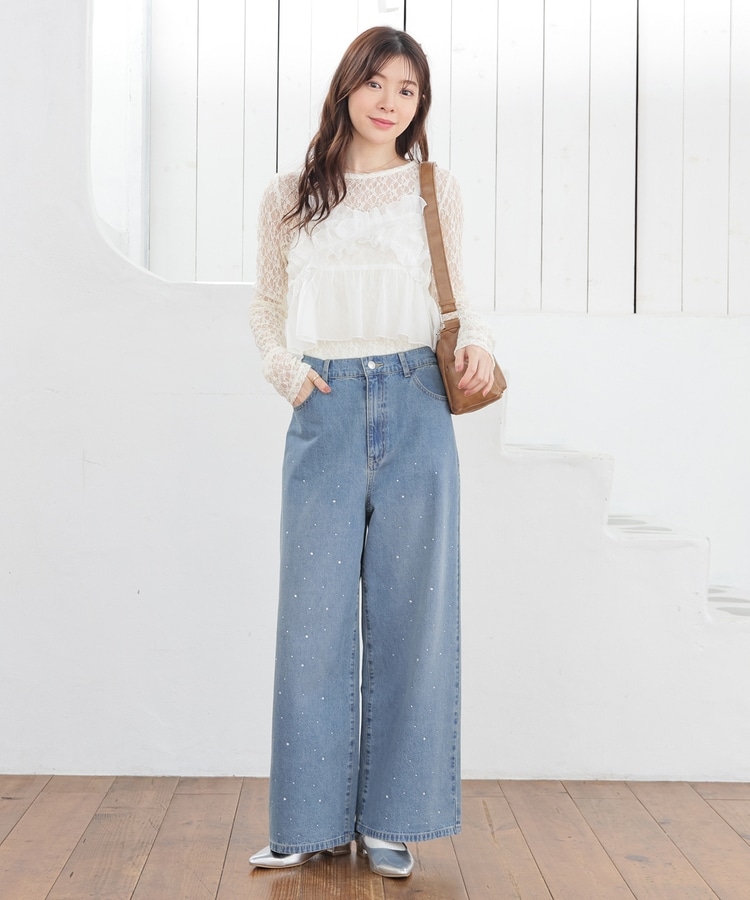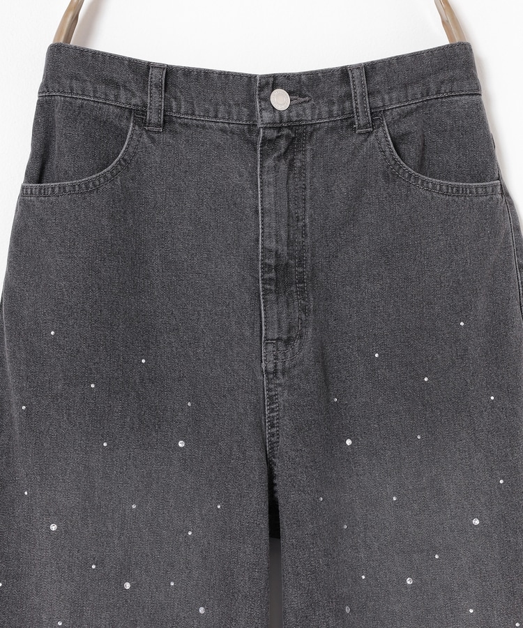 広がりすぎないワイドシルエットのデニムに、きらきらのラインストーンをちりばめた旬なデザイン。