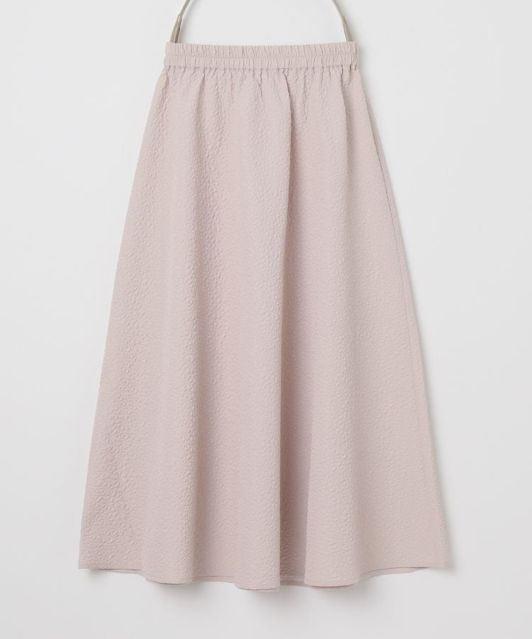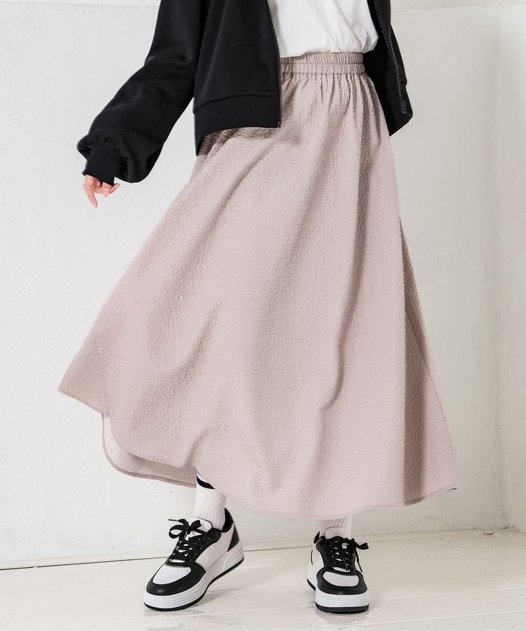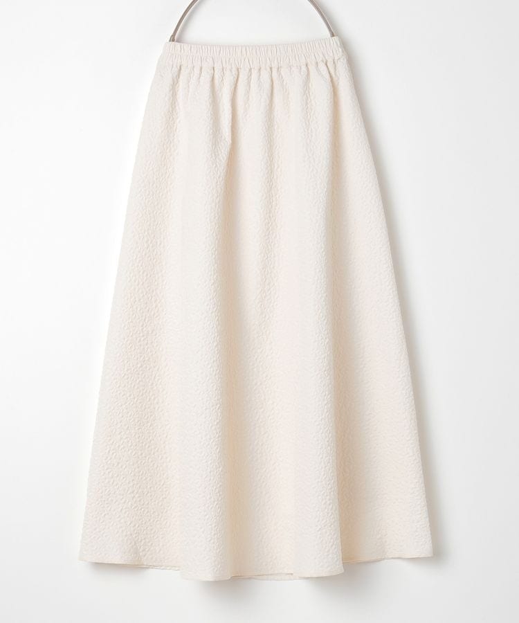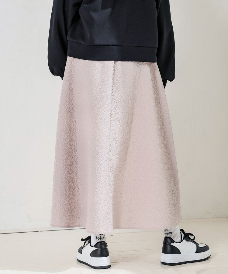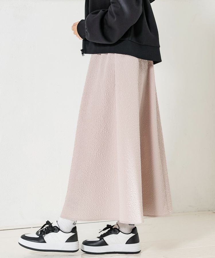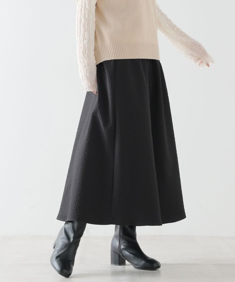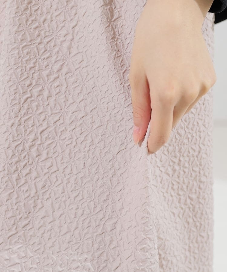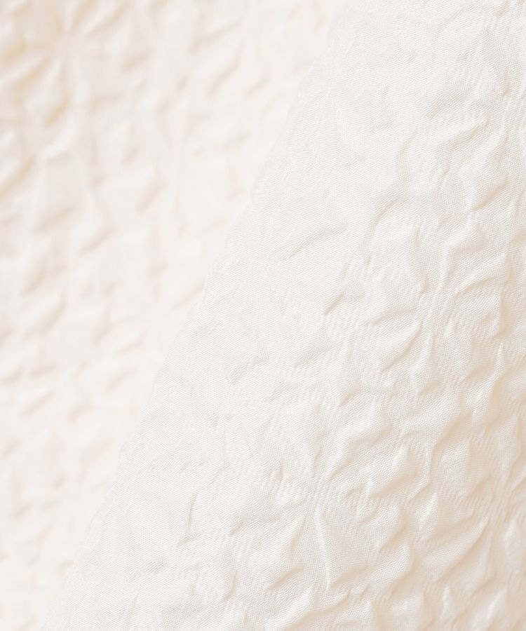 アクセントになるぽこぽこの花柄と、きれいなフレアシルエットがフェミニンなデザイン。