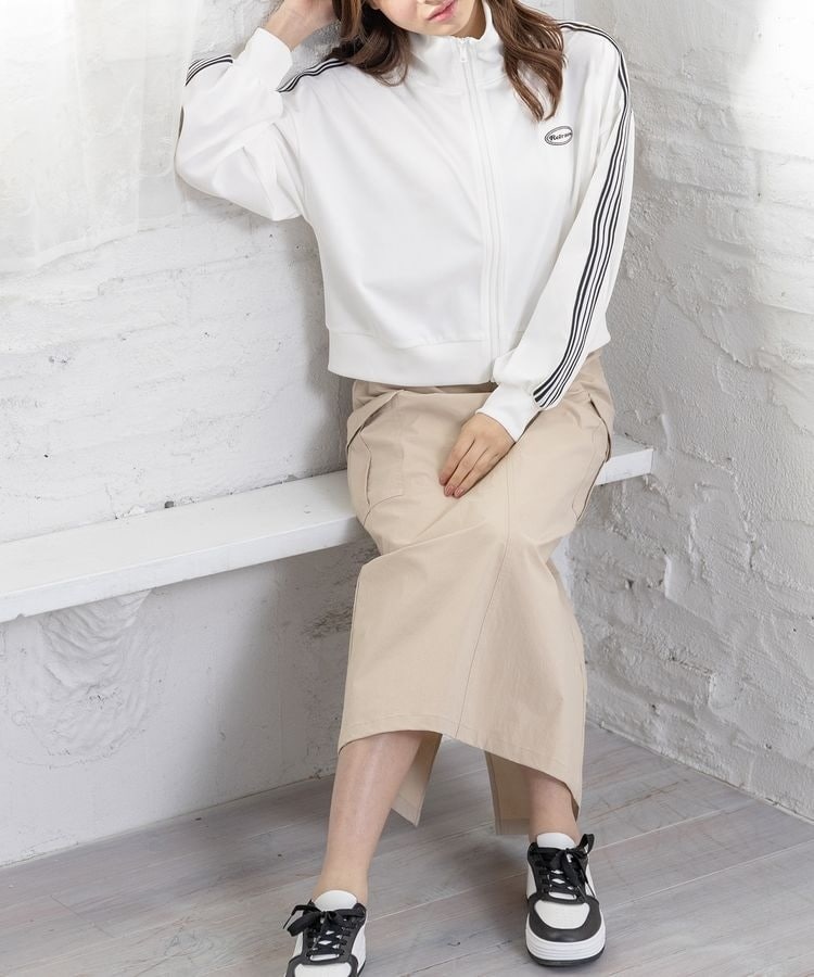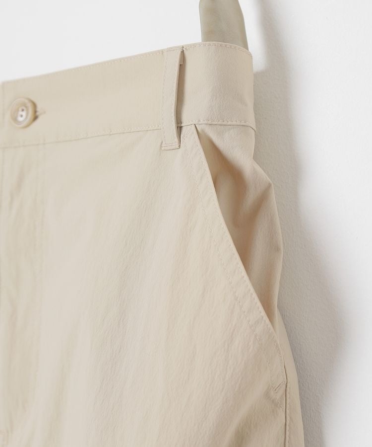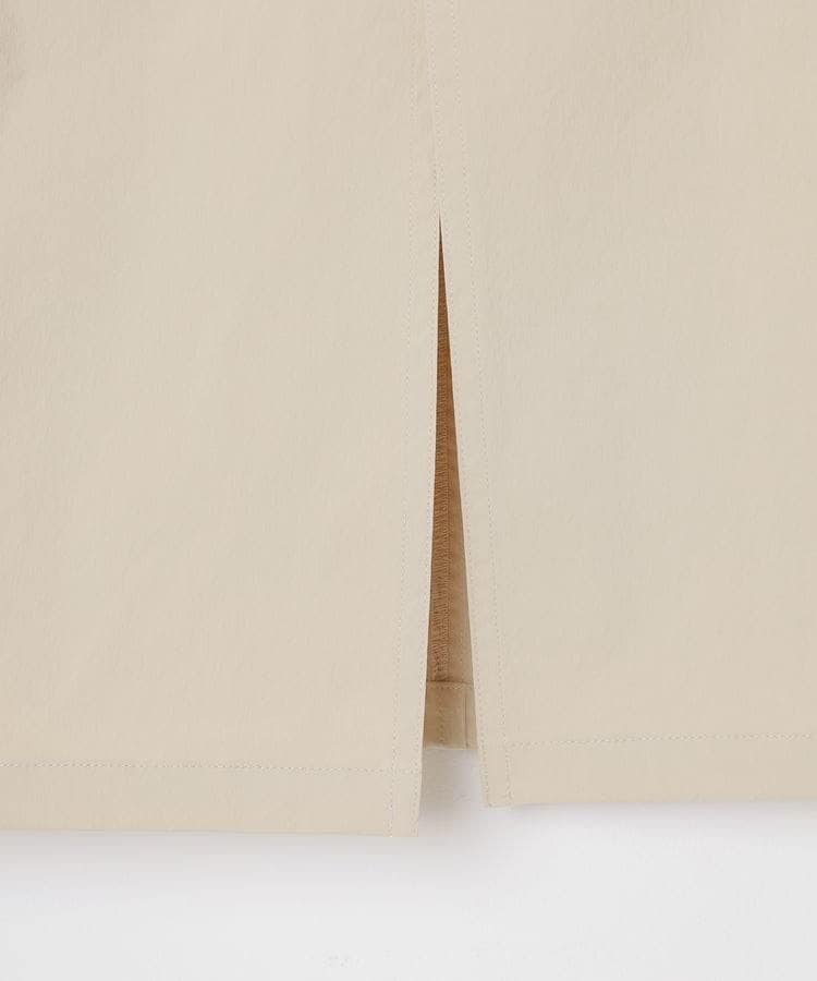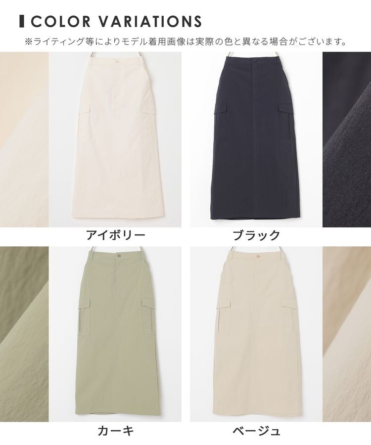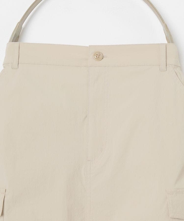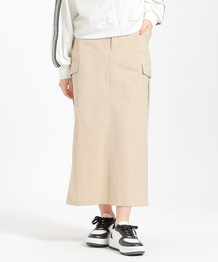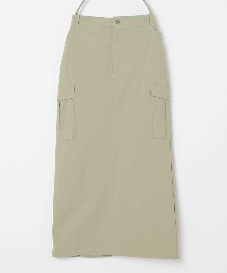 カジュアルになりがちなカーゴスカートに、Iラインシルエットでフェミニンな印象をプラス。