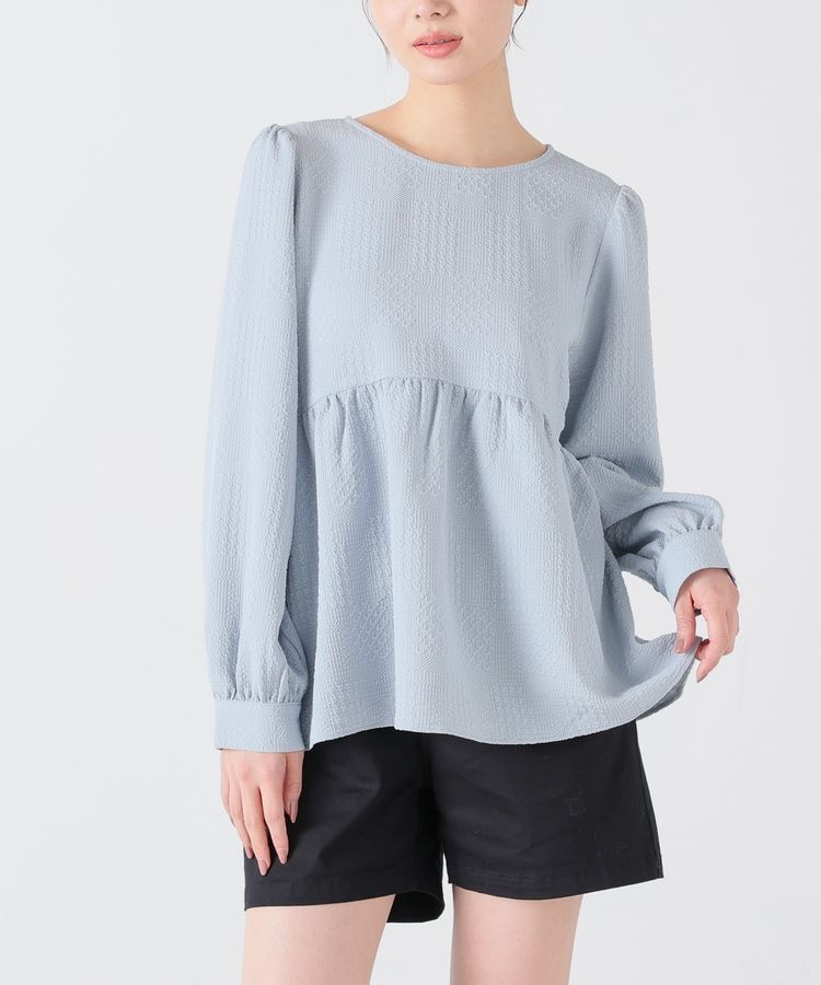 高めの切り替え位置からふんわり広がるペプラムシルエットで、体型カバーも叶うデザイン。