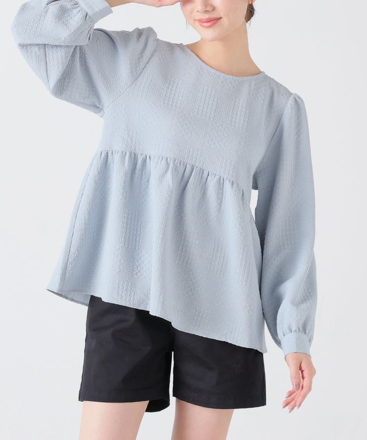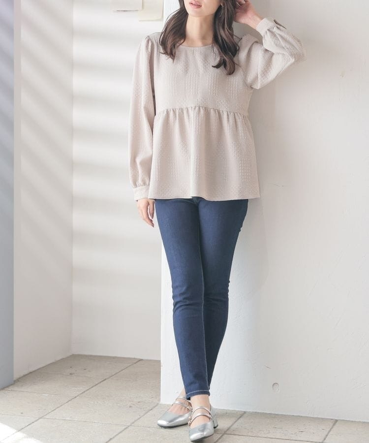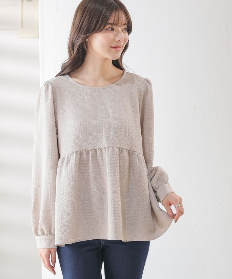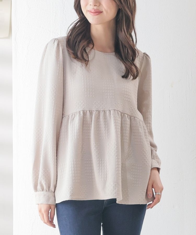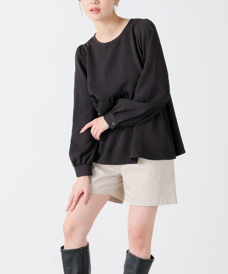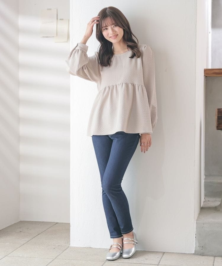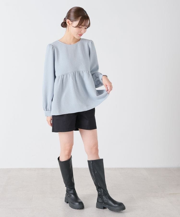 高めの切り替え位置からふんわり広がるペプラムシルエットで、体型カバーも叶うデザイン。