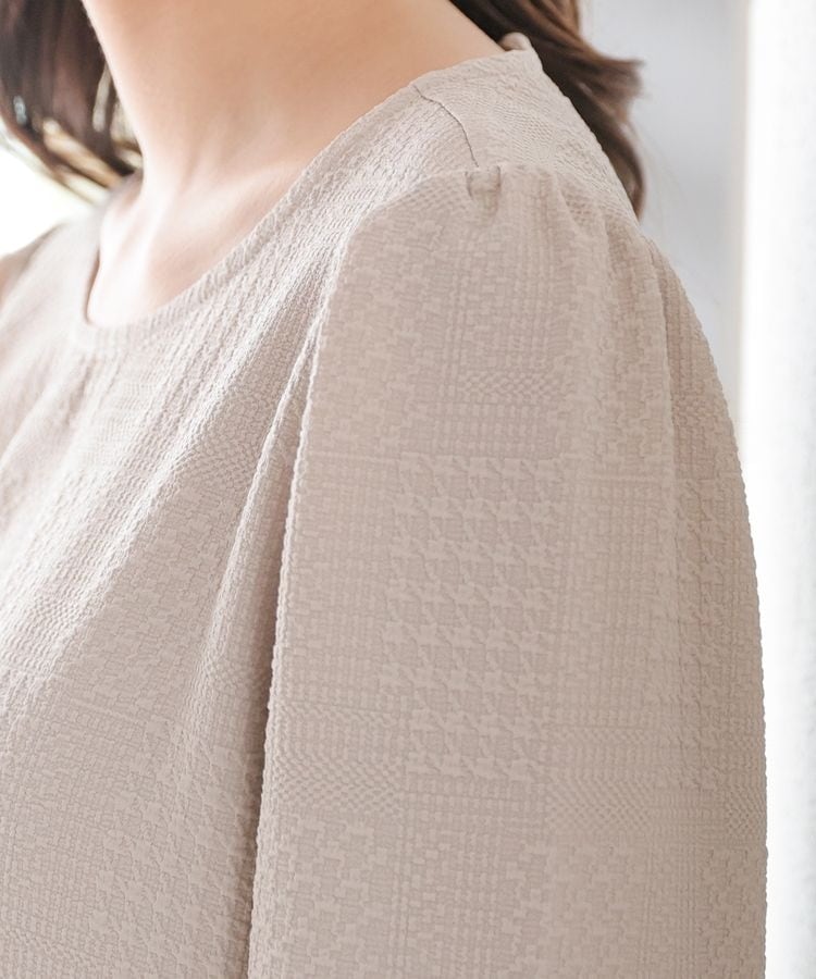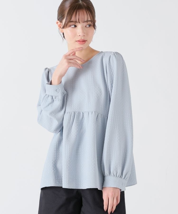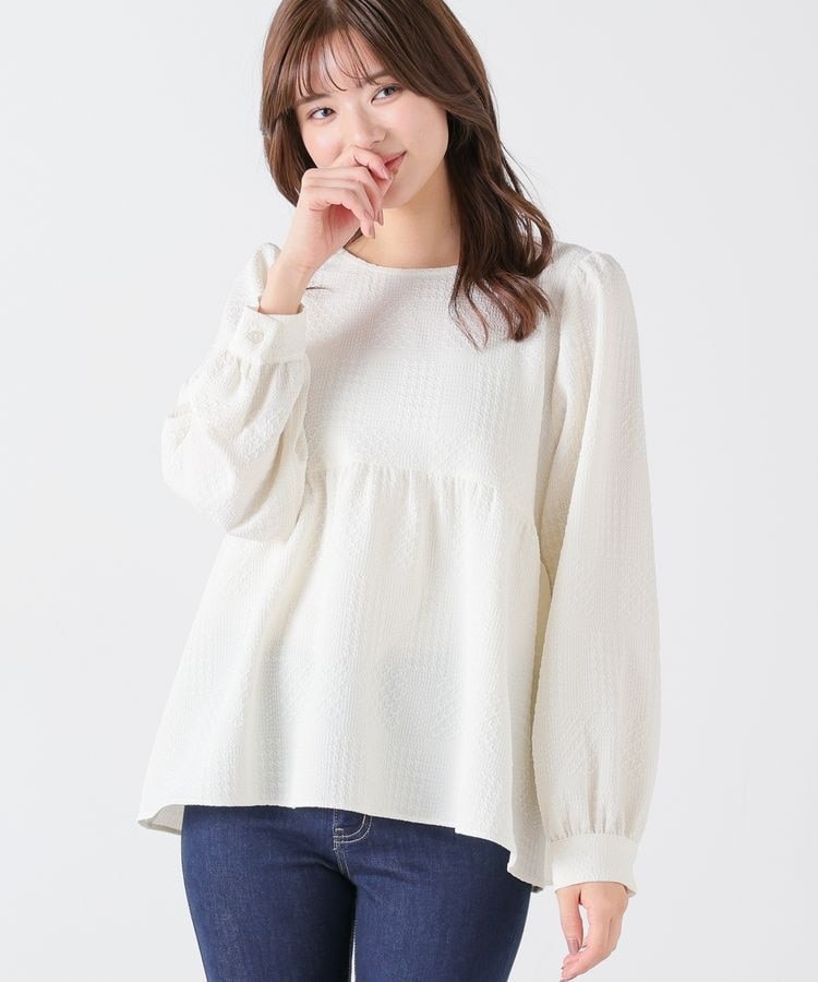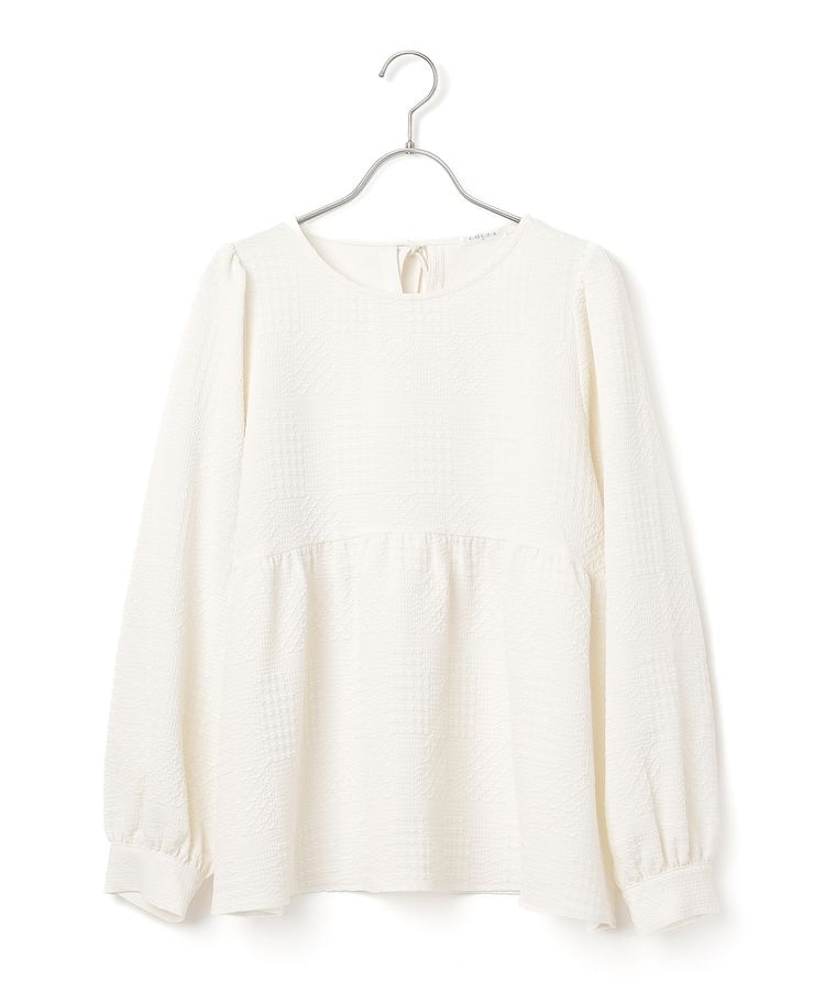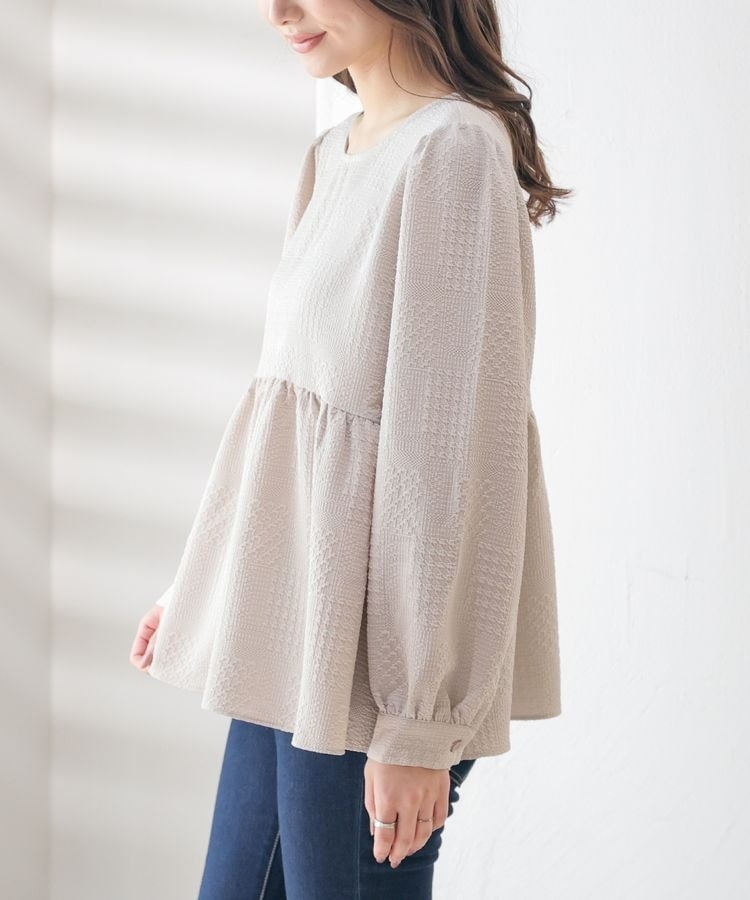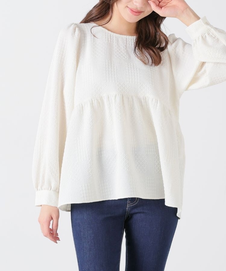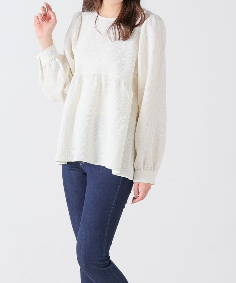 高めの切り替え位置からふんわり広がるペプラムシルエットで、体型カバーも叶うデザイン。