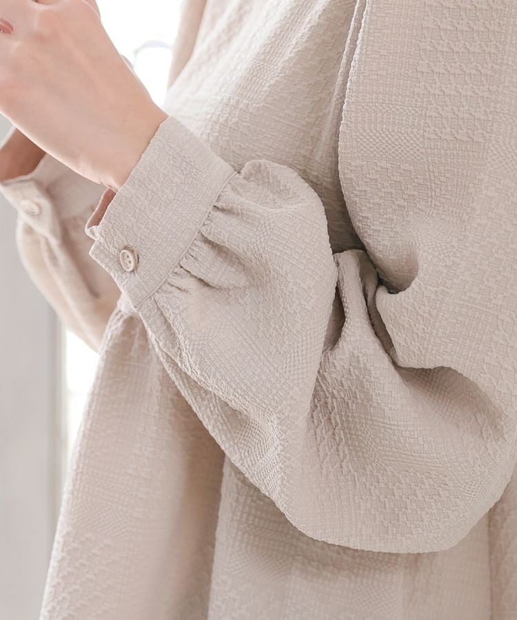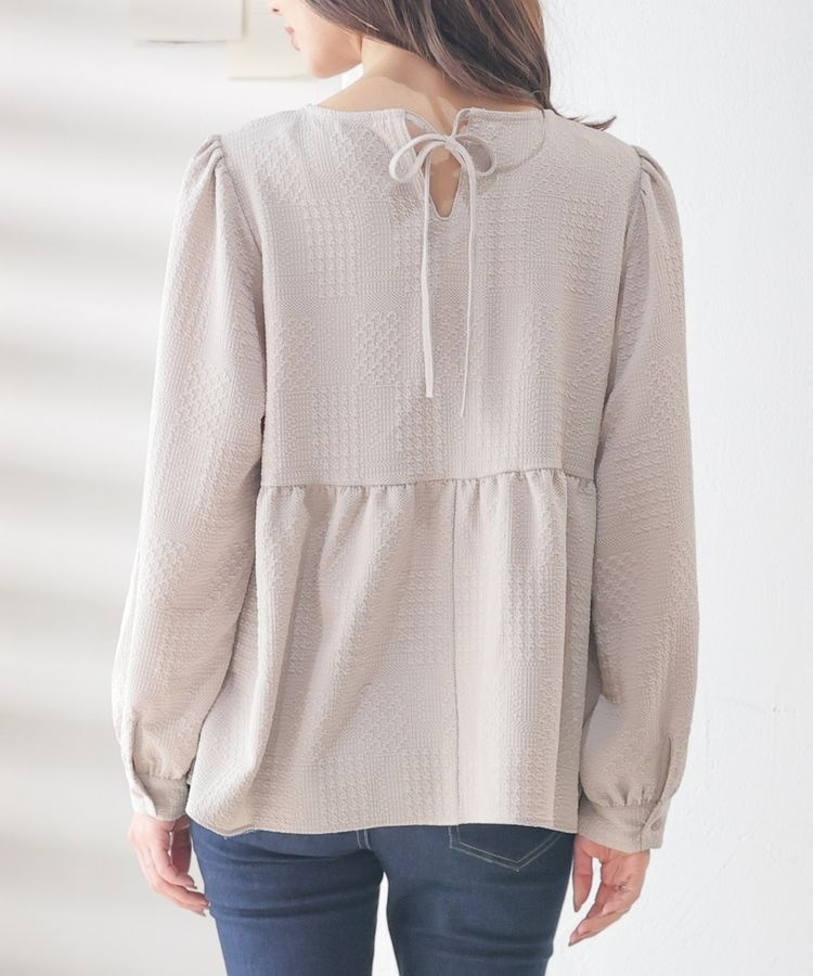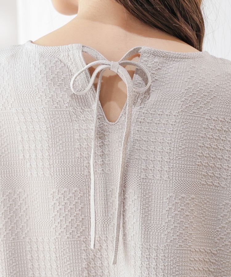 後ろリボンとボリューム袖でフェミニン感アップ。