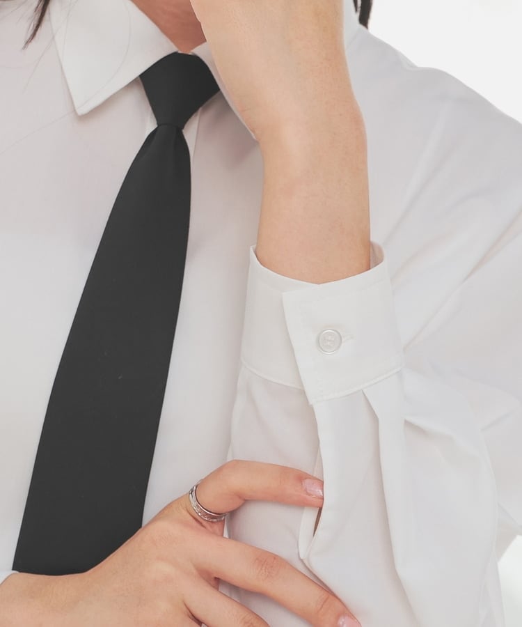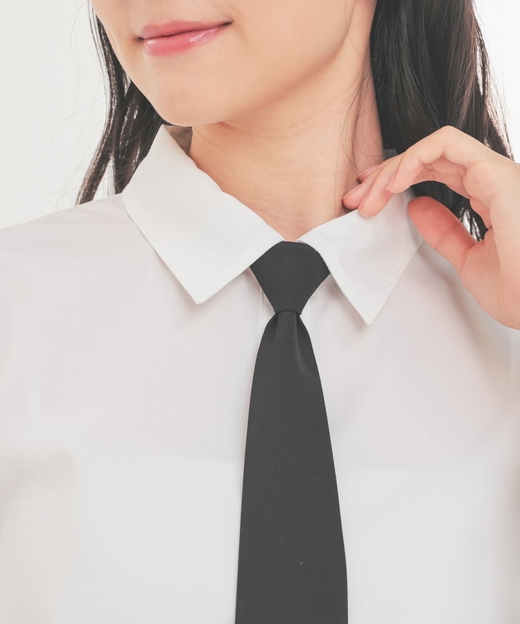 ネクタイはワンタッチプラ具で簡単に着け外しできる結び目固定タイプ。