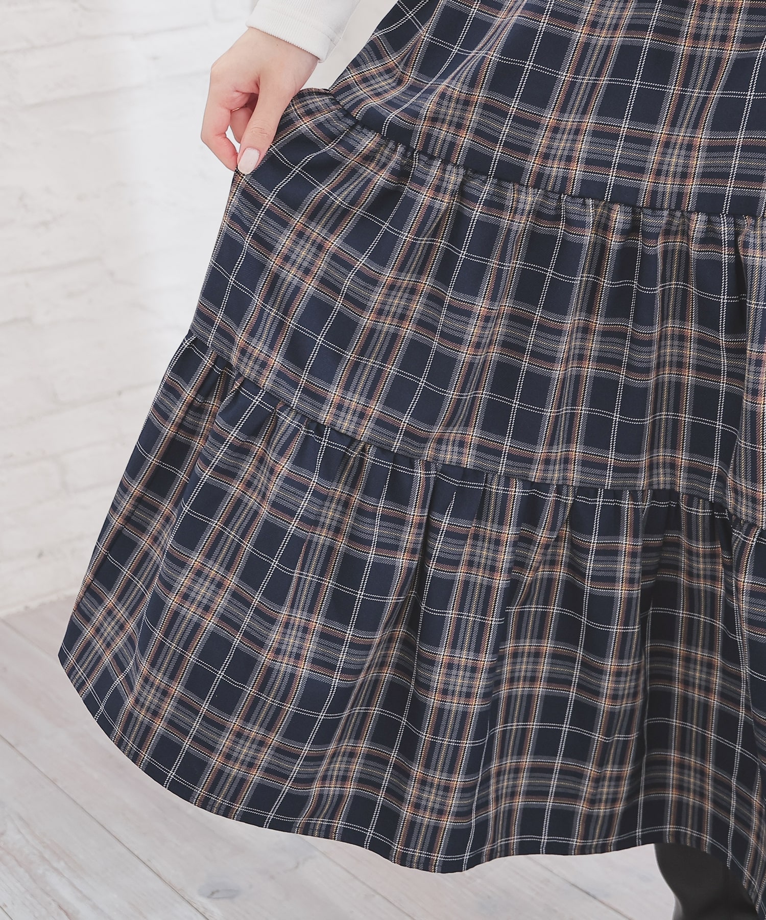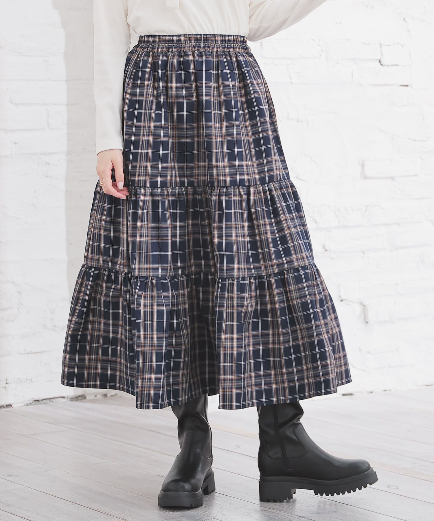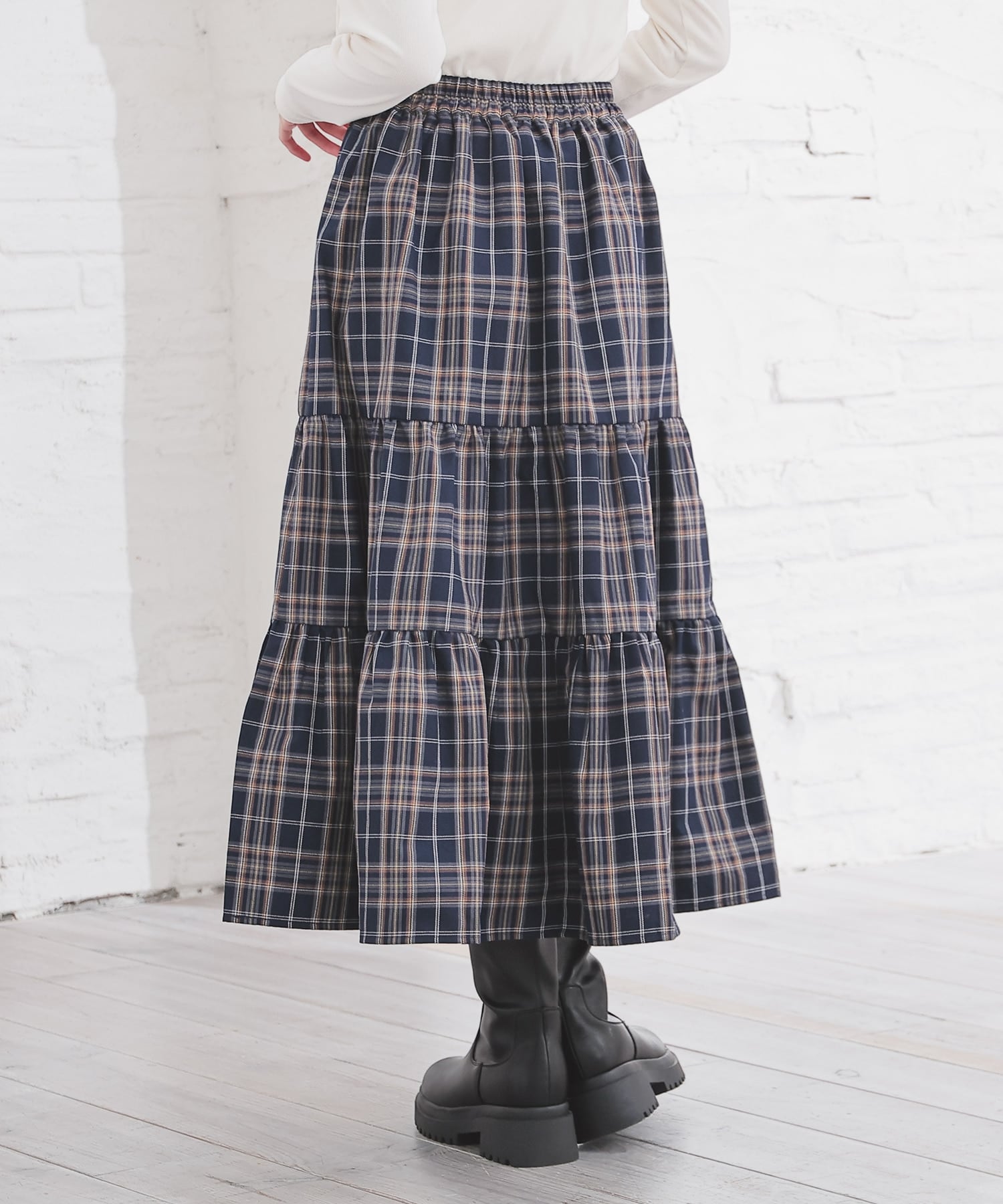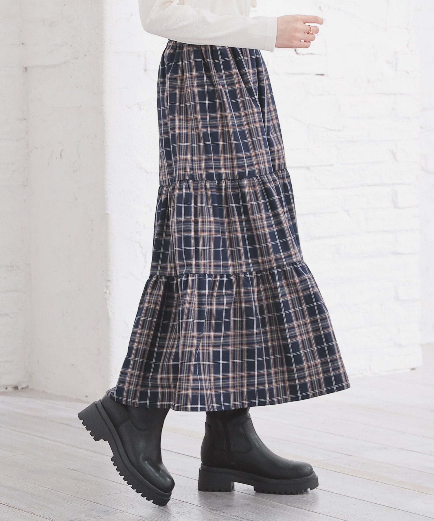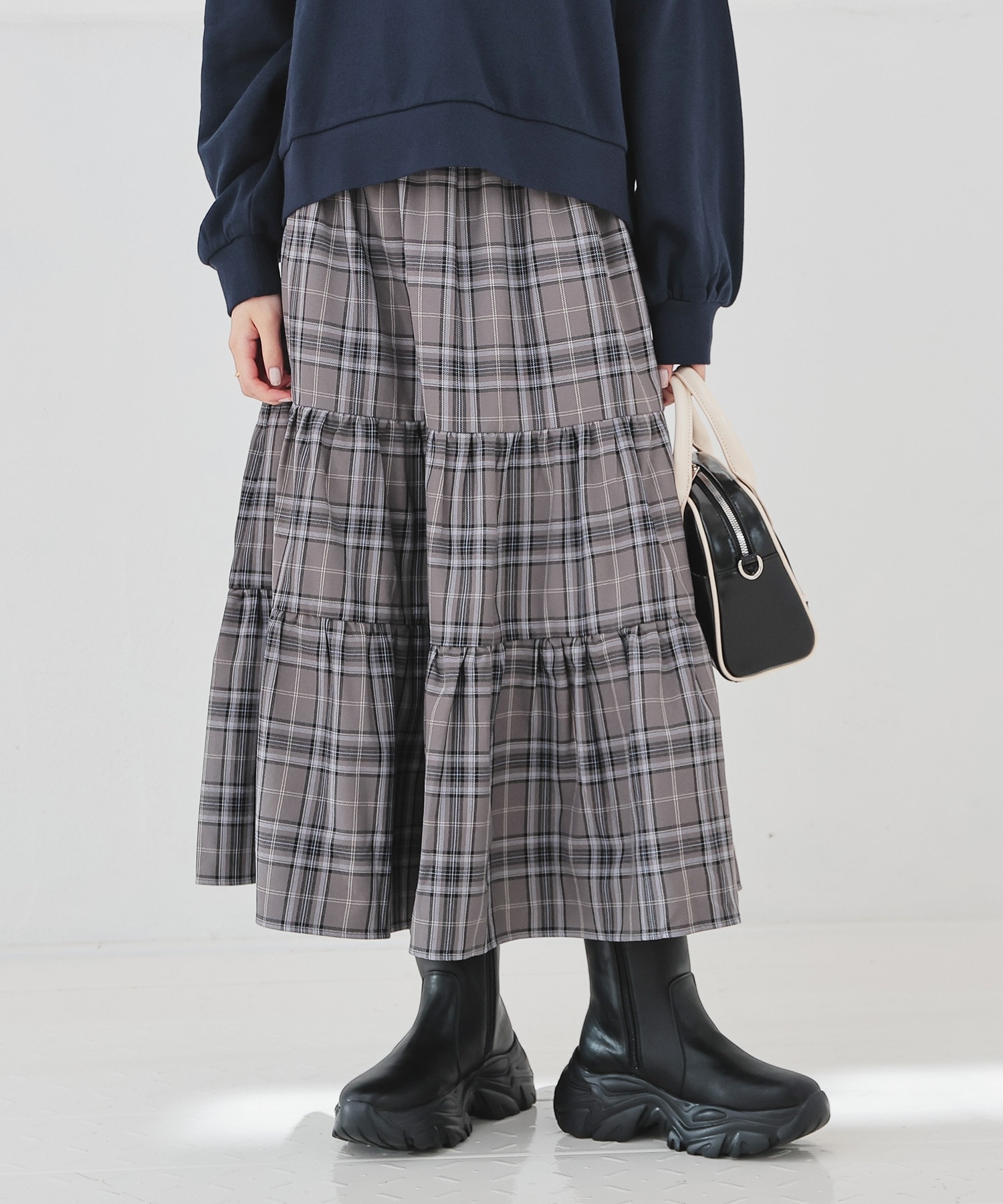 ふんわり広がるボリュームたっぷりのティアードシルエットとチェック柄がコーデの主役になるデザイン。