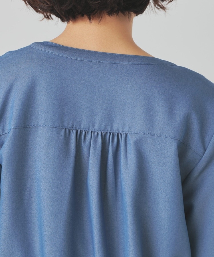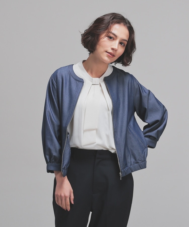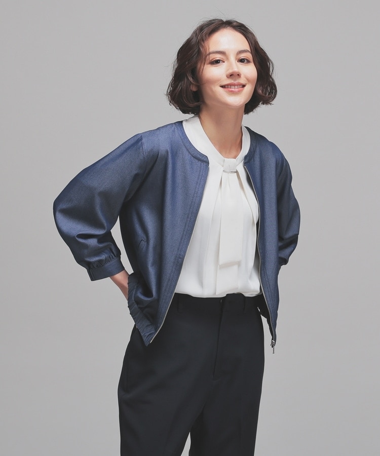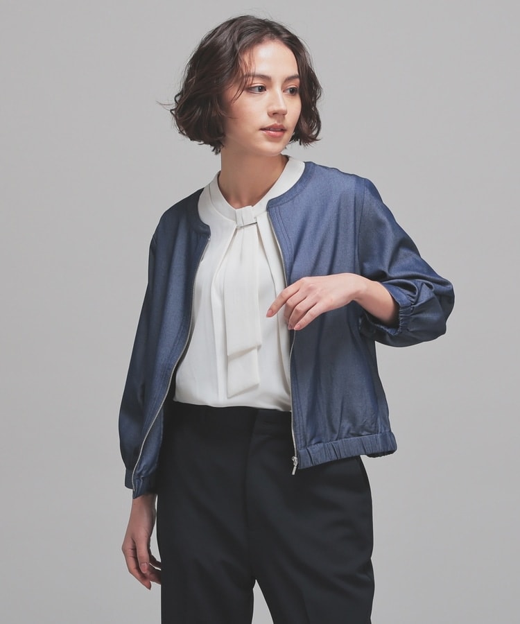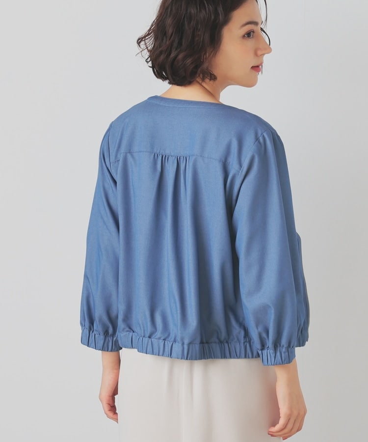 トレンドのデニム風素材をノーカラーの衿元やふんわり袖でフェミニンな雰囲気に。