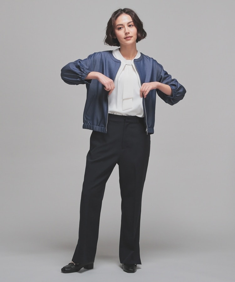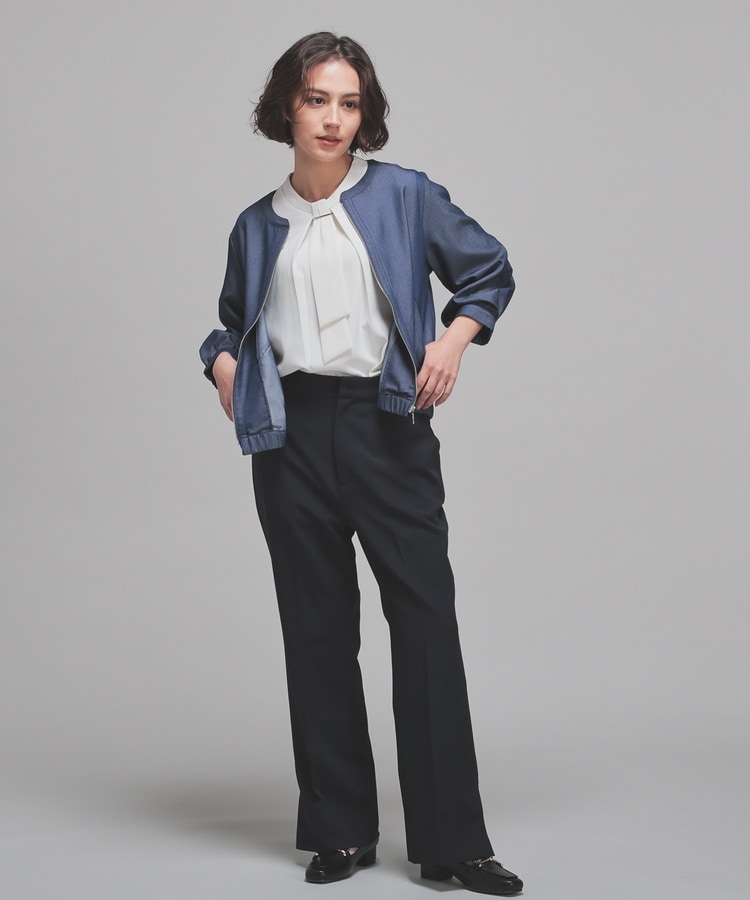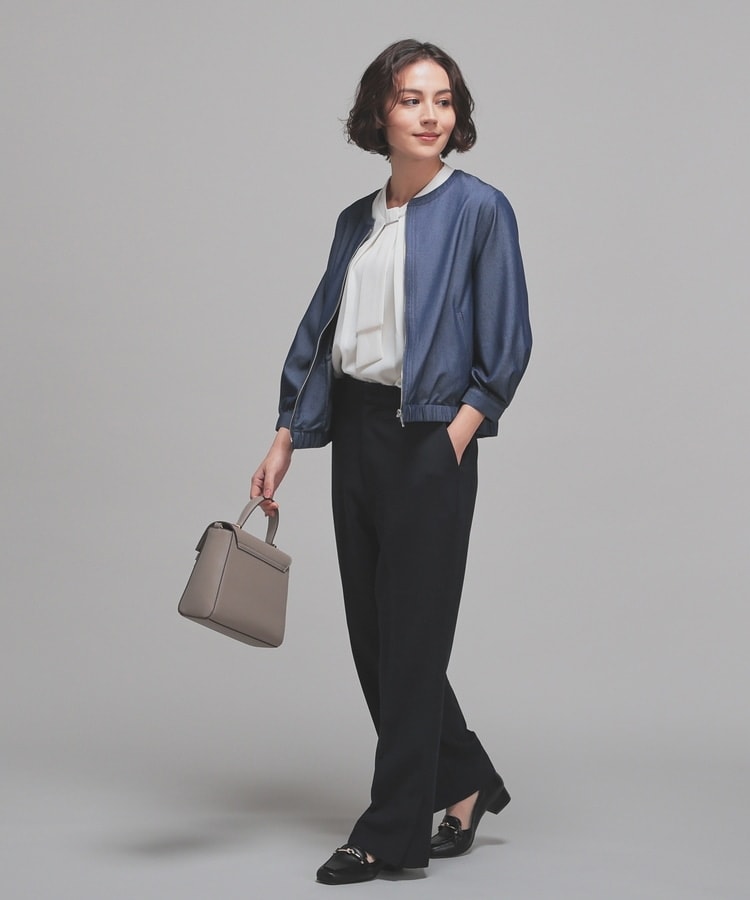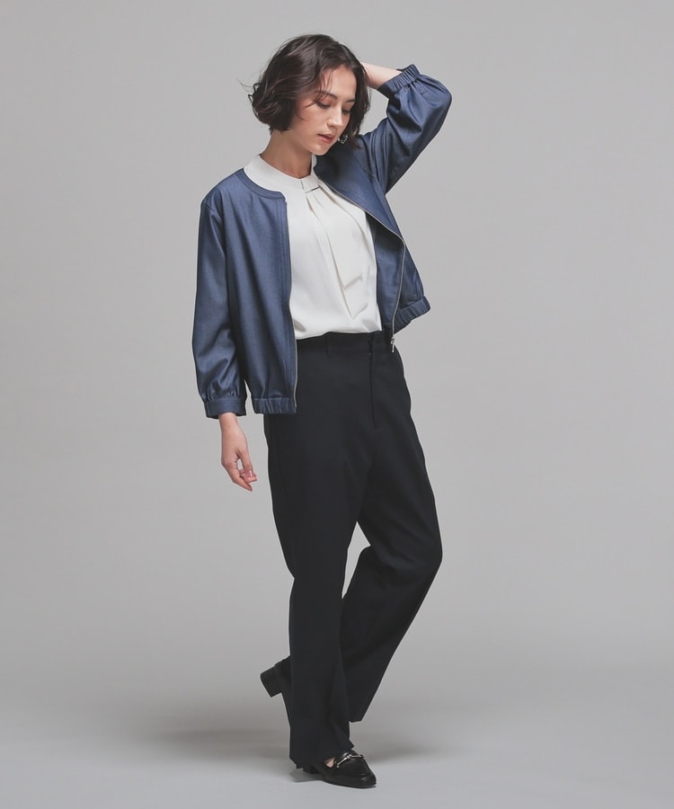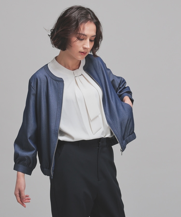 トレンドのデニム風素材をノーカラーの衿元やふんわり袖でフェミニンな雰囲気に。