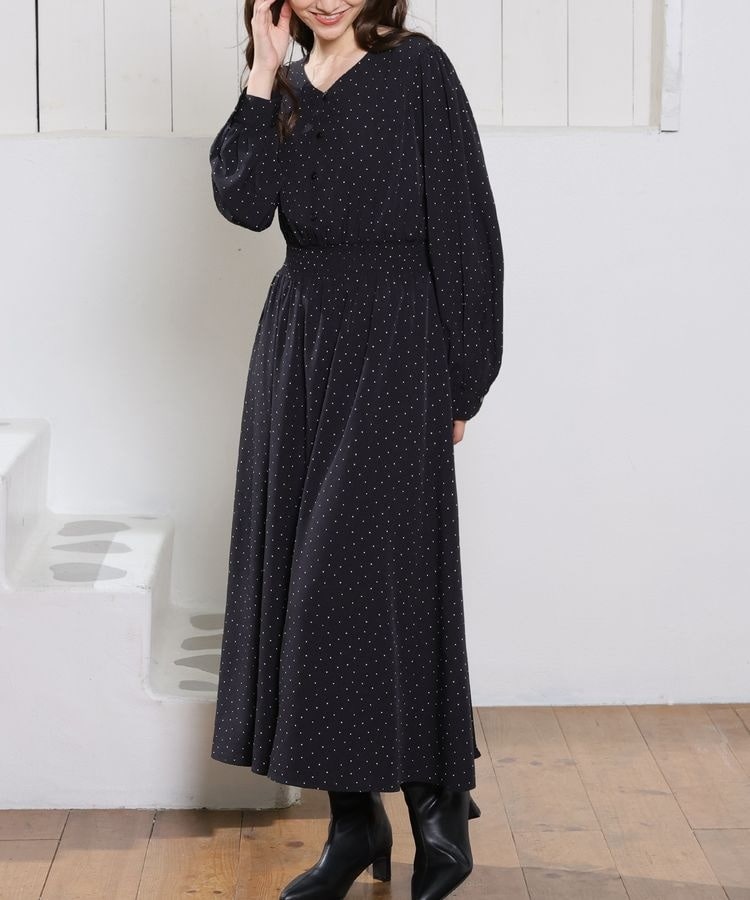 ふんわり広がるフレアラインにウエストのゴムシャーリングで、スタイルアップも叶うメリハリシルエット。