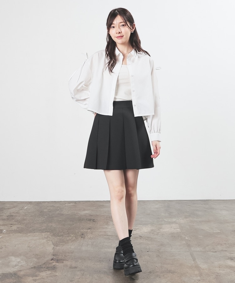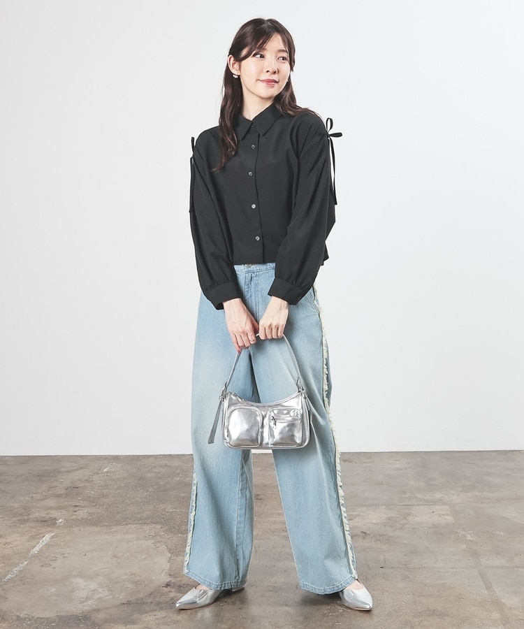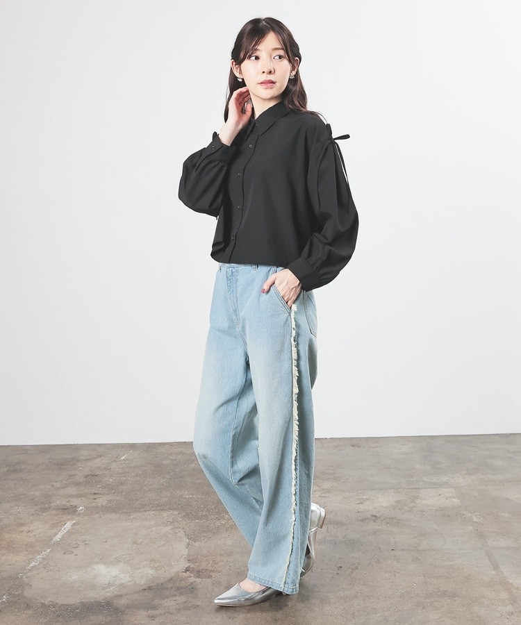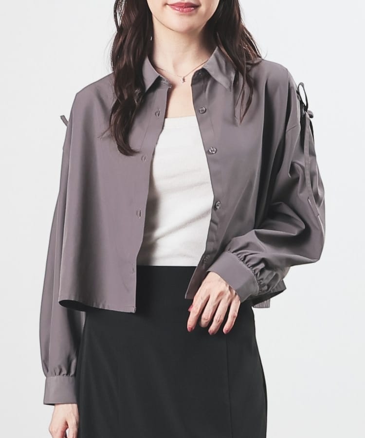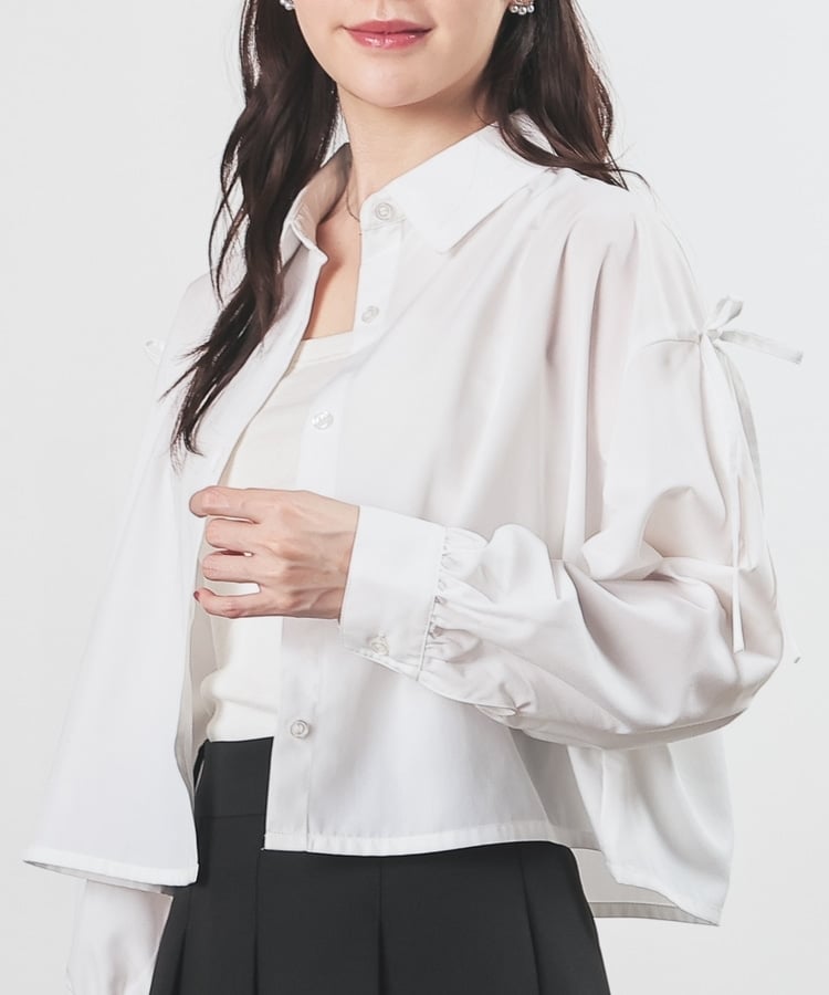 シンプルなレギュラーカラーに肩のリボンがキュートなデザイン。