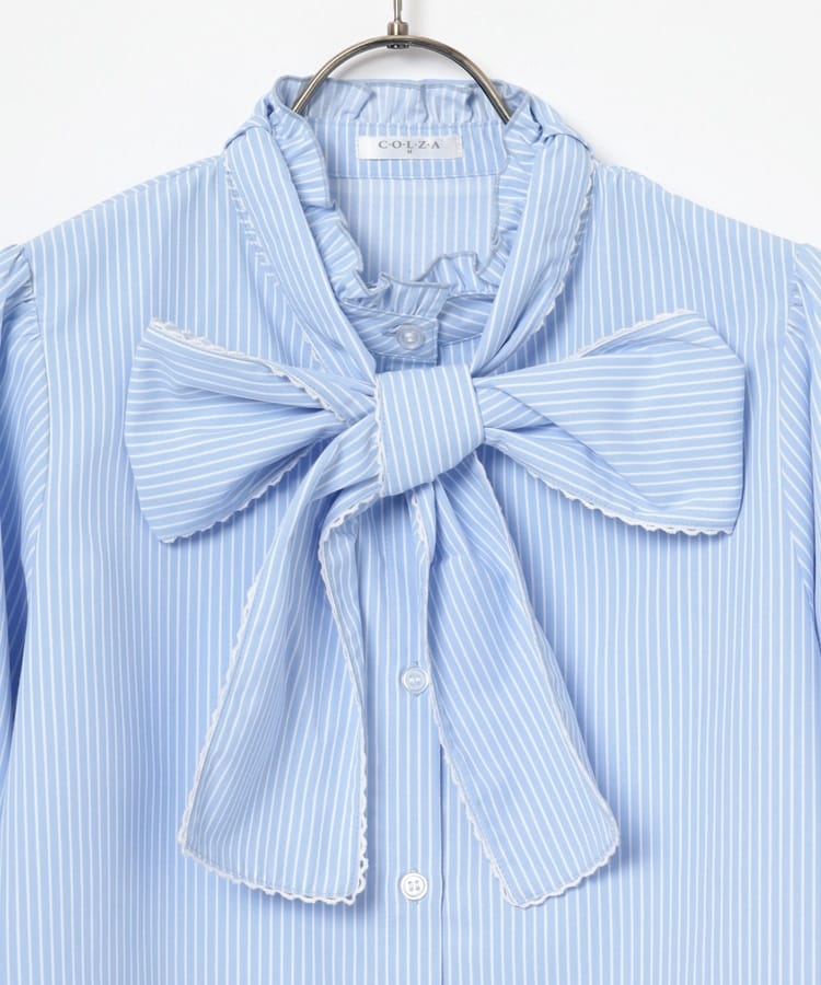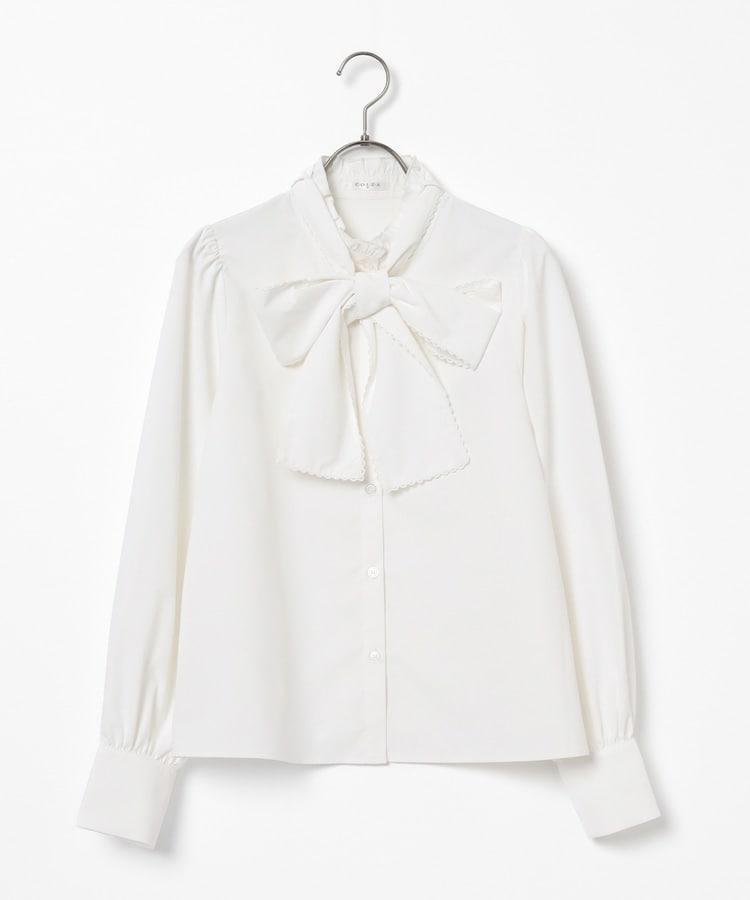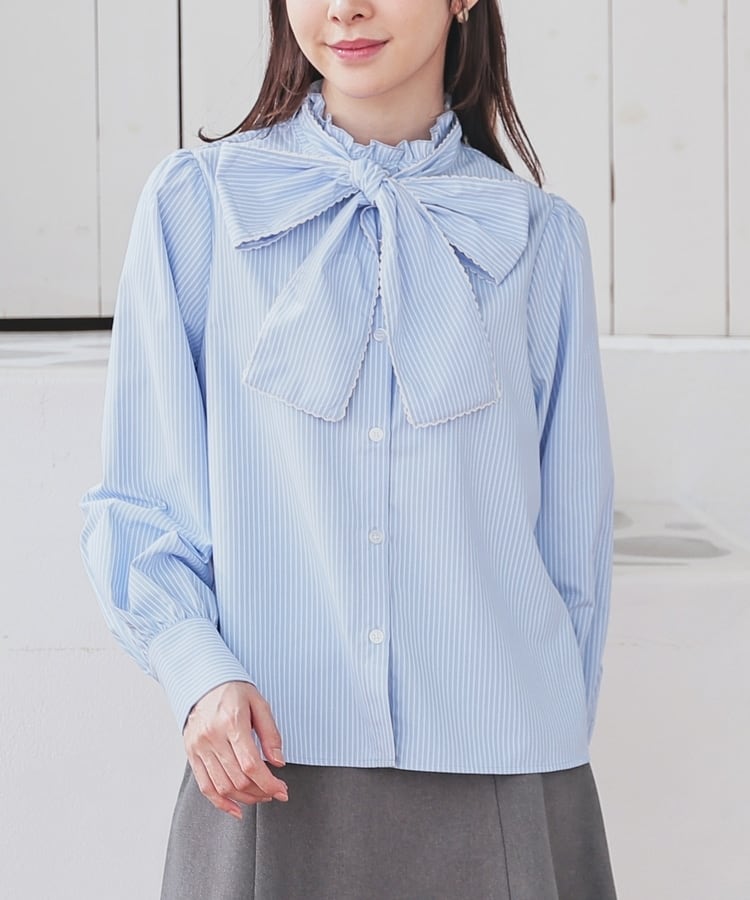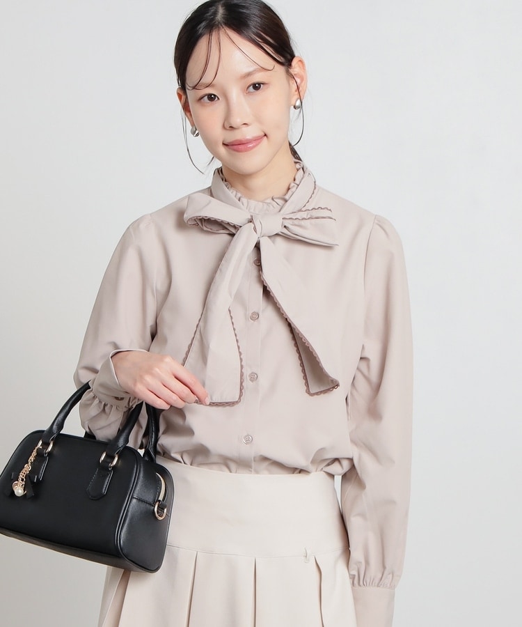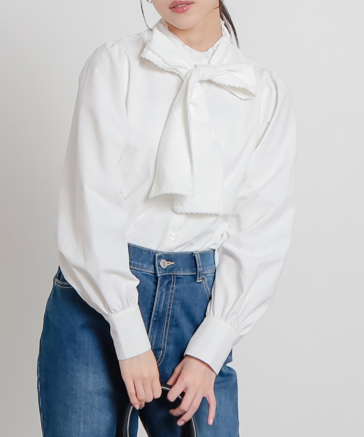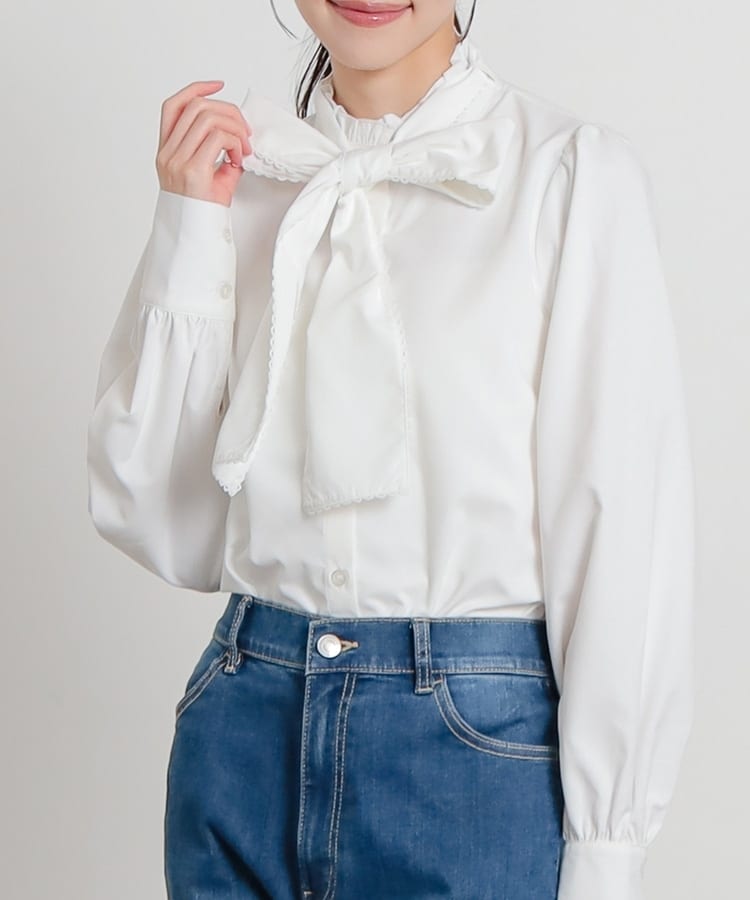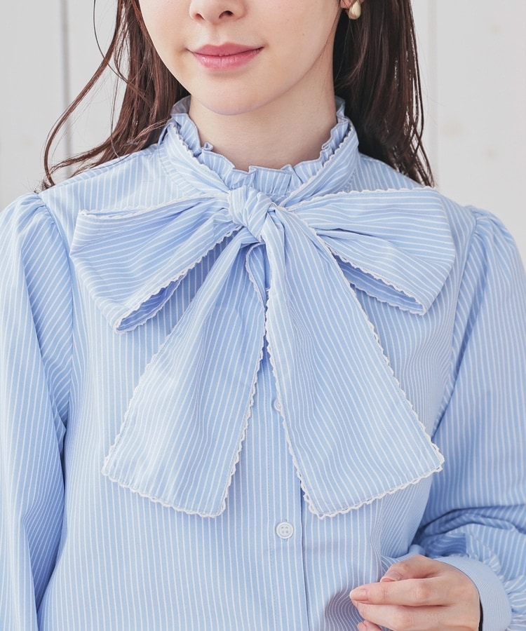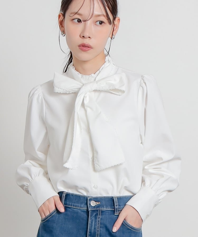 シンプルながらフェミニンなスタンドフリルと華やかなレース付きのボウタイリボンが楽しめる、2Wayデザイン。