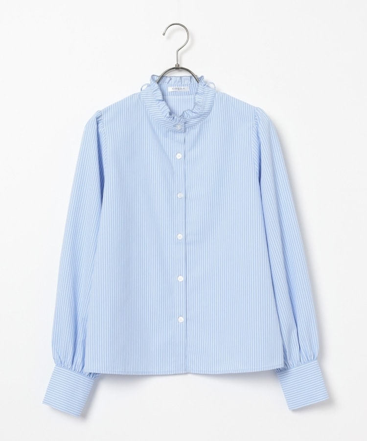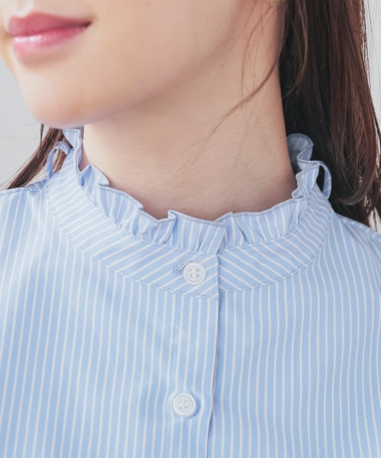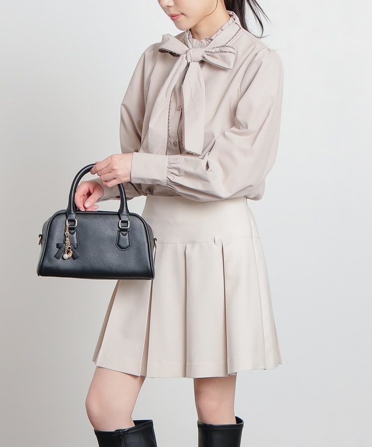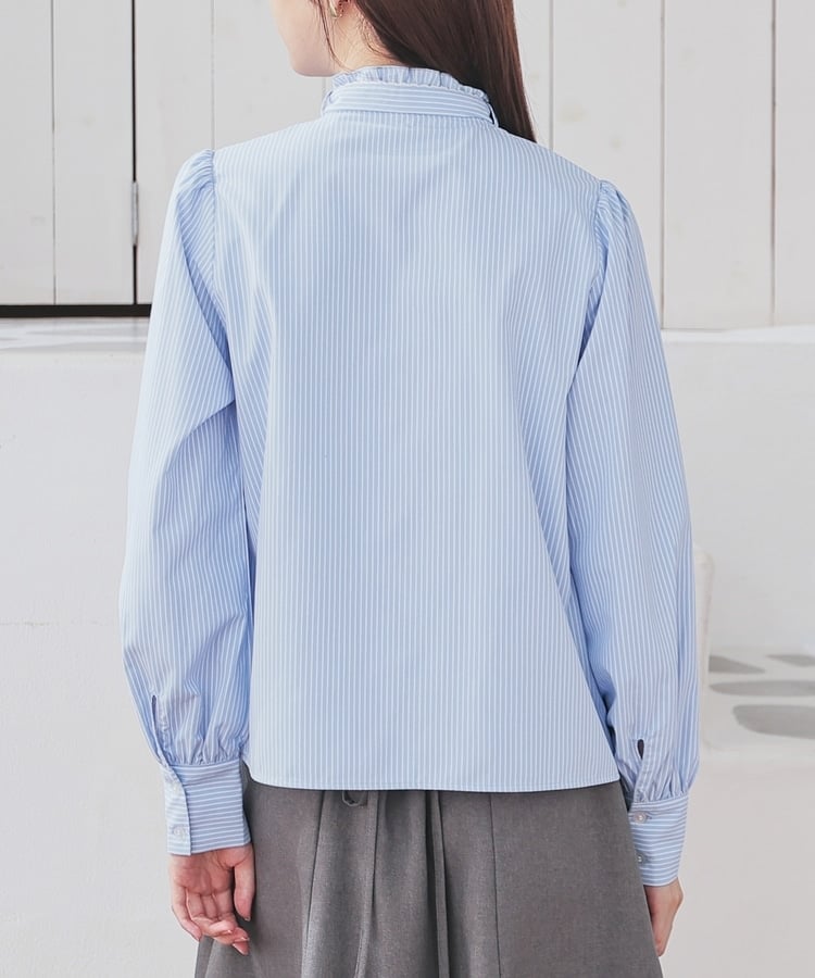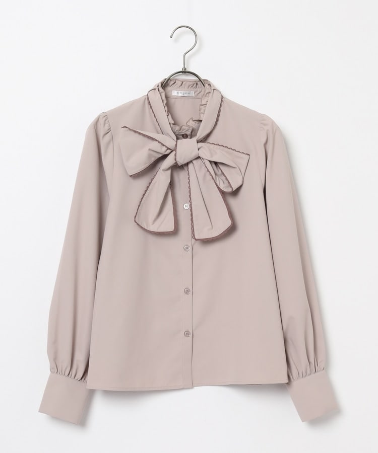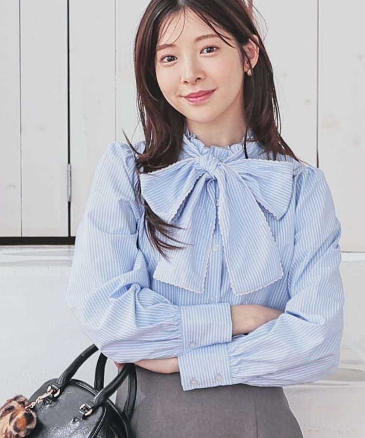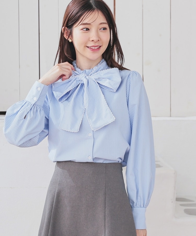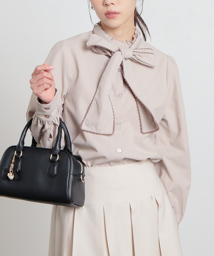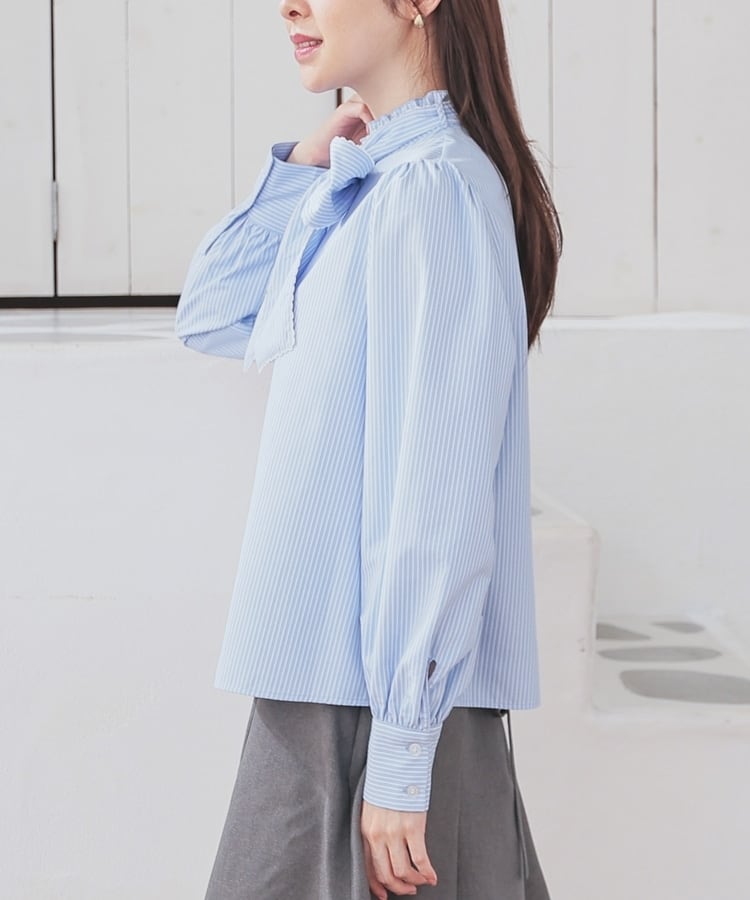 シンプルながらフェミニンなスタンドフリルと華やかなレース付きのボウタイリボンが楽しめる、2Wayデザイン。