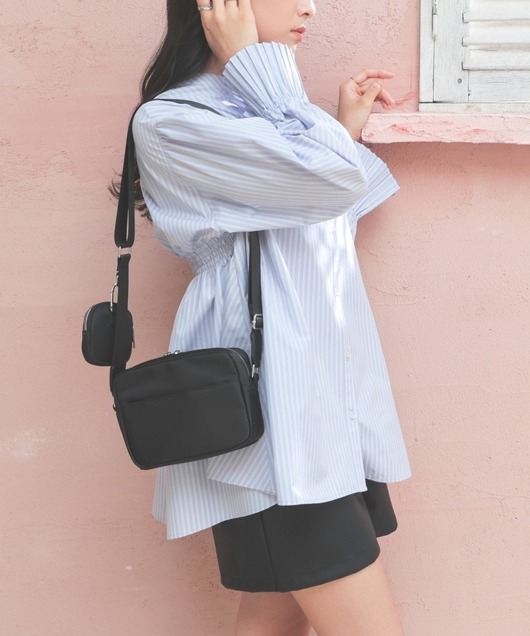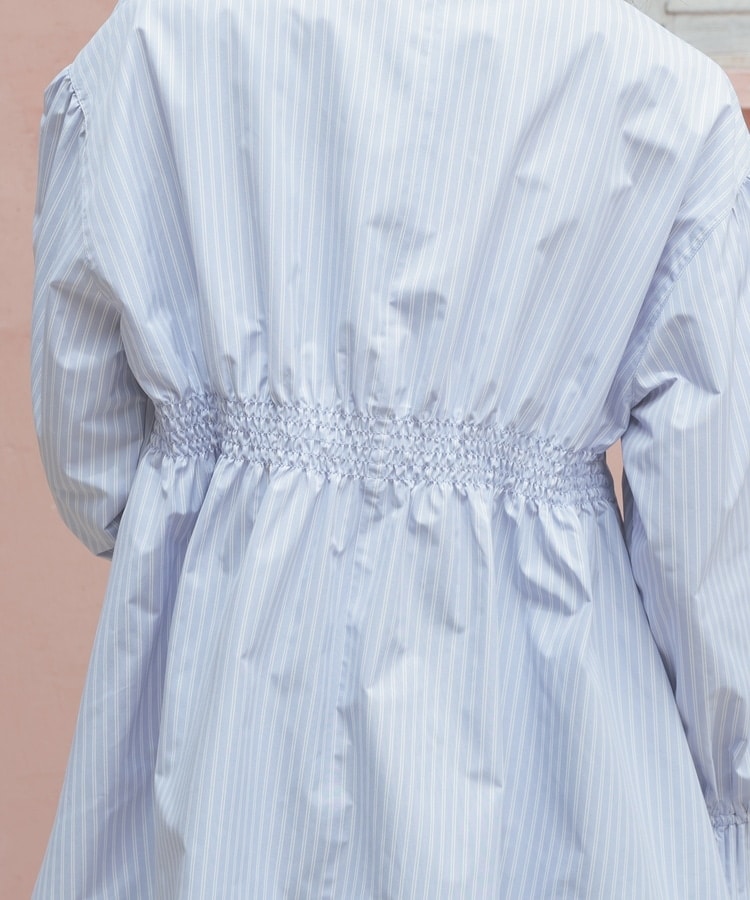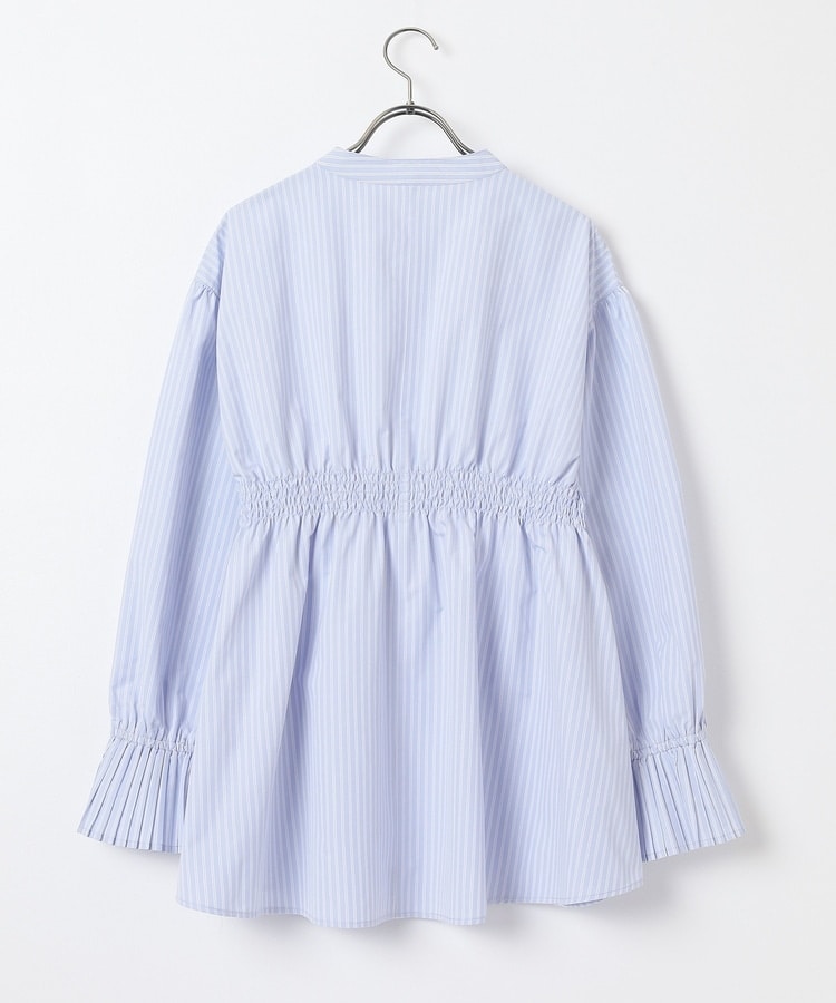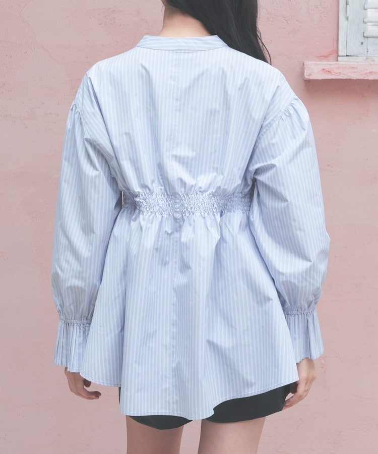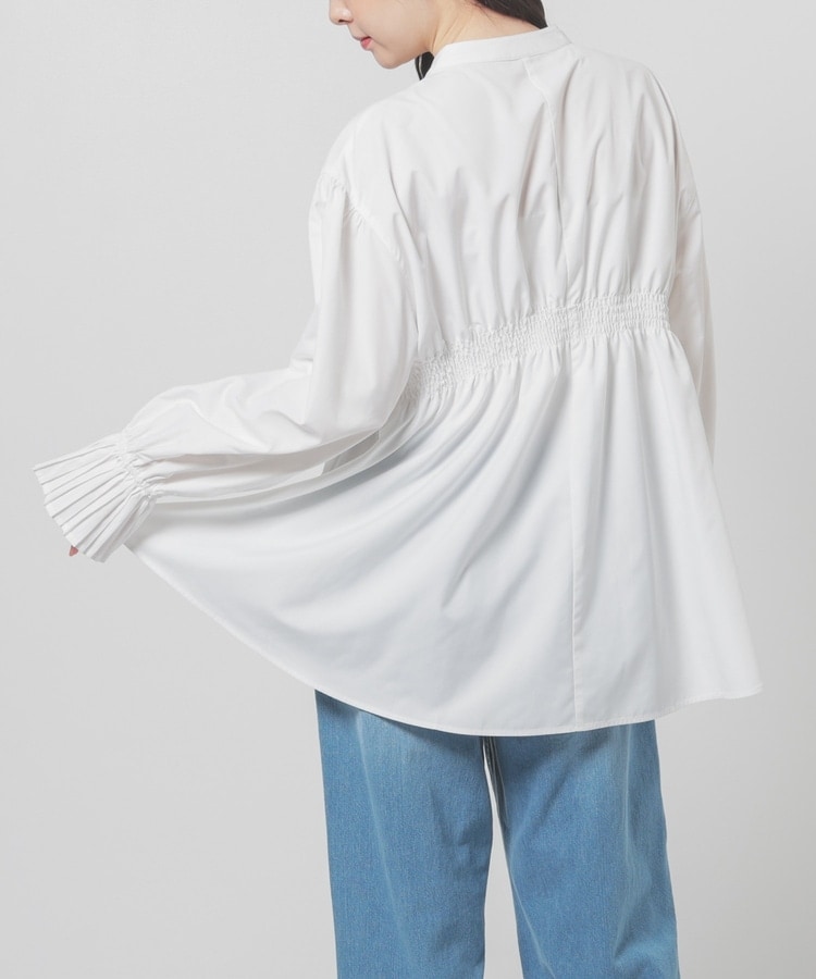 バックにたっぷりと入ったシャーリングギャザーが、立体的でフェミニンなシルエットを演出。