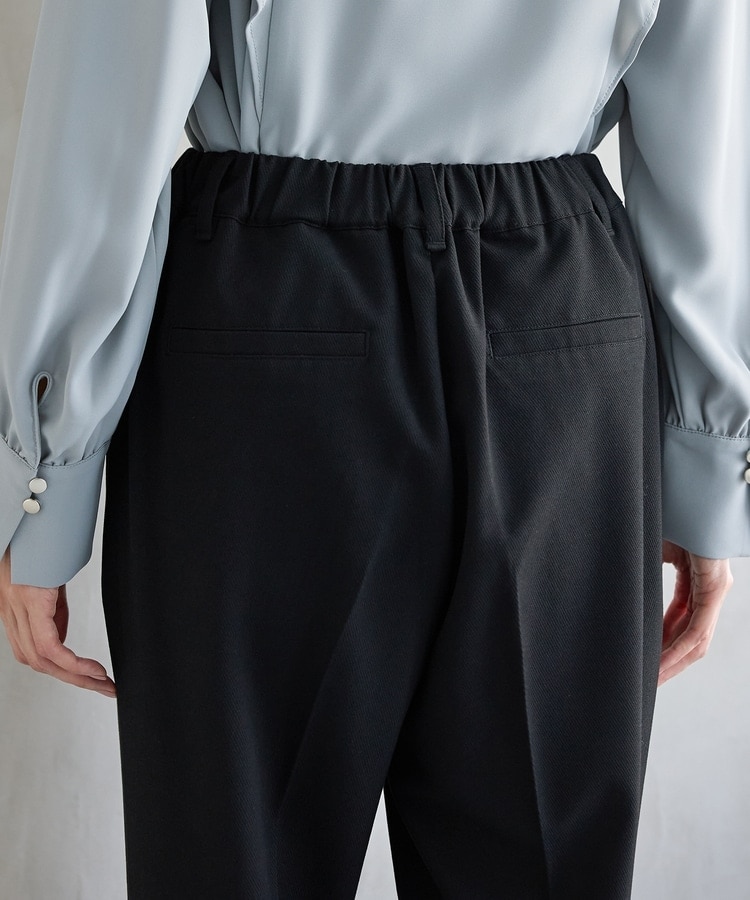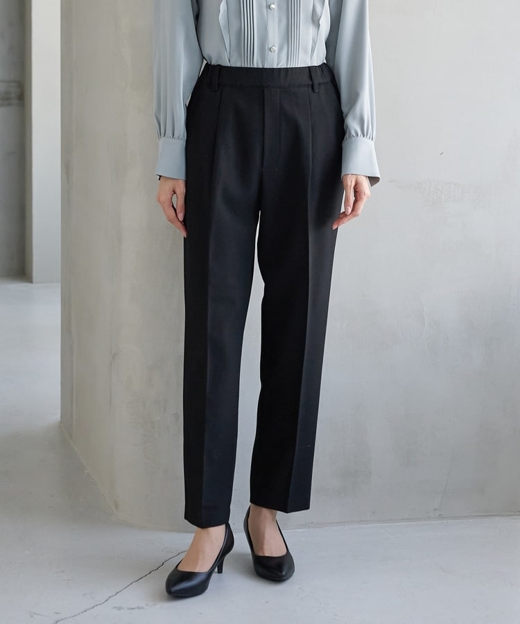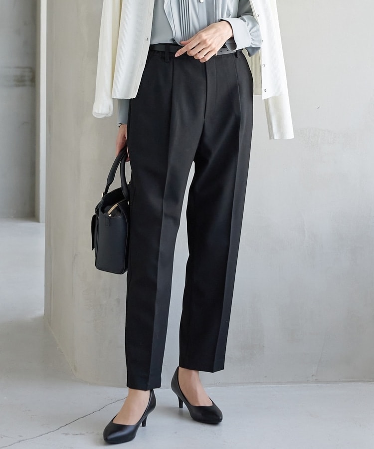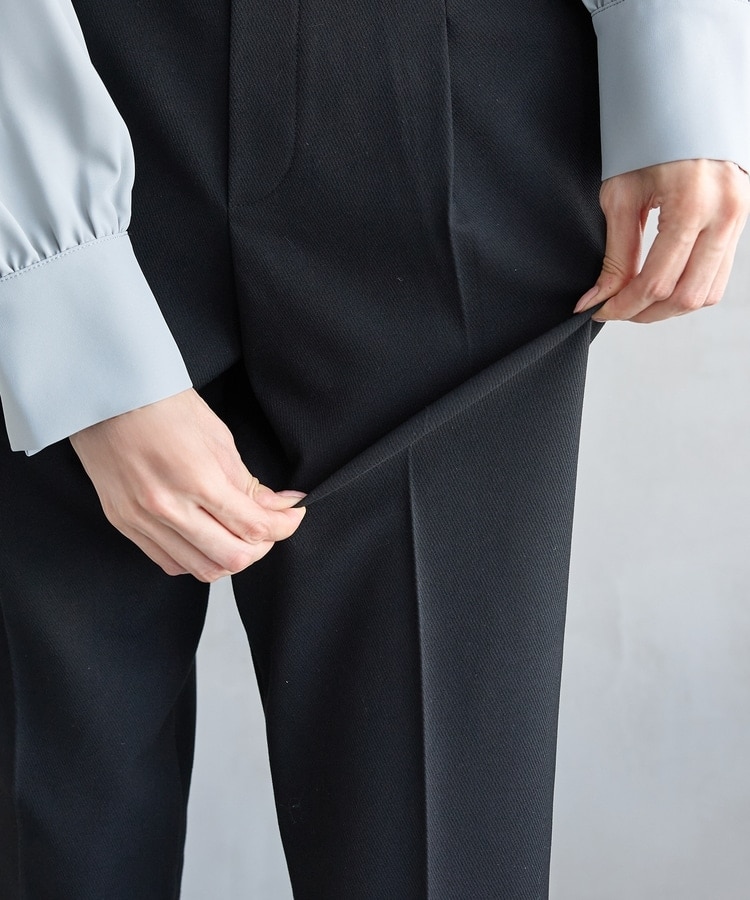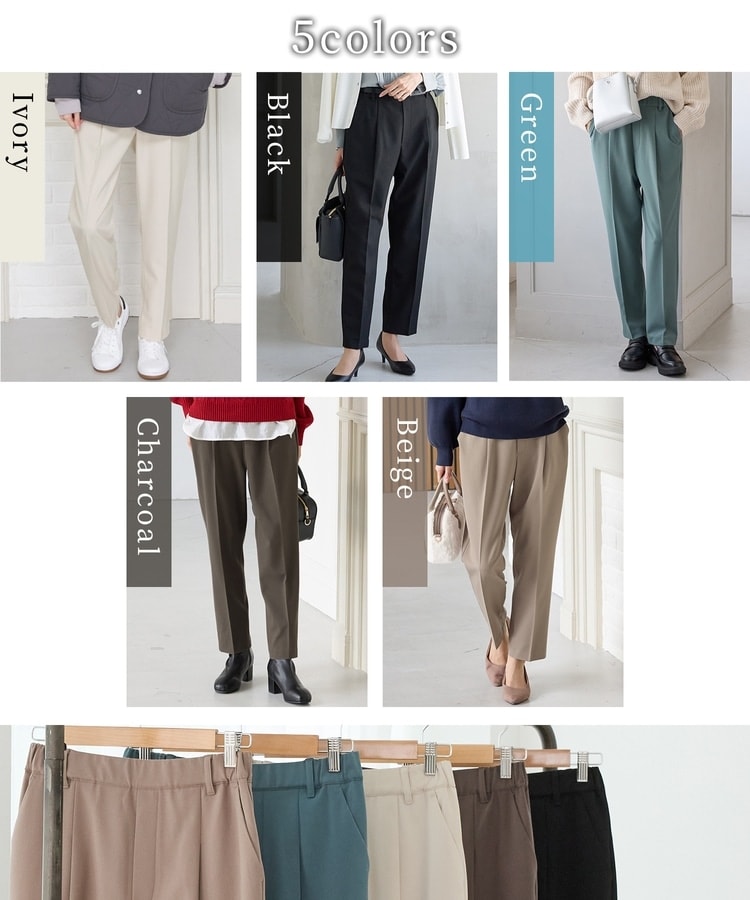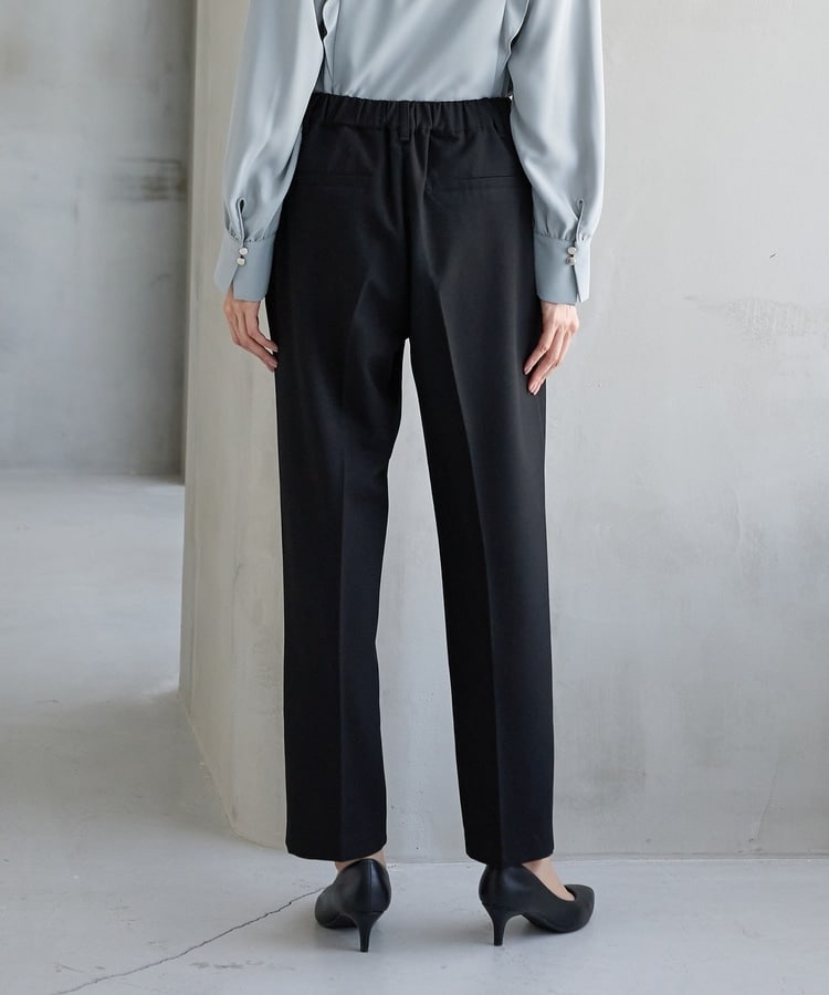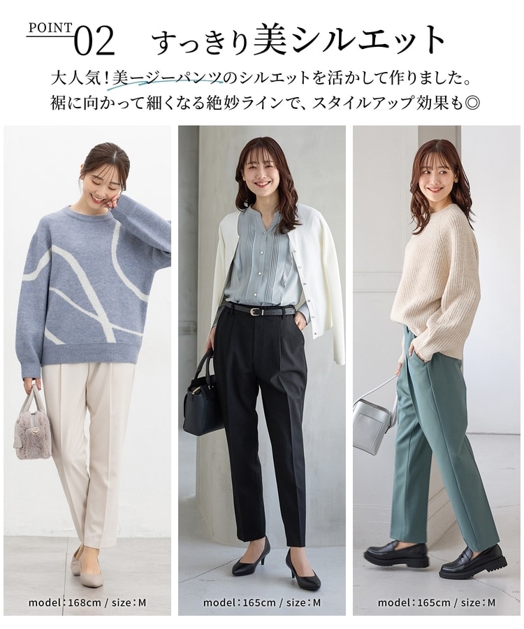 バックのフェイクポケットでヒップを高く見せ、きちんと感のあるセンタープレスと、腰回りのラインにこだわった、裾に向かって細くなる美しいシルエットで美脚効果も抜群。
