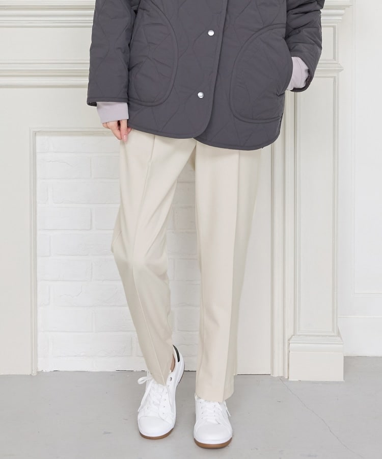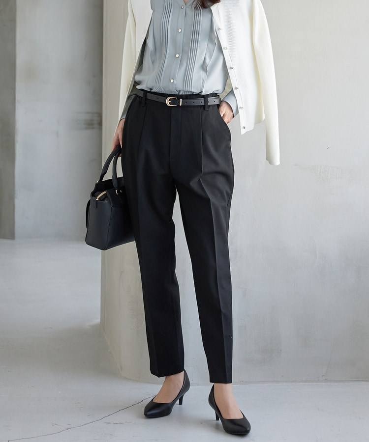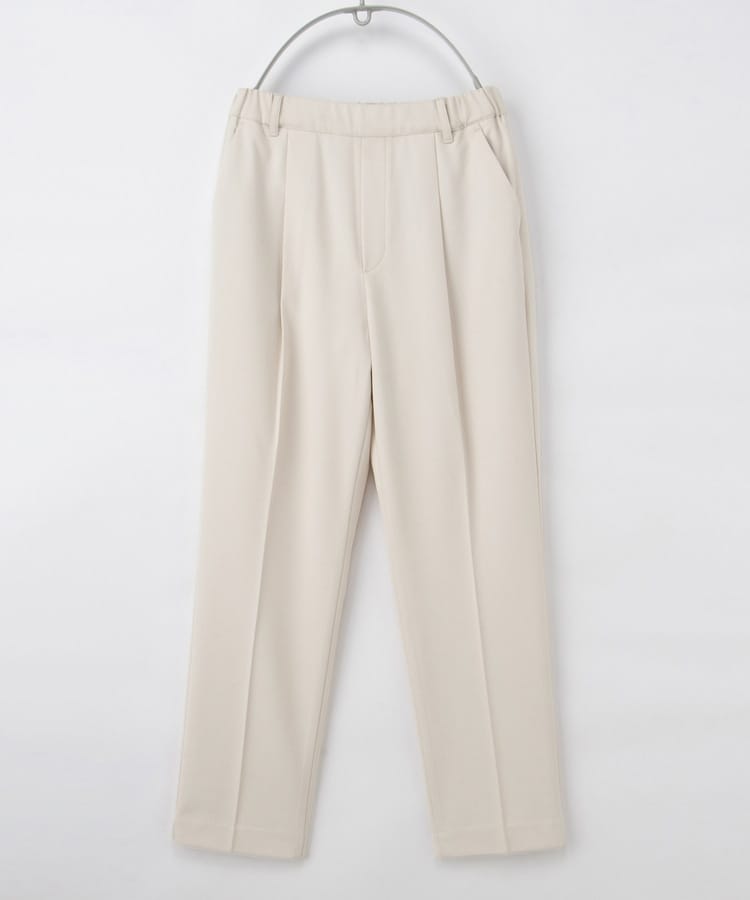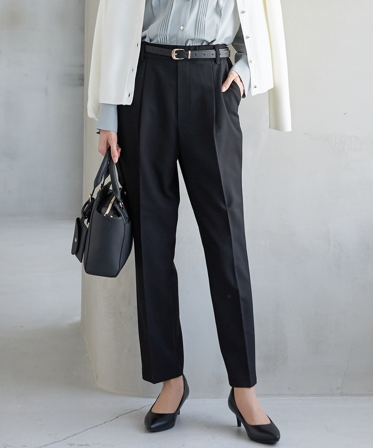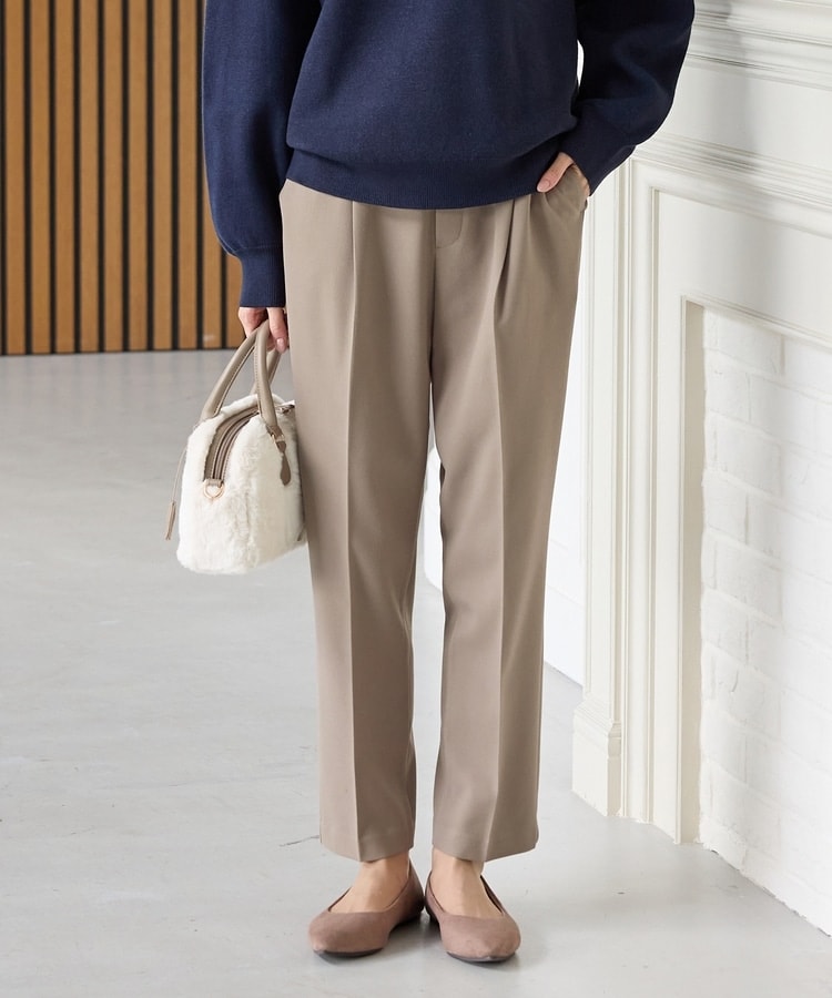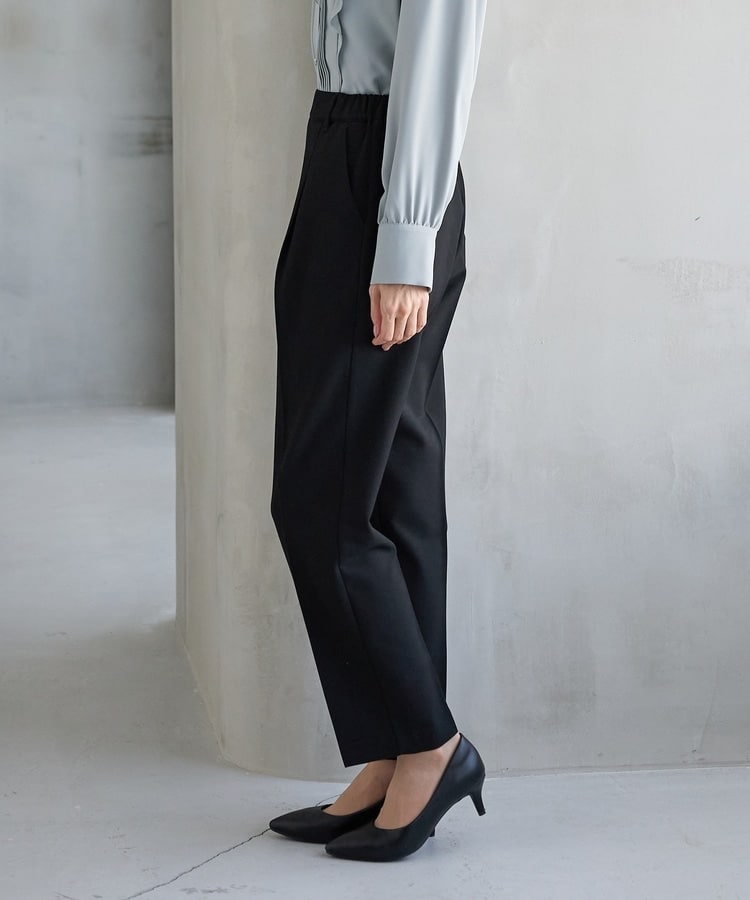バックのフェイクポケットでヒップを高く見せ、きちんと感のあるセンタープレスと、腰回りのラインにこだわった、裾に向かって細くなる美しいシルエットで美脚効果も抜群。