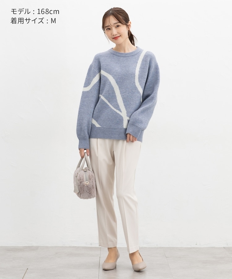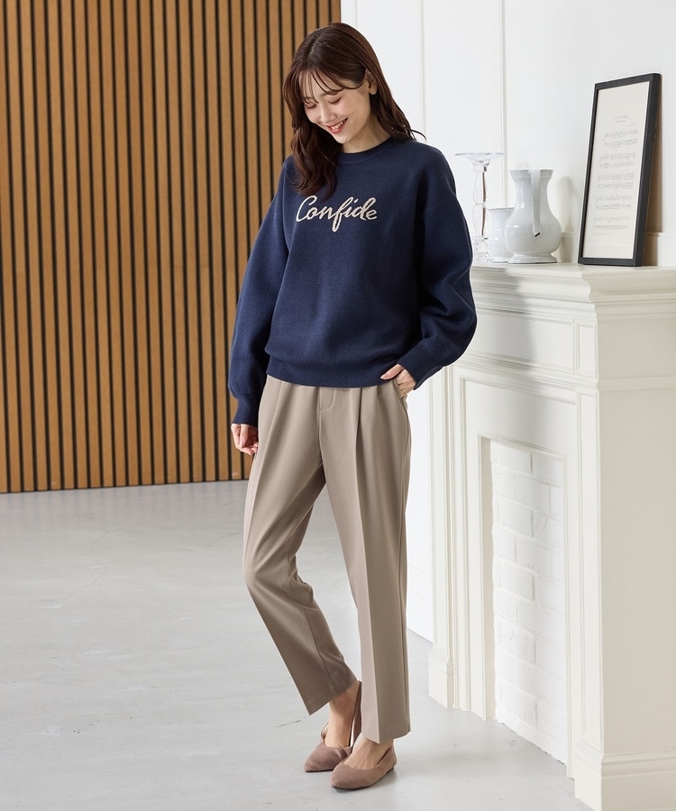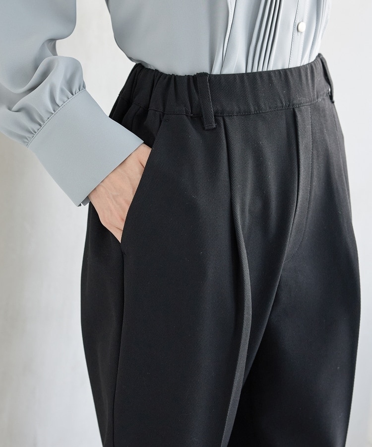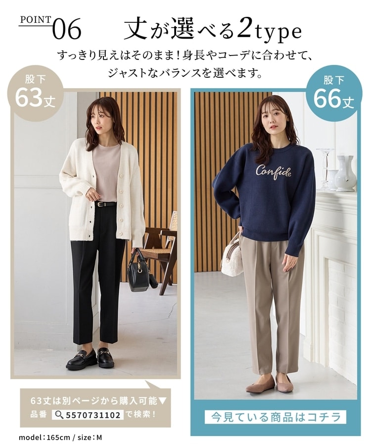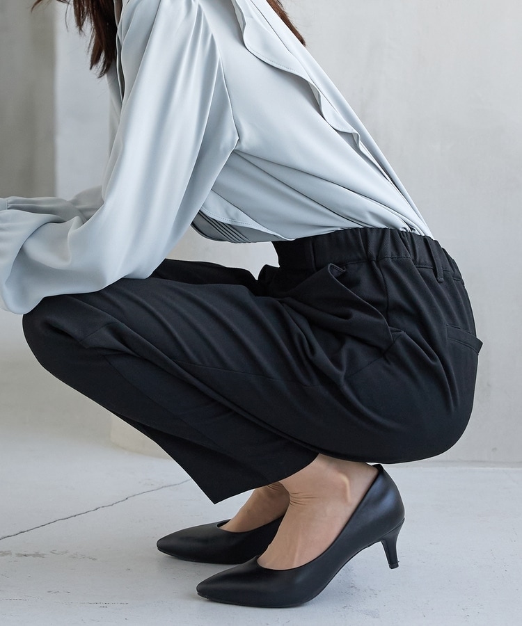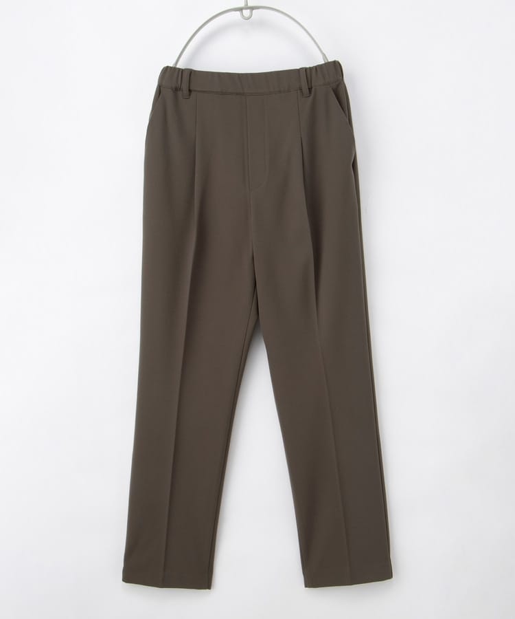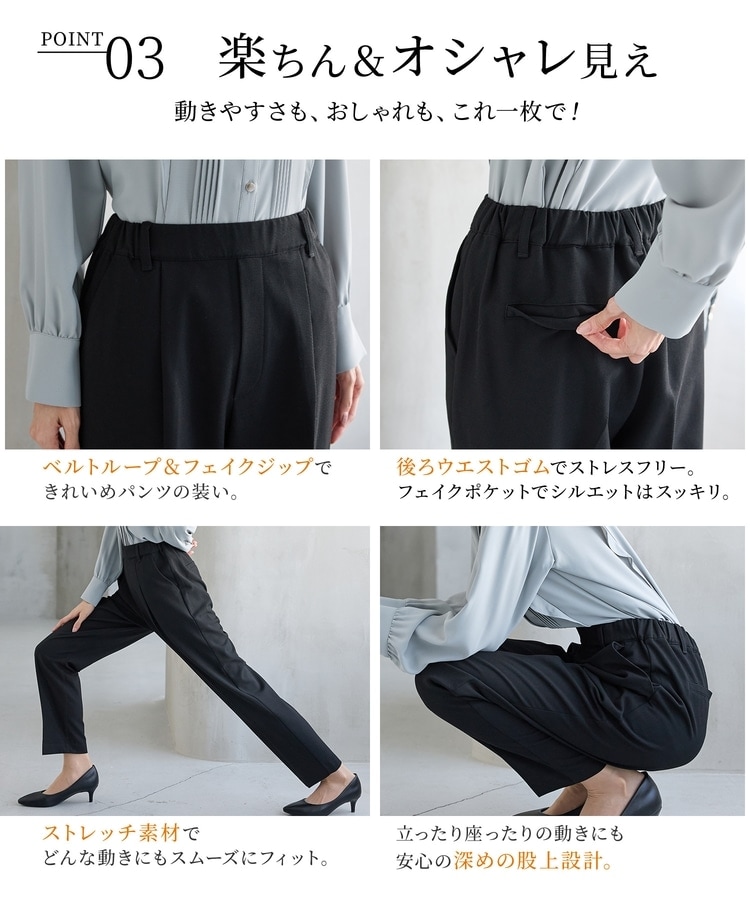 バックのフェイクポケットでヒップを高く見せ、きちんと感のあるセンタープレスと、腰回りのラインにこだわった、裾に向かって細くなる美しいシルエットで美脚効果も抜群。