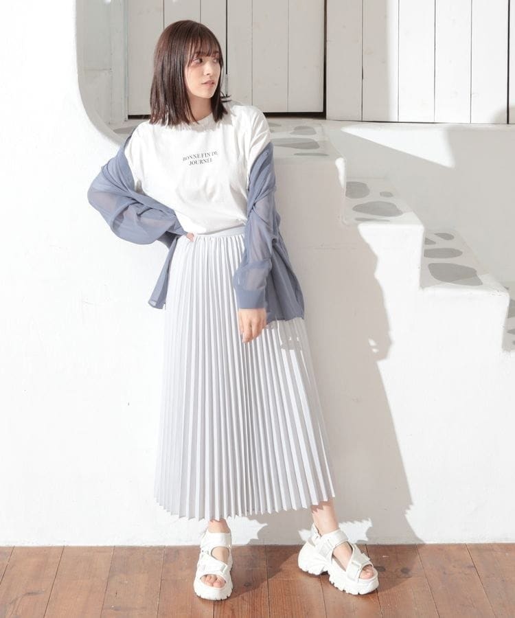ロックTシャツなどカジュアルなアイテムと合わせると今年らしいMIXスタイルに。