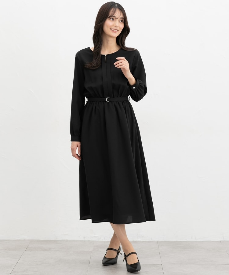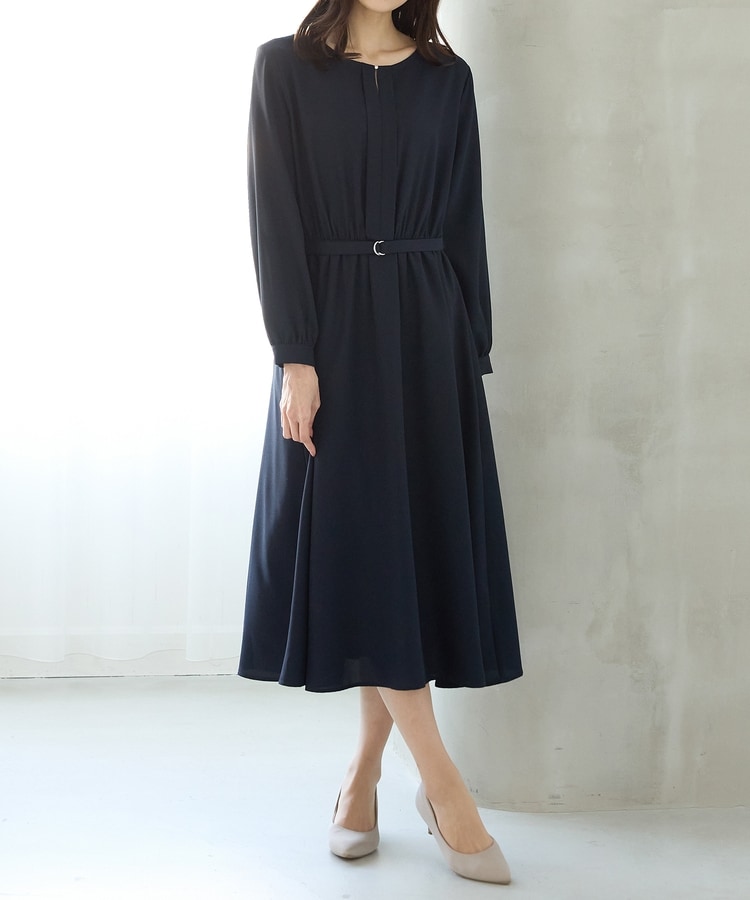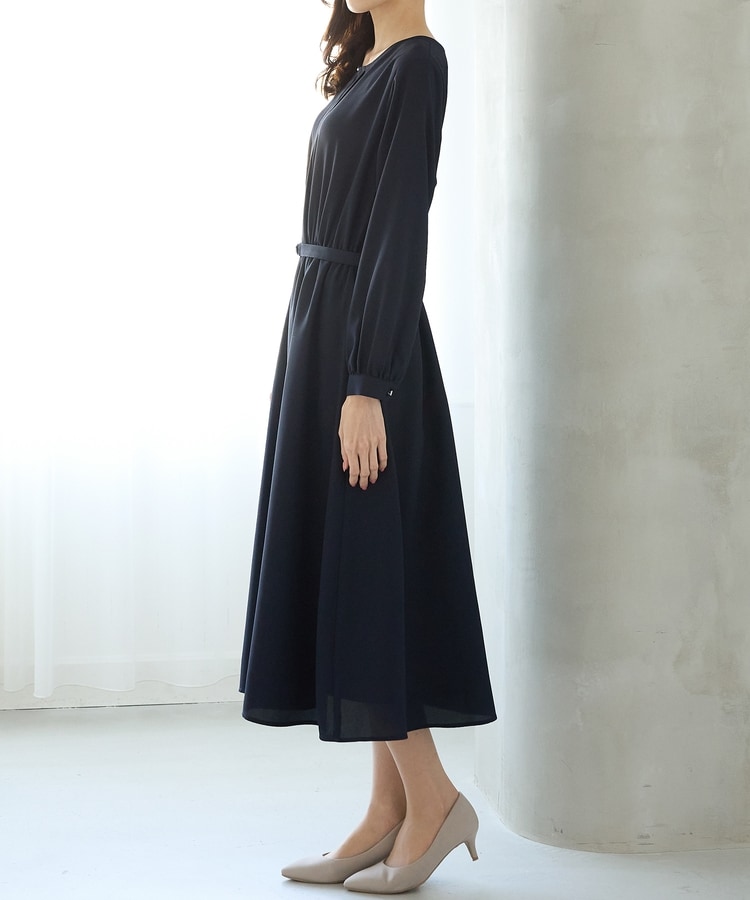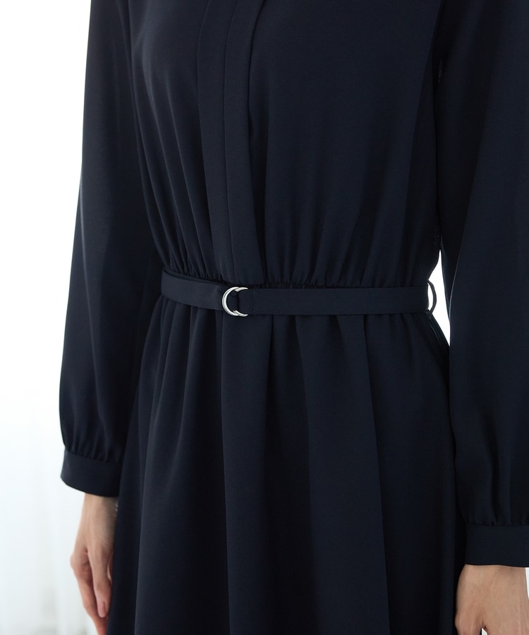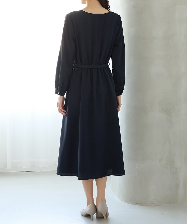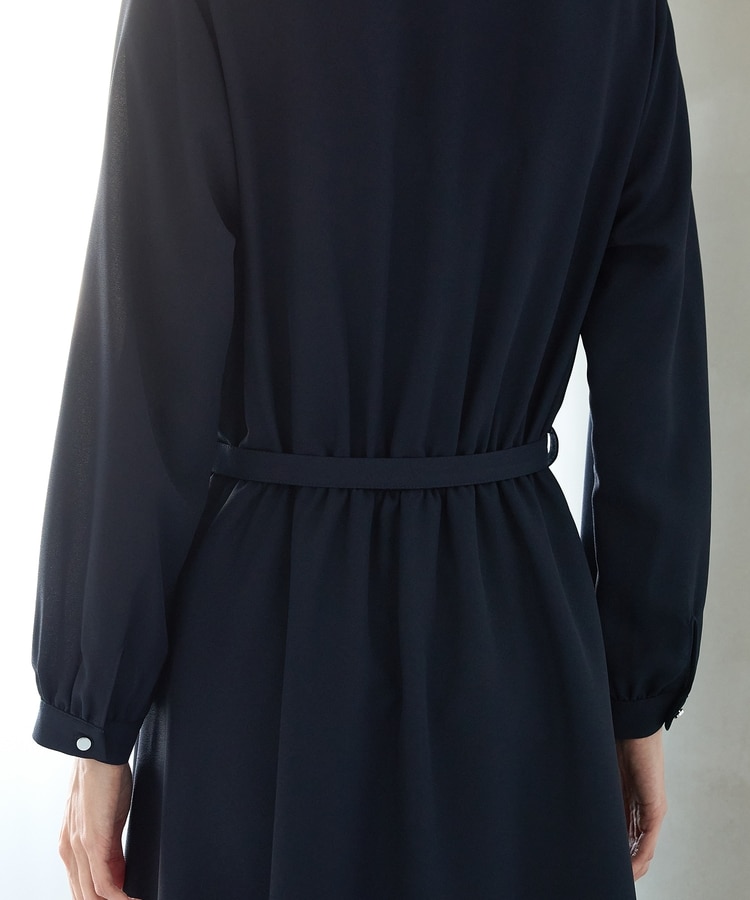 付属の共布ベルトでウエストマークすればスタイルアップ効果も◎