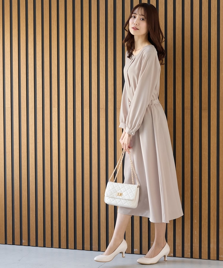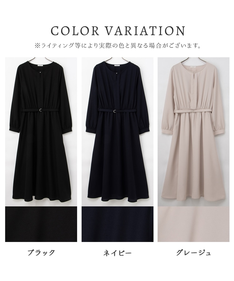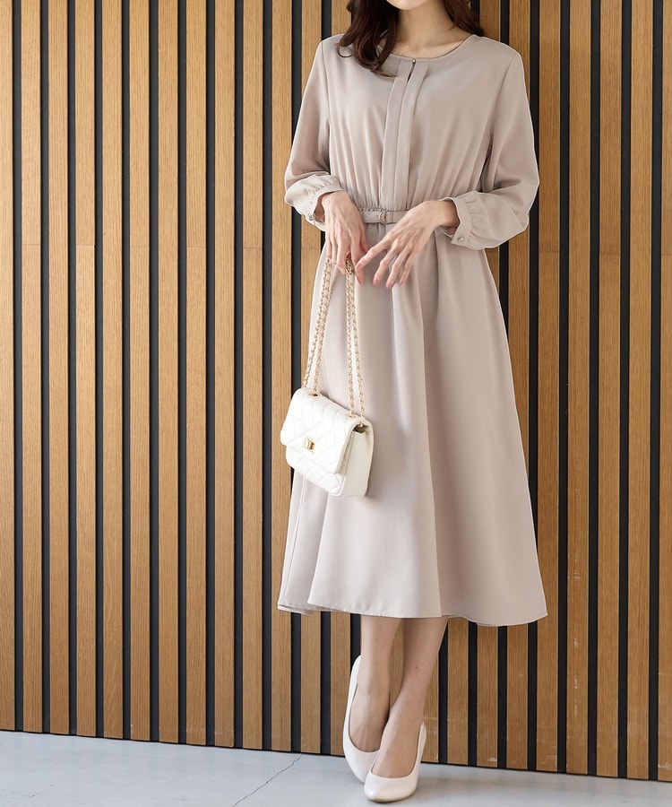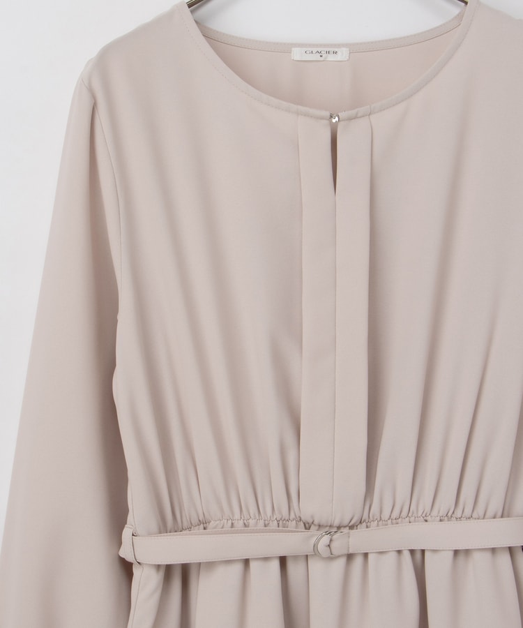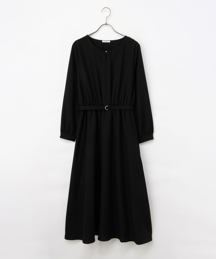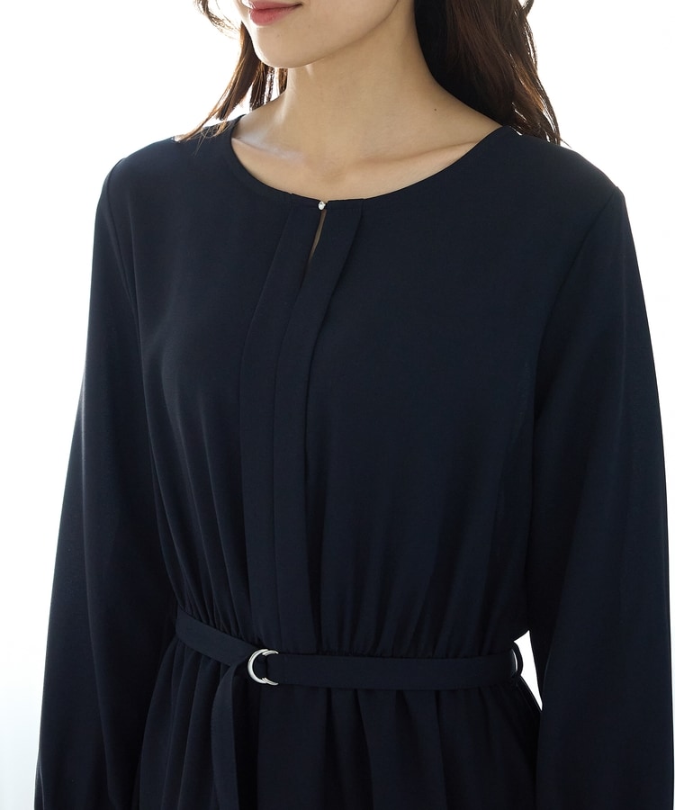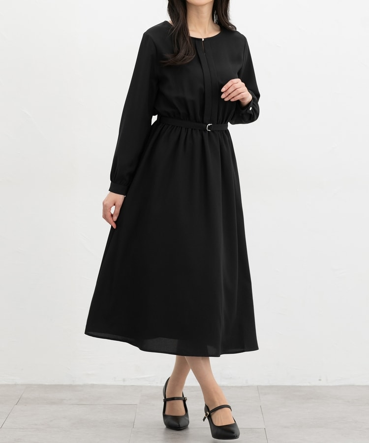 付属の共布ベルトでウエストマークすればスタイルアップ効果も◎