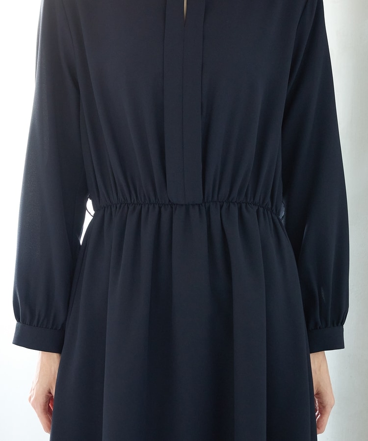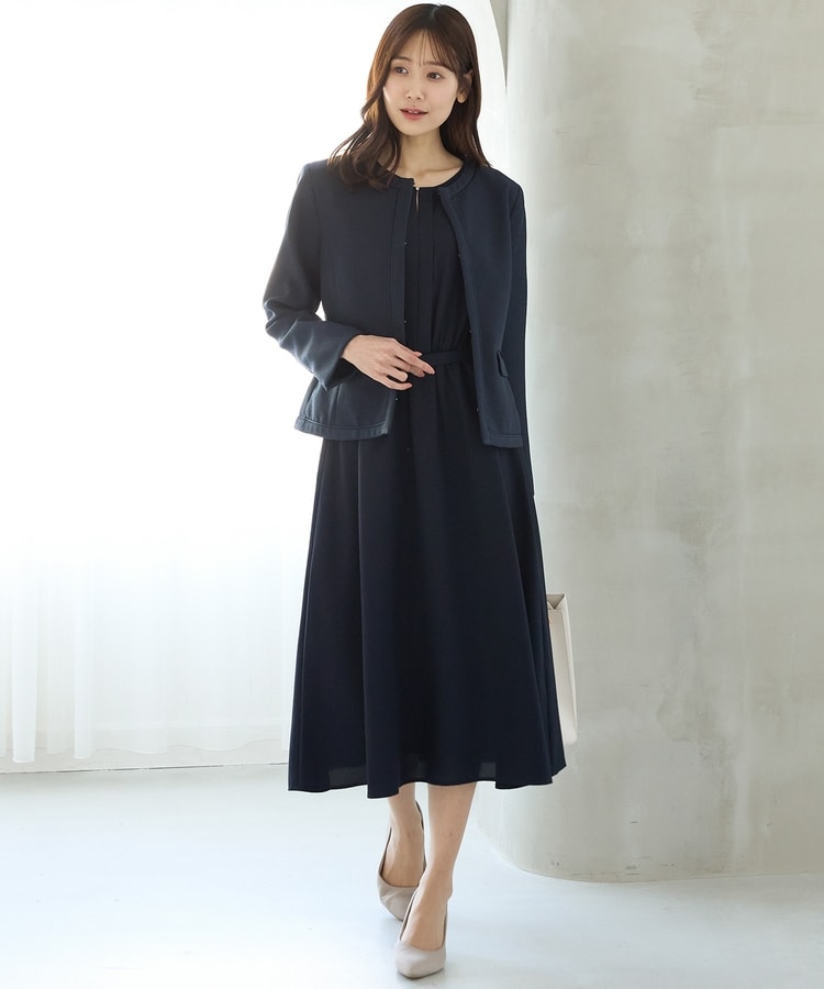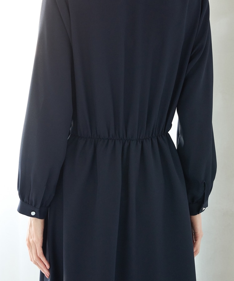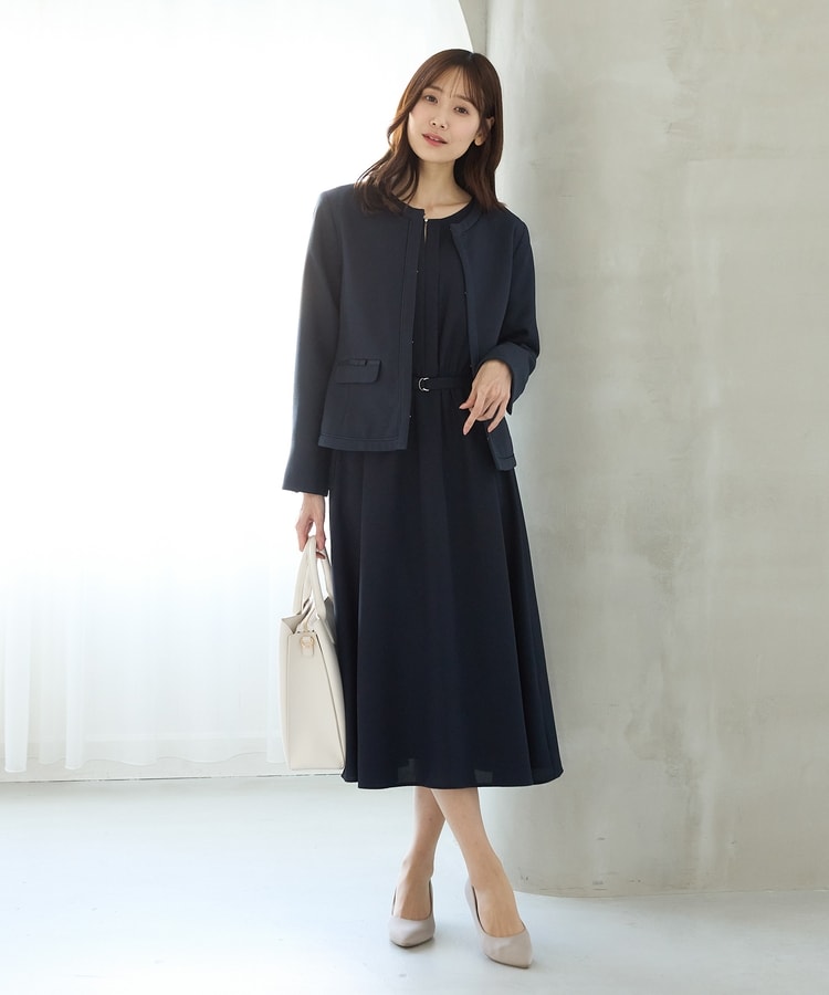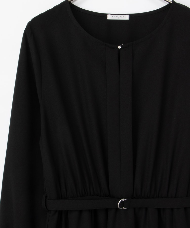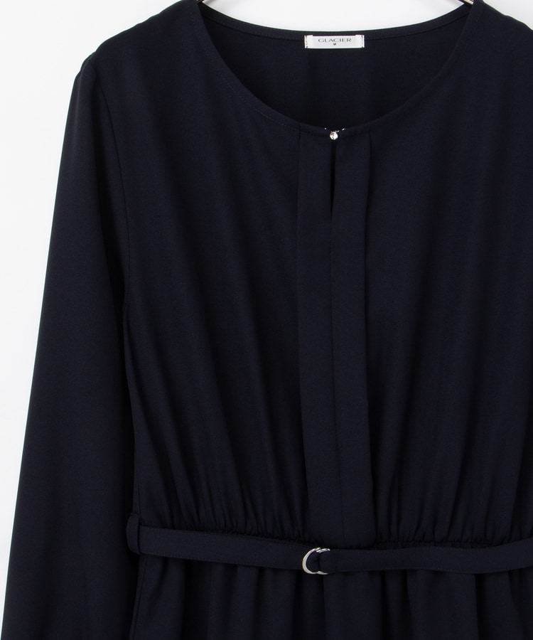 付属の共布ベルトでウエストマークすればスタイルアップ効果も◎