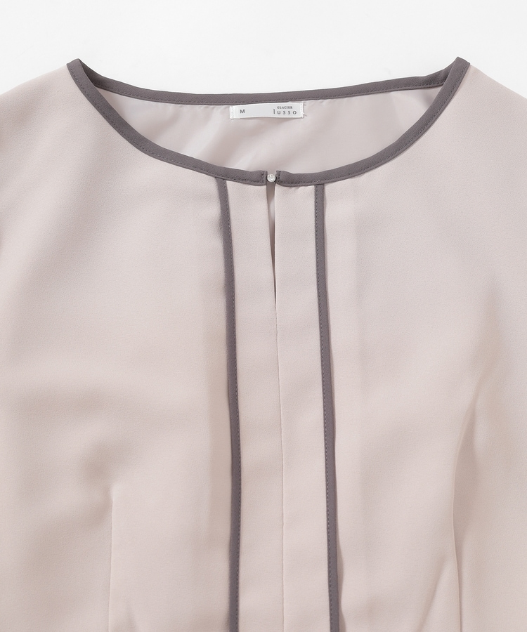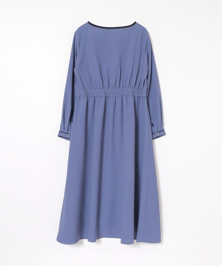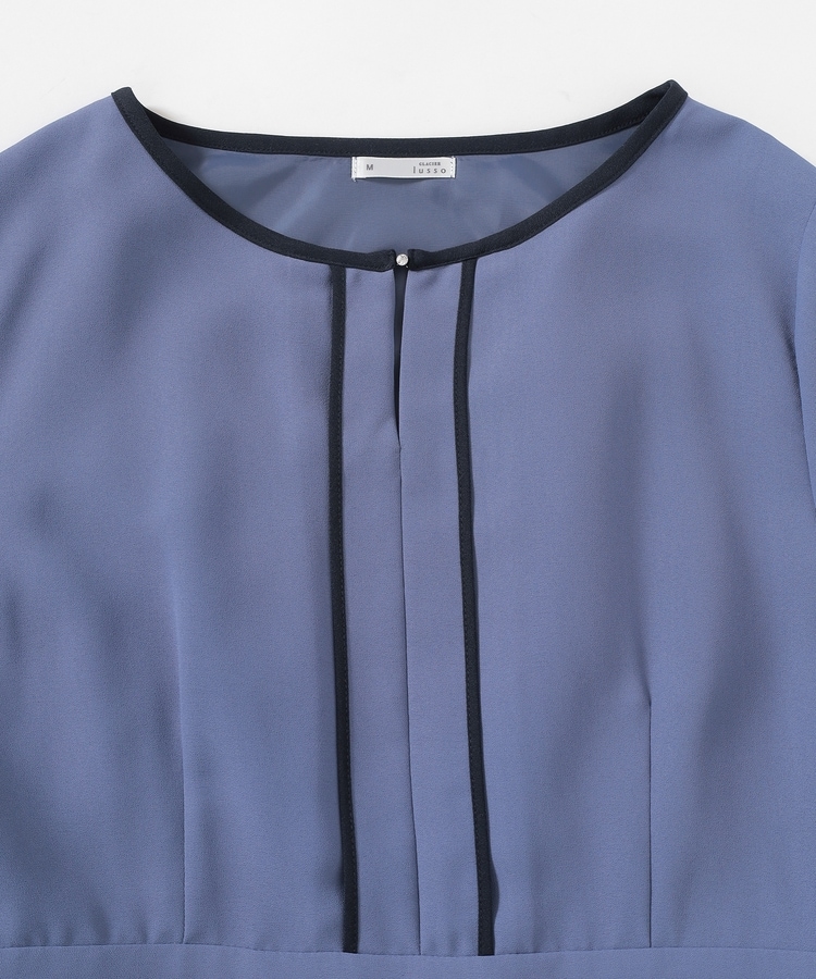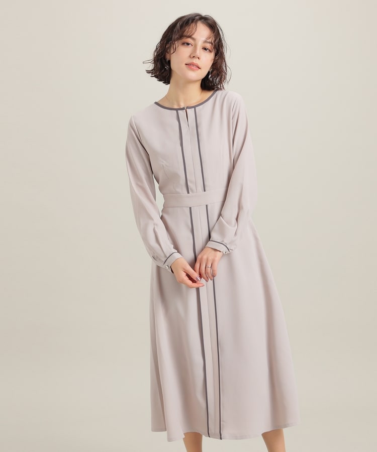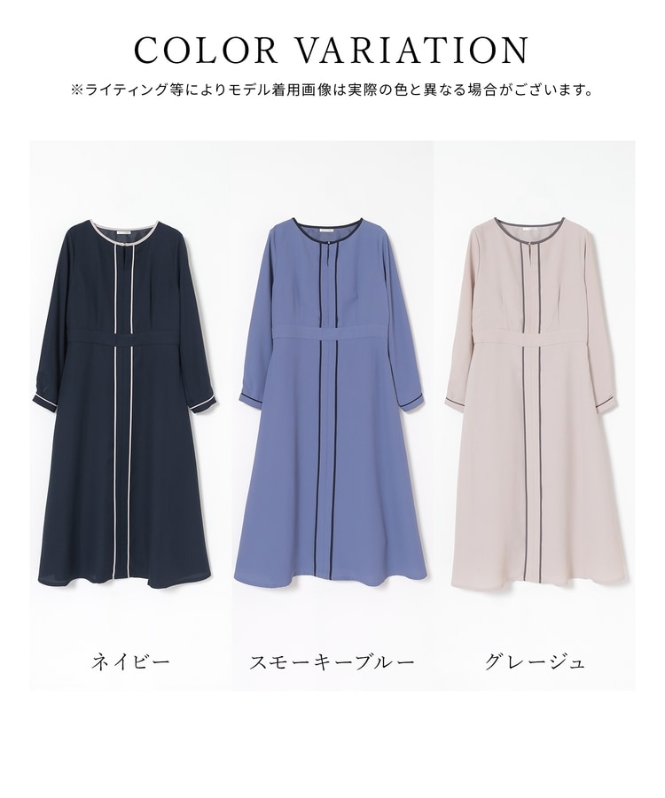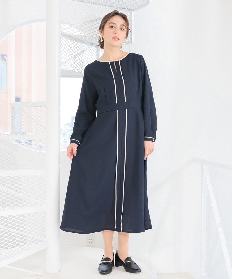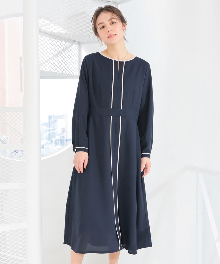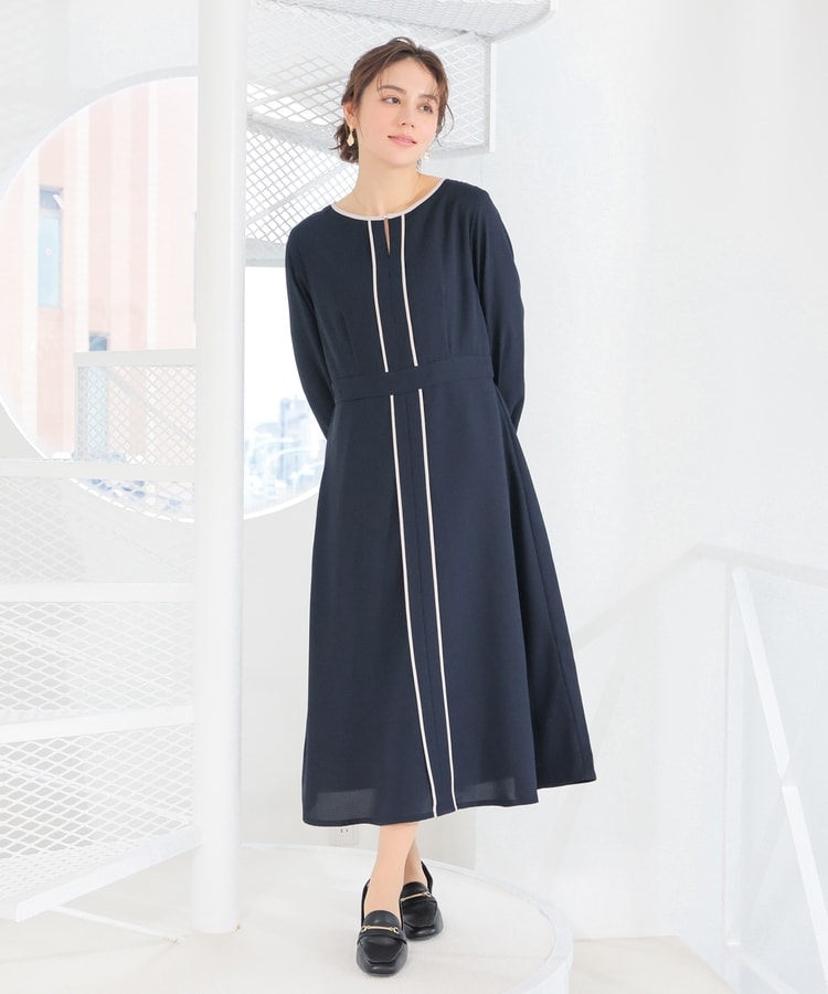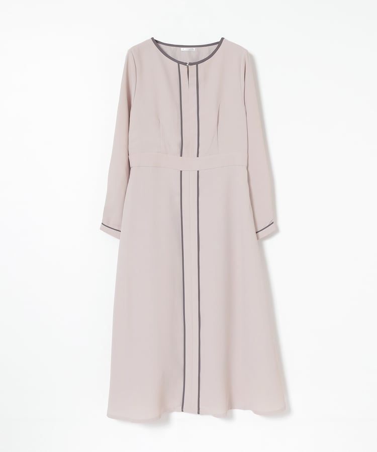 きれいなフレアシルエットとクルーネックのシンプルなデザインに配色パイピングをプラスして、すっきりとした印象に。