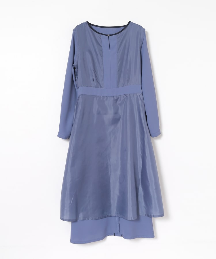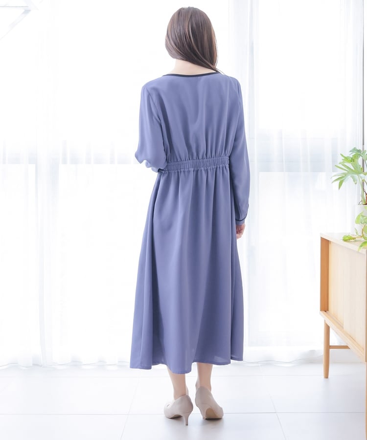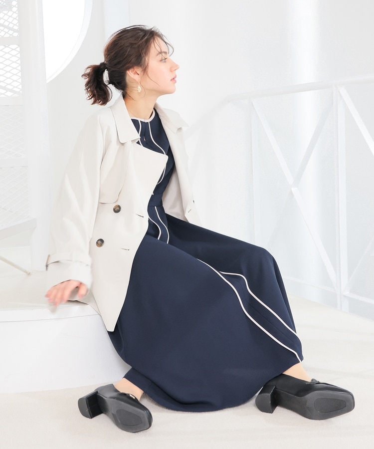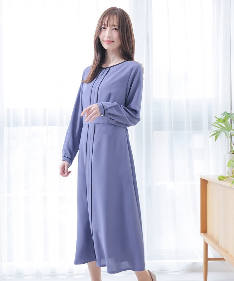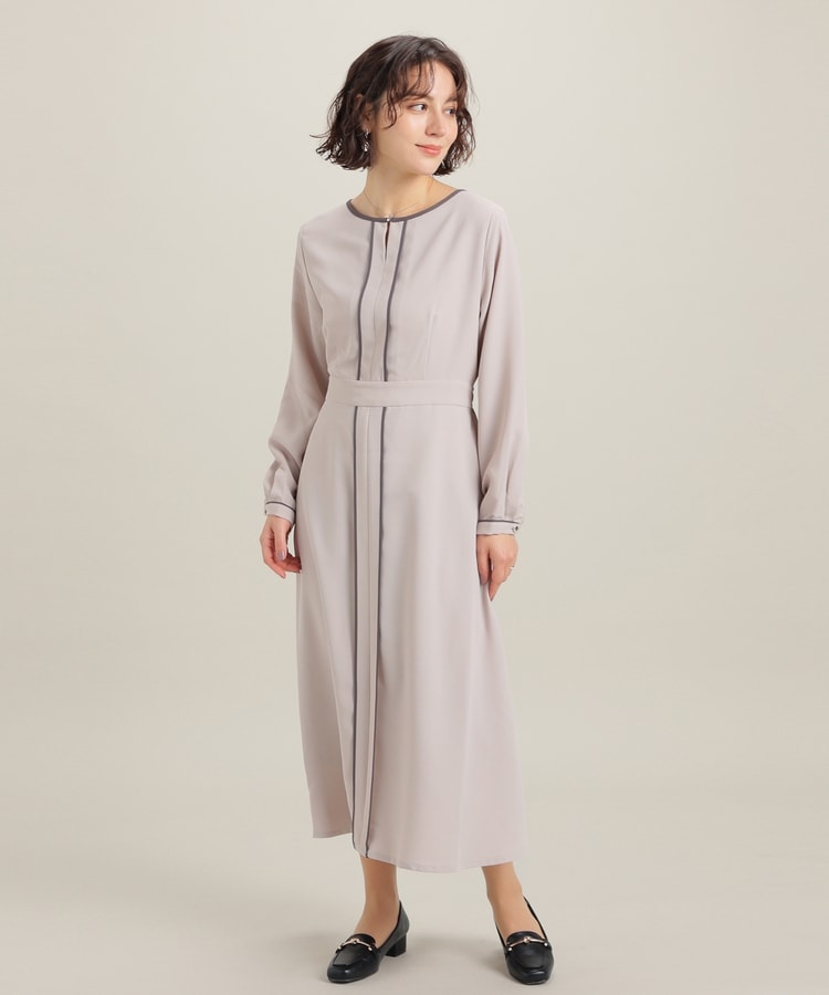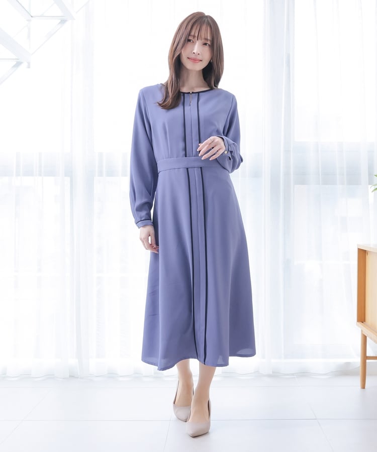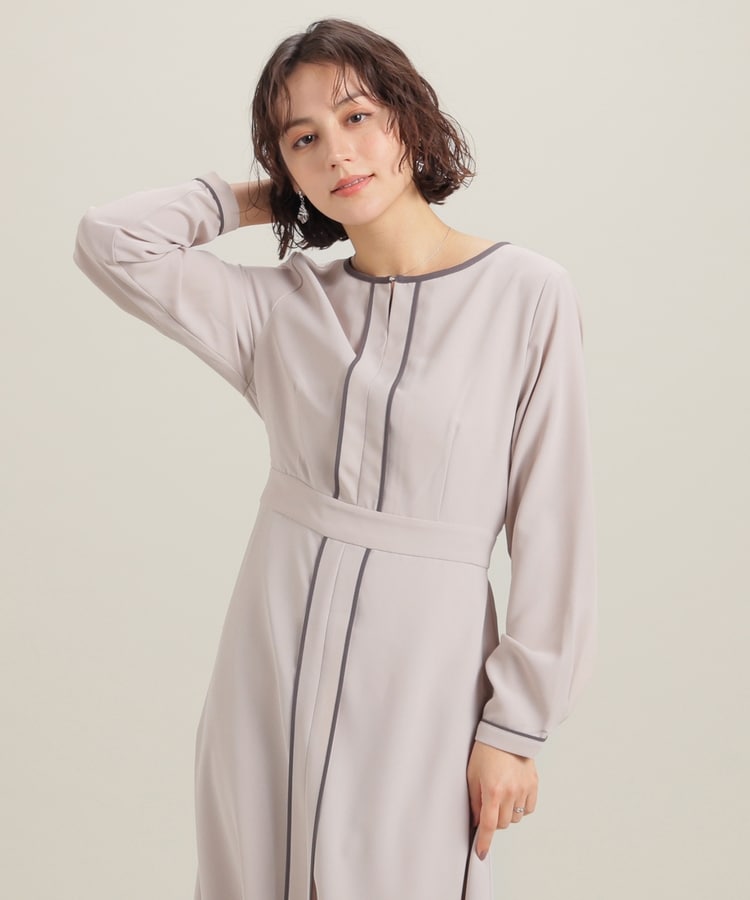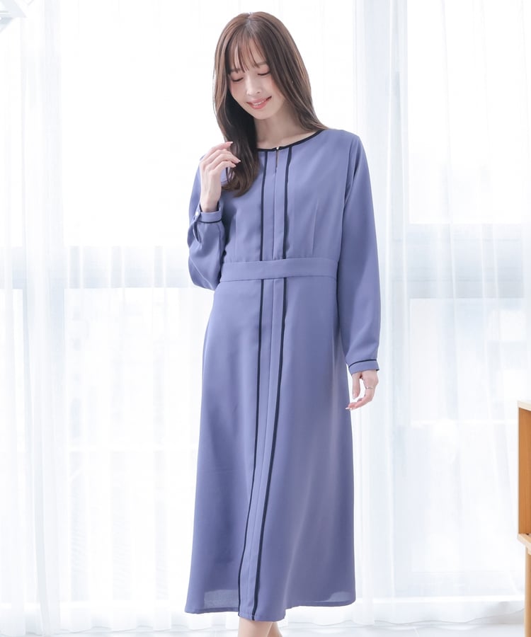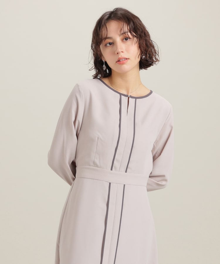 きれいなフレアシルエットとクルーネックのシンプルなデザインに配色パイピングをプラスして、すっきりとした印象に。