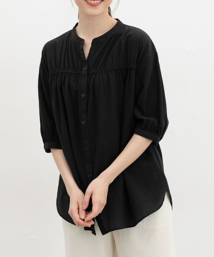 首元がすっきり見える、スキッパータイプのマオカラー。