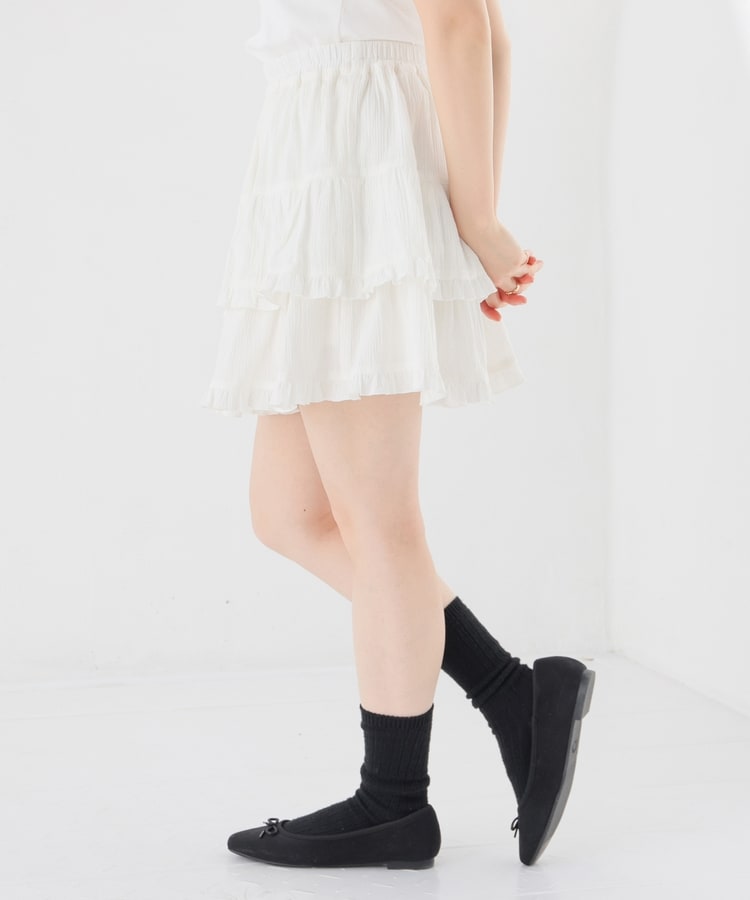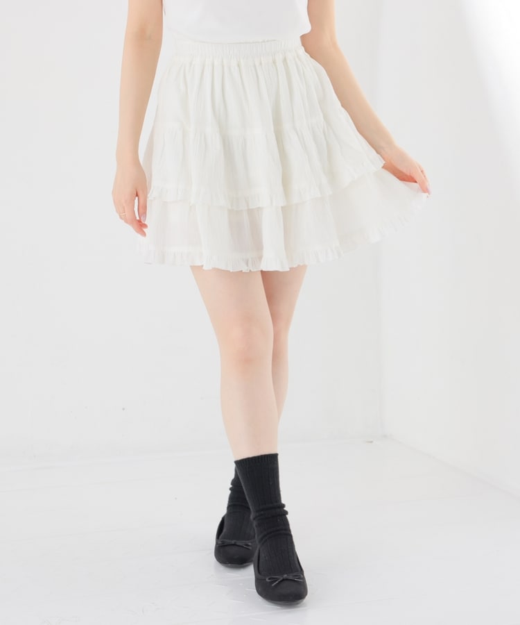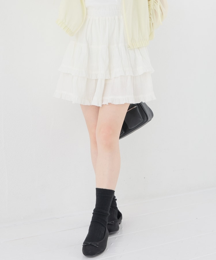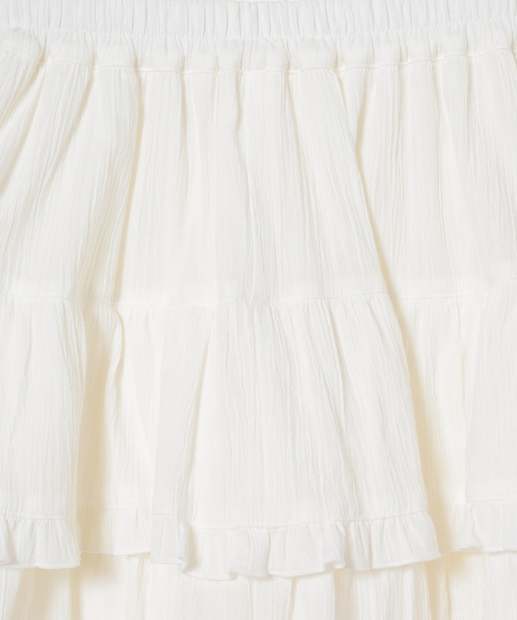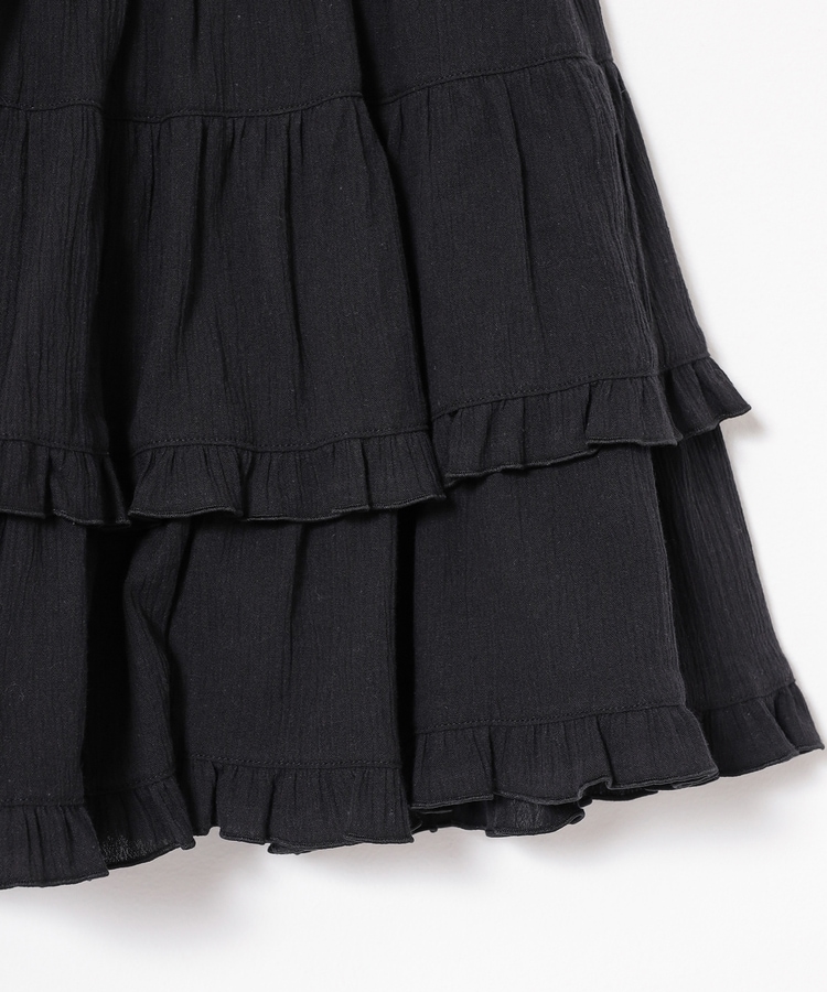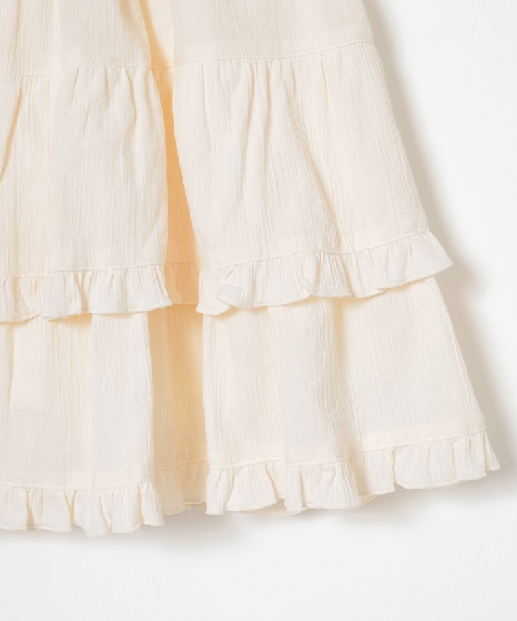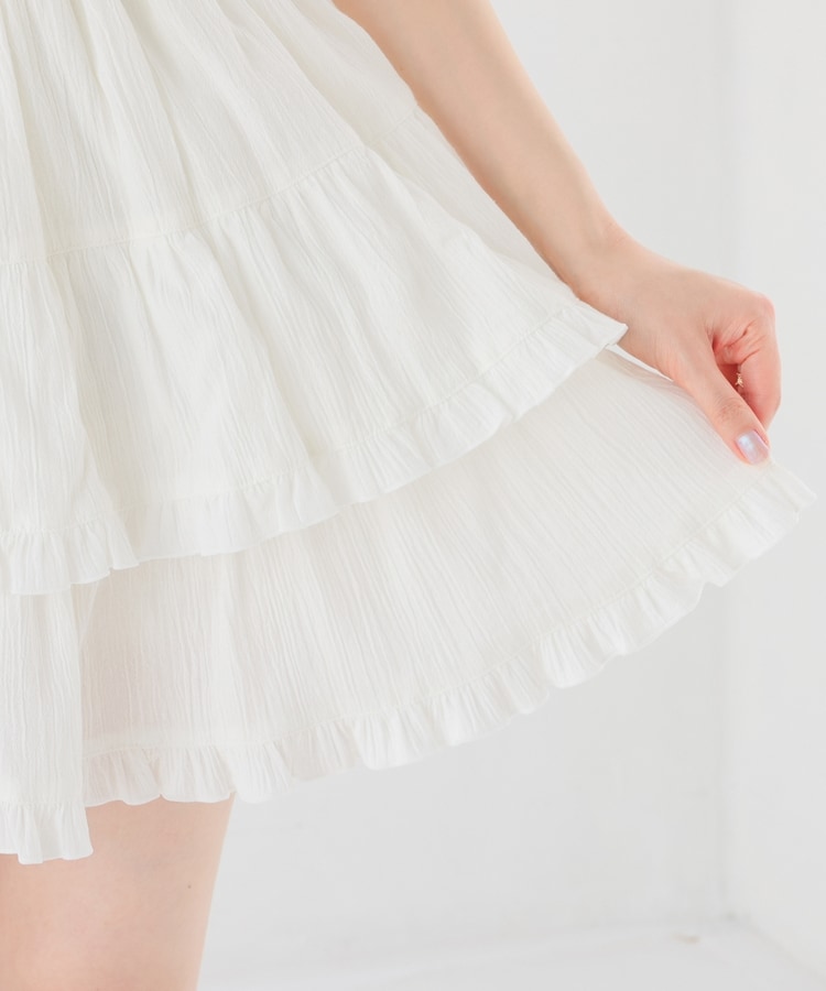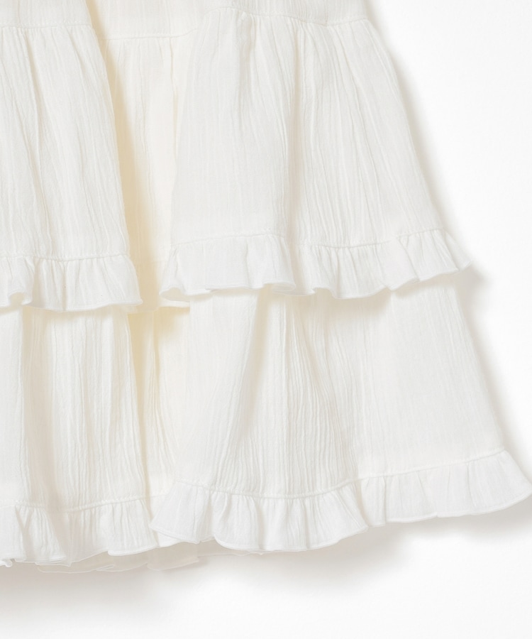 フリル付きの三段ティアードが動くたびにひらひらと揺れる、フェミニンで華やかなデザイン。